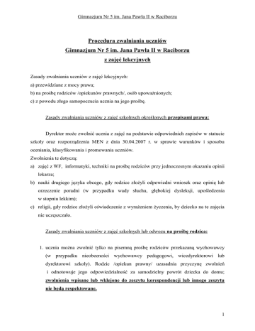 Gimnazjum Nr 5 im. Jana Pawła II w Raciborzu Procedura zwalniania uczniów Gimnazjum Nr 5 im. Jana Pawła II w Raciborzu z zajęć lekcyjnych Zasady zwalniania uczniów z zajęć lekcyjnych: a) przewidziane z mocy prawa; b) na prośbę rodziców /opiekunów prawnych/, osób upoważnionych; c) z powodu złego samopoczucia ucznia na jego prośbę. Zasady zwalniania uczniów z zajęć szkolnych określonych przepisami prawa: Dyrektor może zwolnić ucznia z zajęć na podstawie odpowiednich zapisów w statucie szkoły oraz rozporządzenia MEN z dnia 30.04.2007 r. w sprawie warunków i sposobu oceniania, klasyfikowania i promowania uczniów. Zwolnienia te dotyczą: a) zajęć z WF, informatyki, techniki na prośbę rodziców przy jednoczesnym okazaniu opinii lekarza; b) nauki drugiego języka obcego, gdy rodzice złożyli odpowiedni wniosek oraz opinię lub orzeczenie poradni (w przypadku wady słuchu, głębokiej dysleksji, upośledzenia w stopniu lekkim); c) religii, gdy rodzice złożyli oświadczenie z wyrażeniem życzenia, by dziecko na te zajęcia nie uczęszczało. Zasady zwalniania uczniów z zajęć szkolnych lub odwozu na prośbę rodzica: 1. ucznia można zwolnić tylko na pisemną prośbę rodziców przekazaną wychowawcy (w przypadku nieobecności wychowawcy pedagogowi, wicedyrektorowi lub dyrektorowi szkoły). Rodzic /opiekun prawny/ uzasadnia przyczynę zwolnień i odnotowuje jego odpowiedzialność za samodzielny powrót dziecka do domu; zwolnienia wpisane lub wklejone do zeszytu korespondencji lub innego zeszytu nie będą respektowane. 1 Gimnazjum Nr 5 im. Jana Pawła II w Raciborzu 2. prośbę o zwolnienie uczeń powinien pokazać wychowawcy zaraz po przyjściu do szkoły; 3. wychowawca podejmuje decyzję o zwolnieniu lub może odmówić zwolnienia, jeżeli: - uzna, że uczeń sam napisał prośbę i sfałszował podpis; - jeżeli w tym dniu zaplanowane są prace pisemne; - w dniu zapowiedzianych prac pisemnych uczeń może być zwolniony jedynie z ważnych powodów (wizyta u lekarza, pogrzeb, sprawy urzędowe); 4. uczeń po uzyskaniu zgody wychowawcy zgłasza się do sekretariatu, gdzie zostaje odnotowane zwolnienie w rejestrze zwolnień; 5. jeżeli wychowawca w danym dniu jest nieobecny, ucznia może zwolnić ten nauczyciel przedmiotu, z którego uczeń się zwalnia; 6. po dokonaniu wpisu w rejestrze zwolnień uczeń może zgłosić się do sekretariatu z prośbą o otwarcie szatni i szkoły jeżeli okaże się zwolnieniem; 7. rodzice/opiekunowie prawni/ mogą przyjść do szkoły i osobiście poprosić wychowawcę o zwolnienie dziecka, potwierdzają to później wpisem w dzienniku wychowawcy 8. tylko w wyjątkowych sytuacjach zwolnienie z zajęć może nastąpić telefonicznie pod warunkiem, że rodzic / opiekun prawny/ osobiście odbierze dziecko ze szkoły i potwierdzi zwolnienie podpisem w rejestrze zwolnień. 9. w razie wątpliwości, co do zasadności zwolnienia, autentyczności prośby na zwolnieniu i podpisu rodzica /opiekuna prawnego/ wychowawca powinien to zweryfikować poprzez jak najszybszy kontakt z rodzicami, zanim wyrazi zgodę na nieobecność ucznia na zajęciach, 10. wszystkie dostarczone prośby rodziców o zwolnienia z zajęć mogą być weryfikowane przez rodziców podczas zebrań organizowanych przez wychowawcę klasy, 11. uczniowie mogą być zwalniani do domu z pierwszych i ostatnich zajęć lekcyjnych w przypadku nieobecności nauczyciela, jeżeli wychowawca uzyskał wcześniej zgodę na piśmie od rodzica/opiekuna prawnego/ na spotkaniu klasowym o wzięciu odpowiedzialności za dziecko przez rodzica/opiekuna prawnego w czasie zwolnienia ucznia z tych zajęć. W przeciwnym razie dyrektor szkoły zapewnia uczniom opiekę do czasu zakończenia zajęć. Zasady zwalniania uczniów na ich prośbę z powodu złego samopoczucia: 2 Gimnazjum Nr 5 im. Jana Pawła II w Raciborzu 1. każda informacja od ucznia o złym samopoczuciu musi być poważnie potraktowana i zobowiązuje nauczyciela do udzielenia mu pomocy; 2. zwolnienie ucznia z zajęć z powodu złego samopoczucia powinno być połączone z: - zapewnieniem uczniowi pomocy medycznej; - powiadomieniem dyrektora szkoły o zdarzeniu; - powiadomieniem rodziców /opiekunów prawnych/ ucznia o złym samopoczuciu dziecka i konsultowaniem z nimi wszystkich działań; 3. nauczyciel przekazuje chore dziecko pod opiekę pielęgniarki szkolnej, która decyduje czy uczeń może zostać w szkole; 4. w przypadku stwierdzenia przez pielęgniarkę, iż złe samopoczucie jest uzasadnione jakąś dolegliwością, wychowawca klasy powiadamia rodziców /opiekunów prawnych/ telefonicznie i prosi o przybycie do szkoły; 5. do czasu przybycia rodziców uczeń pozostaje pod opieką osoby dorosłej, najlepiej pielęgniarki szkolnej; 6. w sytuacji, gdy pielęgniarka jest nieobecna w szkole dyrektor może: - poczekać, aż rodzice /opiekunowie prawni/ przyjdą do szkoły; - wysłać dziecko ze wskazaną osobą uprawnioną do opieki nad uczniem do najbliższej przychodni i powiadomić o tym fakcie rodziców; - wezwać pogotowie ratunkowe, jeśli w jego ocenie niezbędna jest natychmiastowa pomoc lekarza. Powiadamia rodziców /opiekunów prawnych/, gdy lekarz decyduje o przewiezieniu ucznia do szpitala. - w przypadku, gdy uczeń jest pełnoletni opiekę nad nim przejmuje osoba wyznaczona przez ucznia do kontaktu w razie zagrożenia jego zdrowia lub życia - uczeń chory nigdy nie jest zwalniany ze szkoły, jeśli nie zgłosi się po niego rodzic /opiekun prawny/ lub inna osoba upoważniona 3 Gimnazjum Nr 5 im. Jana Pawła II w Raciborzu Oświadczam, iż zostałem zapoznany z procedurami zwalniania uczniów z zajęć lekcyjnych: (czytelny podpis rodzica/opiekuna prawnego) 1. ............................................ 2. ............................................ 3. …………………………… 4. …………………………… 5. …………………………… 6. …………………………… 7. …………
