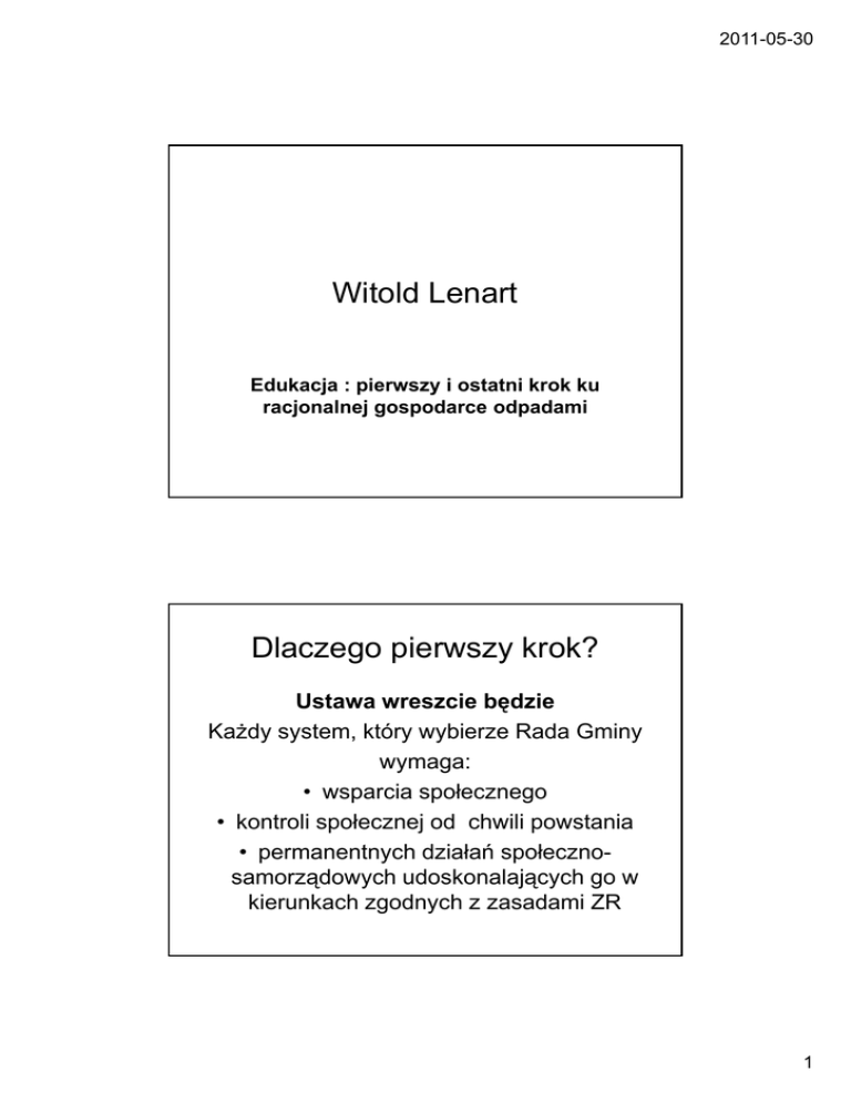 2011-05-30 Witold Lenart Edukacja : pierwszy i ostatni krok ku racjonalnej gospodarce odpadami Dlaczego pierwszy krok? Ustawa wreszcie będzie Każdy system, który wybierze Rada Gminy wymaga: • wsparcia społecznego • kontroli społecznej od chwili powstania • permanentnych działań społecznosamorządowych udoskonalających go w kierunkach zgodnych z zasadami ZR 1 2011-05-30 Dowcip odpadowy, wieloznaczny Nie budowniczym i możnowładcom, ale najwięcej zawdzięczamy tym bezimiennym z przeszłości, którzy nie wleźli do wszystkich lasów, na wszystkie góry, do jaskiń, nor, gniazd i wodnych toni pozostawiając tam nieład i śmieci 2 2011-05-30 Źródła postaw związanych z gospodarowaniem odpadami • • • • diagnoza postaw 20,50,20 +/- 10 syndrom zsypu, zwyciężający konsumeryzm: pokłosie uwolnienia rynku i nieustająca fascynacja opakowaniem : dosłownie i w przenośni; fastfudojadztwo, kateringowanie, boxsetciarstwo itd niewiara w segregację in situ Potępienie głupoty 3 2011-05-30 Źródła postaw związanych z gospodarowaniem odpadami Fundamentalna niewiedza dotycząca odpadów: Ile śmieci na dobę? Jaka jest gęstość świeżych śmieci? Ile kosztuje poprawne zagospodarowanie odpadów komunalnych a ile ich zwykłe usuniecie; 100 i 60 zł rocznie Najcenniejsze dobro jakim możesz obdarować potomnych bliźnich to te bogactwa natury, z których zrezygnujesz 4 2011-05-30 Merytoryczne cele racjonalnej gospodarki odpadami a ekologiczna świadomość potrzeby ich wypełniania • • • • Odpady, zagrożenie niemożliwe do usunięcia jak hałas Ograniczenie jednostkowej masy odpadów; długopis, krem do golenia, butelka z mocna szyjką, wartość czystego krajobrazu, pieniądze w śmieciach Wydzielanie i odrębne postępowanie z biotoną Związek poziomu unikania i segregacji odpadów z opłatami i innymi kosztami usuwania i zagospodarowywania Czy to dobrze, że wciąż nie płacimy za śmieci, deponowania których skutki dosięgną naszych prawnuków 5 2011-05-30 Schematy i „chwyty” edukacyjne służące promocji racjonalnej gospodarki odpadami a. b. c. d. e. Poznaj swoje śmieci Dwie ręce Zasada 6 X U i jej praktyczna implikacja Kompost i sympatia do dżdżownic Edukacja składowiskowa, w tym autopsyjna f. Rola lokalnych realiów odpadowych w opracowywaniu programów edukacji ekologicznej UUUUUU PORCZY WIE ODMA WIAJ TYLIZUJ NIKAJ NIESZ KODLI WIAJ ŻYWAJ POW TÓRNIE CZ SIĘ 6 2011-05-30 • • • • • • Sposoby budowy nośnych scenariuszy, unikanie ogólnikowej sztampy i „budzenia sumienia u obudzonych” zatrważające: zasypana kolumna, puszki do księżyca, uduszone foki motywujące: konkursy, sprzątanie świata, społeczne punkty gospodarowania odpadami wielkogabarytowymi autopsyjne i segregacyjne detektywistyczne mapy śmieci refleksyjne: łyżka, pióro wieczne zabawowe i praktyczne: cuda ze śmieci Wyobraźnia zagrożenia 7 2011-05-30 Papierowa wiklina 8 2011-05-30 Wszystkie twoje zachcianki kończą się także u ciebie w domu, chyba że ich owoc wyrzucisz Zasady organizacji edukacji odpadowej • • • Inicjacja odpowiedzialności za porządek Kontrola przyjętych i wdrożonych zasad i obowiązków Związki z pozostałymi problemami ochrony środowiska i zrównoważonego rozwoju: różnorodność biologiczna, ochrona klimatu, krajobrazu, zasobów wodnych, bezpieczeństwo ekologiczne 9 2011-05-30 Czy może być pożytek z góry śmieci? Góra Kamieńsk zimą 19 A może wiatry wieją coraz silniej by pozamiatać nasze śmieci? 10 2011-05-30 Ocena stanu edukacji odpadowej w Polsce; sukcesy, braki, bariery i perspektywy • Szczupła wyobraźnia autorów i odbiorców • Mizeria dobrych programów regionalnych • Niedostatek wiarygodnych partnerów: może staną się nimi gminy • Akcyjność • Trywializacja zadań dla szkolonych • Typowa dla Polski hermetyzacja projektów i wzorców • Wciąż małe i płytkie zainteresowanie mediów Wyobraźnia przyrodnicza 11 2011-05-30 Ostatni krok • Wsparcie społeczne przyjętego planu • Wyeliminowanie artefaktów: miejsca i sposoby segregacji, niższe koszty dla … • Akceptacja kontroli i organów kontrolnych (SMiG?) • Powołanie kontroli społecznej (SOP?) • Zmiana postaw immisyjnych • Doskonalenie w pętli Deminga Jak łapać pokątnych śmieciarzy? 12 2011-05-30 Pomimo licznych podobieństw koza to nie odkurzacz 13