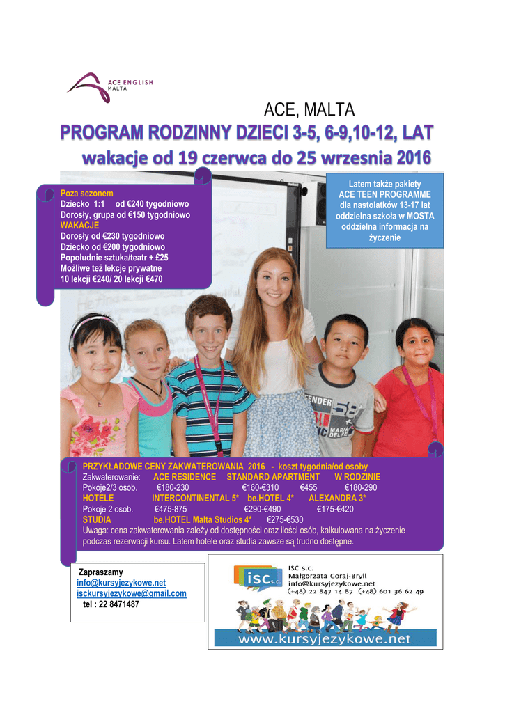 ACE, MALTA Poza sezonem Dziecko 1:1 od €240 tygodniowo Dorosły, grupa od €150 tygodniowo WAKACJE Dorosły od €230 tygodniowo Dziecko od €200 tygodniowo Popołudnie sztuka/teatr + £25 Możliwe też lekcje prywatne 10 lekcji €240/ 20 lekcji €470 Latem także pakiety ACE TEEN PROGRAMME dla nastolatków 13-17 lat oddzielna szkoła w MOSTA oddzielna informacja na życzenie PRZYKŁADOWE CENY ZAKWATEROWANIA 2016 - koszt tygodnia/od osoby Zakwaterowanie: ACE RESIDENCE STANDARD APARTMENT W RODZINIE Pokoje2/3 osob. €180-230 €160-€310 €455 €180-290 HOTELE INTERCONTINENTAL 5* be.HOTEL 4* ALEXANDRA 3* Pokoje 2 osob. €475-875 €290-€490 €175-€420 STUDIA be.HOTEL Malta Studios 4* €275-€530 Uwaga: cena zakwaterowania zależy od dostępności oraz ilości osób, kalkulowana na życzenie podczas rezerwacji kursu. Latem hotele oraz studia zawsze są trudno dostępne. Zapraszamy [email protected] [email protected] tel : 22 8471487
