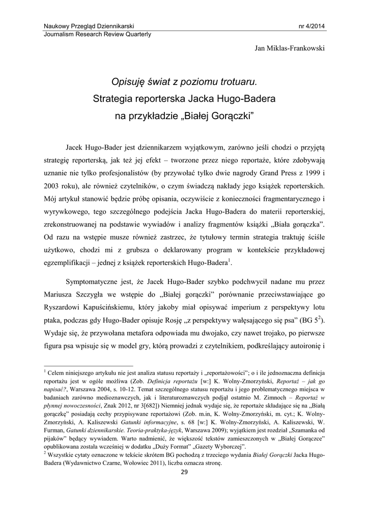 Naukowy Przegląd Dziennikarski Journalism Research Review Quarterly nr 4/2014 Jan Miklas-Frankowski Opisuję świat z poziomu trotuaru. Strategia reporterska Jacka Hugo-Badera na przykładzie „Białej Gorączki” Jacek Hugo-Bader jest dziennikarzem wyjątkowym, zarówno jeśli chodzi o przyjętą strategię reporterską, jak też jej efekt – tworzone przez niego reportaże, które zdobywają uznanie nie tylko profesjonalistów (by przywołać tylko dwie nagrody Grand Press z 1999 i 2003 roku), ale również czytelników, o czym świadczą nakłady jego książek reporterskich. Mój artykuł stanowić będzie próbę opisania, oczywiście z konieczności fragmentarycznego i wyrywkowego, tego szczególnego podejścia Jacka Hugo-Badera do materii reporterskiej, zrekonstruowanej na podstawie wywiadów i analizy fragmentów książki „Biała gorączka”. Od razu na wstępie musze również zastrzec, że tytułowy termin strategia traktuję ściśle użytkowo, chodzi mi z grubsza o deklarowany program w kontekście przykładowej egzemplifikacji – jednej z książek reporterskich Hugo-Badera1. Symptomatyczne jest, że Jacek Hugo-Bader szybko podchwycił nadane mu przez Mariusza Szczygła we wstępie do „Białej gorączki” porównanie przeciwstawiające go Ryszardowi Kapuścińskiemu, który jakoby miał opisywać imperium z perspektywy lotu ptaka, podczas gdy Hugo-Bader opisuje Rosję „z perspektywy wałęsającego się psa” (BG 52). Wydaje się, że przywołana metafora odpowiada mu dwojako, czy nawet trojako, po pierwsze figura psa wpisuje się w model gry, którą prowadzi z czytelnikiem, podkreślający autoironię i 1 Celem niniejszego artykułu nie jest analiza statusu reportaży i „reportażowości”; o i ile jednoznaczna definicja reportażu jest w ogóle możliwa (Zob. Definicja reportażu [w:] K. Wolny-Zmorzyński, Reportaż – jak go napisać?, Warszawa 2004, s. 10-12. Temat szczególnego statusu reportażu i jego problematycznego miejsca w badaniach zarówno medioznawczych, jak i literaturoznawczych podjął ostatnio M. Zimnoch – Reportaż w płynnej nowoczesności, Znak 2012, nr 3[682]) Niemniej jednak wydaje się, że reportaże składające się na „Białą gorączkę” posiadają cechy przypisywane reportażowi (Zob. m.in, K. Wolny-Zmorzyński, m. cyt.; K. WolnyZmorzyński, A. Kaliszewski Gatunki informacyjne, s. 68 [w:] K. Wolny-Zmorzyński, A. Kaliszewski, W. Furman, Gatunki dziennikarskie. Teoria-praktyka-język, Warszawa 2009); wyjątkiem jest rozdział „Szamanka od pijaków” będący wywiadem. Warto nadmienić, że większość tekstów zamieszczonych w „Białej Gorączce” opublikowana została wcześniej w dodatku „Duży Format” „Gazety Wyborczej”. 2 Wszystkie cytaty oznaczone w tekście skrótem BG pochodzą z trzeciego wydania Białej Gorączki Jacka HugoBadera (Wydawnictwo Czarne, Wołowiec 2011), liczba oznacza stronę. 29 Naukowy Przegląd Dziennikarski Journalism Research Review Quarterly nr 4/2014 dystans autora wobec siebie, i choć porównanie to (a przecież wałęsają się przede wszystkim psy nierasowe, czyli mówiąc potocznie – kundle), pozornie go dezawuuje, w rzeczywistości zmniejsza dystans między nim a czytelnikiem, jest to zatem swoiste captatatio benevolantiae. Po drugie wałęsanie się po prostu odpowiada baderowskiej koncepcji podróżowania, kiedy to człowiek ma „taką swobodę i wolność, że (…) może robić wszystko to, co sobie wymarzy” i gdy „to podróż jest ważna, nie jej cel”(BG 208), choć i ta koncepcja jest tylko idealną konstrukcją – autor „Białej gorączki” tak naprawdę jest ograniczony choćby stanowczym nakazem powrotu na święta wydanym przez żonę czy zapobiegliwie zawczasu wysyła do domu brudną bieliznę, by nie mieć nadbagażu w samolocie. Po trzecie wreszcie HugoBaderowi odpowiada psia perspektywa percepcji świata: Jestem reporterem trotuarowym. Nie salonowym. Opisuję świat z perspektywy trotuaru. Idę po trotuarze, czasami mi się noga omsknie, wpadnę do rynsztoka, wstanę, otrzepię się i idę dalej. Mnie interesują doły, niziny społeczne. Nie interesuje mnie polityka, chyba że jest to folklor polityczny. Mnie bardziej interesują odrzuceni niż wybrani. (…). Nie patrzę na świat z góry. Nie umiem przeprowadzić wielkiej analizy, ale umiem odebrać płyty chodnikowe wszystkimi zmysłami. Mam węch jak owczarek niemiecki3. Psia percepcja, do której tak chętnie przyznaje się Hugo-Bader, symbolizuje zatem z jednej strony wielozmysłowe, wieloaspektowe postrzeganie złożoności świata, ale też przede wszystkim psią perspektywę – ograniczoną z jednej strony niskim poziomem, bliskim chodnika, a zatem dołów i nizin społecznych, a z drugiej – ograniczoną przestrzennie – wolny, wałęsający się pies nie wszędzie będzie chciał pójść i nie wszędzie zostanie wpuszczony (choćby do klubu z selekcją). „Jeśli miałbym wybrać między wywiadem z politykiem, a jego szoferem, to wybrałbym szofera4” – mówi w jednym z wywiadów. „Jeśli będę miał do wyboru kryminał i pałac prezydencki – zawsze wybiorę to pierwsze miejsce. Także z powodów estetycznych5(…)” – dodaje w drugim i kontynuuje: „Oczywiście mógłbym pisać o wielkich tego świata, nawet niemało popróbowałem, ale jakoś bliżsi są mojemu sercu ci przegrani, a nie zwycięzcy6.” 3 I. Gierblińska, E. Hetmanowska, Historia musi mnie sponiewierać. Rozmowa z Jackiem Hugo-Baderem. (http://www.dwutygodnik.com/artykul/843, dostęp 11.04. 2013). 4 D. Sztuba, Nie jestem reportażysta ani podróżnikiem. Wywiad z Jackiem Hugo – Baderem na Festivalu „3 Żywioły” w Krakowie (http://www.klubpodroznikow.com/wywiady/118-wywiady/1264-nie-jestem-reportazystaani-podroznikiem, dostęp 11.04.2013). 5 B. Krzysztan, Polityka, książki, ludzie, wywiad z Jackiem Hugo-Baderem (http://readakcja.blogspot.com/2012/11/polityka-ksiazki-ludzie-wywiad-z.html, d