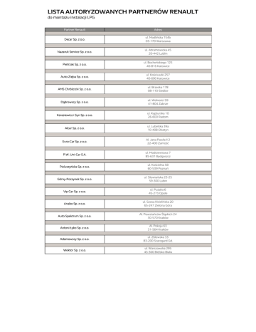 LISTA AUTORYZOWANYCH PARTNERÓW RENAULT do montażu instalacji LPG Partner Renault Adres Decar Sp. z o.o. ul. Modlińska 154b 03-170 Warszawa Nazaruk Service Sp. z o.o. ul. Abramowicka 45 20-442 Lublin Pietrzak Sp. z o.o. ul. Bocheńskiego 125 40-816 Katowice Auto-Zięba Sp. z o.o. ul. Kościuszki 257 40-690 Katowice AMS Chróścicki Sp. z o.o. ul. Brzeska 178 08-110 Siedlce Dąbrowscy Sp. z o.o. ul. Wolności 59 41-804 Zabrze Karasiewicz i Syn Sp. z o.o. ul. Kapturska 10 26-600 Radom Alcar Sp. z o.o. ul. Lubelska 39a 10-408 Olsztyn Euro-Car Sp. z o.o. Al. Jana Pawła II 2 22-400 Zamość P.W. Uni-Car S.A. ul. Modrzewiowa 7 85-631 Bydgoszcz Pieluszyńska Sp. z o.o. ul. Kościelna 58 60-539 Poznań Górny-Poczynek Sp. z o.o. ul. Słowiańska 23-25 59-300 Lubin Vip Car Sp. z o.o. ul. Pużaka 6 45-273 Opole Anabo Sp. z o.o. ul. Szosa Kisielińska 20 65-247 Zielona Góra Auto Spektrum Sp. z o.o. Al. Powstańców Śląskich 24 30-570 Kraków Antoni Łyko Sp. z o.o. Al. Pokoju 63 31-564 Kraków Adamowscy Sp. z o.o. ul. Zblewska 33 83-200 Starogard Gd. Wektor Sp. z o.o. ul. Warszawska 295 43-300 Bielsko-Biała Auto-Serwis Pasikowski Sp. z o.o. ul. Bielska 70 09-402 Płock Auto-Compol S.A. ul. Kazimierza Wielkiego 1 61-863 Poznań Pabich Sp. z o.o. Al. Niepodległości 49 64-920 Piła Dyszkiewicz Sp. z o.o. ul. Warszawska 84 05-520 Konstancin-Jeziorna Łukasik Sp. z o.o. ul. Kilińskiego 32a 19-300 Ełk Nawrot Sp. z o.o. ul. Wrocławska 33b 55-095 Mirków, Długołęka ADD Motor Sp. z o.o. ul. Karkonoska 45 53-015 Wrocław PHU Anndora Sp. zo.o. ul. Kościuszki 182 34-530 Bukowina Tatrzańska Renault Retail Group Puławska Renault Retail Group Warszawa Sp. z o.o. ul. Puławska 621b 02-885 Warszawa Renault Retail Group Mory Renault Retail Group Warszawa Sp. z o.o. ul. Poznańska 16/18 05-850 Mory Renault Retail Group Praga Renault Retail Group Warszawa Sp. z o.o. ul. Lewinowska 37/39 03-684 Warszawa PHUP Motozbyt Sp. z o.o. ul. Narodowych Sił Zbrojnych 19b 15-690 Białystok Rudnik Sp z o.o. oddział Ostrołęka ul. Warszawska 41 07-410 Olszewo Borki k/Ostrołęki PROMOTOR SP.Z O.O ul. Niepodległości 38; 58-303 Wałbrzych