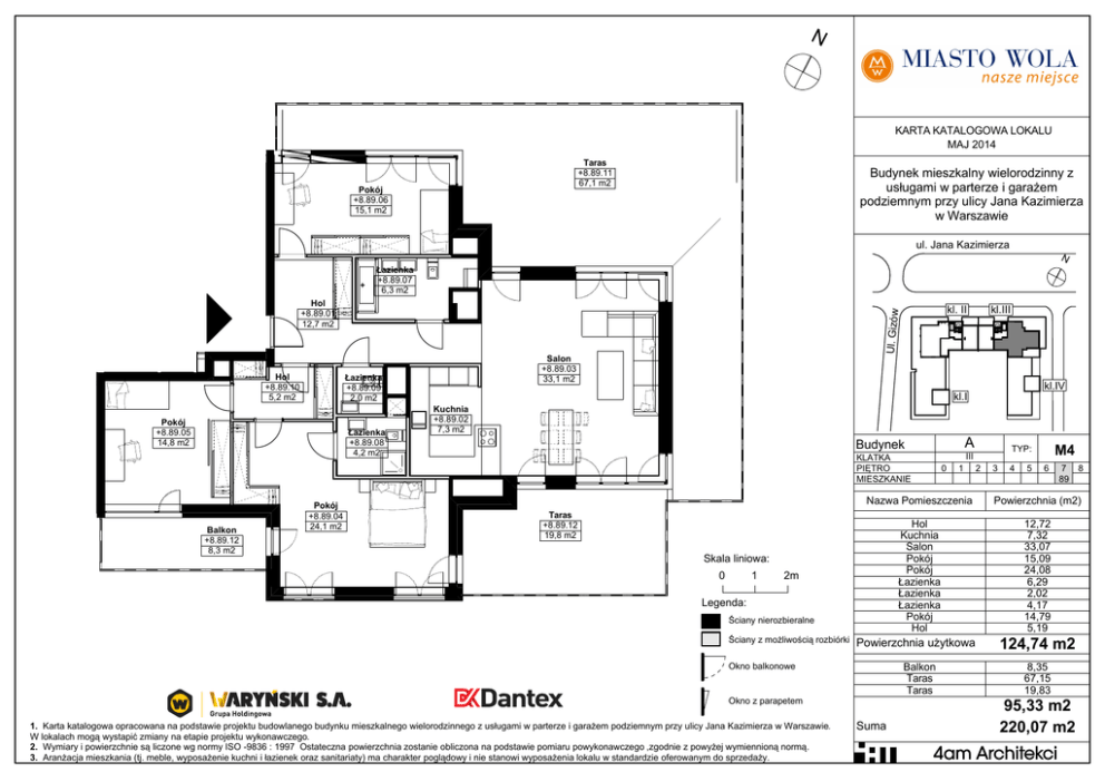 N KARTA KATALOGOWA LOKALU MAJ 2014 Taras +8.89.11 67,1 m2 Pokój +8.89.06 15,1 m2 Budynek mieszkalny wielorodzinny z usługami w parterze i garażem podziemnym przy ulicy Jana Kazimierza w Warszawie ul. Jana Kazimierza N Łazienka +8.89.07 6,3 m2 Komunikacja +8.R.02 21,4 m2 Hol +8.89.10 5,2 m2 Łazienka Łazienka +8.89.09 2,0 m2 Pokój +8.89.05 14,8 m2 Łazienka +8.89.08 4,2 m2 Balkon +8.89.12 8,3 m2 Salon +8.89.03 33,1 m2 Pokój +8.89.04 24,1 m2 kl.III kl. II Ul. Gizów Hol +8.89.01 12,7 m2 zmiana grubości płyty kl.IV kl.I Kuchnia +8.89.02 7,3 m2 A Budynek KLATKA PIĘTRO MIESZKANIE M89 Taras +8.89.12 19,8 m2 1 5 6 7 89 8 12,72 7,32 33,07 15,09 24,08 6,29 2,02 4,17 14,79 5,19 Ściany nierozbieralne Powierzchnia użytkowa Balkon Taras Taras Okno z parapetem 1. Karta katalogowa opracowana na podstawie projektu budowlanego budynku mieszkalnego wielorodzinnego z usługami w parterze i garażem podziemnym przy ulicy Jana Kazimierza w Warszawie. W lokalach mogą wystapić zmiany na etapie projektu wykonawczego. 2. Wymiary i powierzchnie są liczone wg normy ISO -9836 : 1997 Ostateczna powierzchnia zostanie obliczona na podstawie pomiaru powykonawczego ,zgodnie z powyżej wymiennioną normą. 3. Aranżacja mieszkania (tj. meble, wyposażenie kuchni i łazienek oraz sanitariaty) ma charakter poglądowy i nie stanowi wyposażenia lokalu w standardzie oferowanym do sprzedaży. 4 Hol Kuchnia Salon Pokój Pokój Łazienka Łazienka Łazienka Pokój Hol Legenda: M89.1 Okno balkonowe 3 Powierzchnia (m2) 2m Ściany z możliwością rozbiórki 2 Nazwa Pomieszczenia Skala liniowa: 0 1 M4 TYP: III 0 Suma 124,74 m2 8,35 67,15 19,83 95,33 m2 220,07 m2