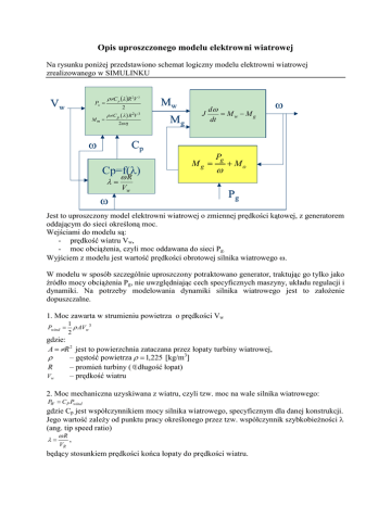 Opis uproszczonego modelu elektrowni wiatrowej Na rysunku poniŜej przedstawiono schemat logiczny modelu elektrowni wiatrowej zrealizowanego w SIMULINKU Pw = Vw ρπC p (λ )R 2V 3 2 ρπ C p ( λ ) R 2V 3 Mm = 2ωη ω Mw Mg J dω = Mw − Mg dt ω Cp Cp=f(λ) λ= ωR Mg = Pg ω Vw ω + Mo Pg Jest to uproszczony model elektrowni wiatrowej o zmiennej prędkości kątowej, z generatorem oddającym do sieci określoną moc. Wejściami do modelu są: - prędkość wiatru Vw, - moc obciąŜenia, czyli moc oddawana do sieci Pg. Wyjściem z modelu jest wartość prędkości obrotowej silnika wiatrowego ω. W modelu w sposób szczególnie uproszczony potraktowano generator, traktując go tylko jako źródło mocy obciąŜenia Pg, nie uwzględniając cech specyficznych maszyny, układu regulacji i dynamiki. Na potrzeby modelowania dynamiki silnika wiatrowego jest to załoŜenie dopuszczalne. 1. Moc zawarta w strumieniu powietrza o prędkości Vw Pwind = 1 ρ AVw3 2 gdzie: A = πR 2 jest to powierzchnia zataczana przez łopaty turbiny wiatrowej, ρ – gęstość powietrza ρ = 1,225 [kg/m3] R – promień turbiny ( ≈ długość łopat) Vw – prędkość wiatru 2. Moc mechaniczna uzyskiwana z wiatru, czyli tzw. moc na wale silnika wiatrowego: PW = CP Pwind gdzie Cp jest współczynnikiem mocy silnika wiatrowego, specyficznym dla danej konstrukcji. Jego wartość zaleŜy od punktu pracy określonego przez tzw. współczynnik szybkobieŜności λ (ang. tip speed ratio) λ= ωR VR , będący stosunkiem prędkości końca łopaty do prędkości wiatru. Rysunek poniŜej przedstawia typowy kształt współczynnika mocy w funkcji współczynnika szybkobieŜności. 0,45 0,4 0,35 0,3 Cp 0,25 0,2 0,15 0,1 0,05 0 0 2 4 6 8 10 12 14 16 tip s pe e d ra tio Współczynnik mocy turbiny wiatrowej moŜna przybliŜyć następującą funkcją: CP = c1 (c2 1 − c3ϑ − c4ϑ x − c5 ) Λ e − c6 1 Λ gdzie: 1 1 0,035 = − Λ λ + 0.08ϑ 1 + ϑ 3 ϑ – kąt nachylenia łopat turbiny c1 − c6 – współczynniki stałe, które dla modelowanej turbiny przybierają wartości: c1 = 0,5 , c2 = 116 , c3 = 0,4 , c4 = 0 , c5 = 5 , c6 = 21 Na kolejnym rysunku przedstawiono uzyskane charakterystyki turbiny wiatrowej, czyli wartość mocy Pw w funkcji prędkości kątowej ω dla róŜnych prędkości wiatru Vw. Moc [W] 3,E+06 2,E+06 12 krzywa maksimum mocy 2,E+06 1,E+06 10 5,E+05 8 4 6 0,E+00 0 5 10 15 20 25 30 [obr/min] 35 Dynamika wiatru 3. Dynamika zmian mocy mechanicznej uzyskiwanej z wiatru opisana jest transmitancją: G ( s ) = KW 1 + sTW 1 1 + sTW 2 gdzie: TW 1 > TW 2 KW = 1 TW 1 = 3.3 [s] TW 2 = 0.9 [s] 4. Moment napędowy generowany na wale turbiny wiatrowej: P τW = W ωW Zespół napędowy (wał i przekładnia) jest układem wielu mas połączonych ze sobą. PoniŜej pokazano model dla układu dwóch mas (generatora i turbiny) połączonych spręŜyście. dδ W = ω W − ω W 0 = ∆ωW dt dδ G = ω G − ω G 0 = ∆ω G dt d∆ωW δ ∆ω G = τ W − K (δ W − G ) − D(∆ω W − ) JW dt υ υ ∆ω G δ K (δ W − G ) − D(∆ωW − ) d∆ω G υ υ JG =τG + dt υ gdzie: JW – moment bezwładności turbiny wiatrowej JG – moment bezwładności generatora τG ωG ωW 0 ωG0 δW δG υ – moment oporowy elektryczny K D – prędkość kątowa generatora – prędkość kątowa łopat turbiny w stanie ustalonym – prędkość kątowa generatora w stanie ustalonym – przesunięcie kątowe łopat turbiny – przesunięcie kątowe generatora – przekładnia – współczynnik sztywności [Nm/rad] – współczynnik tłumienia [Nms/rad] Schematy poszczególnych bloków modelu