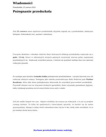 Wiadomości Poniedziałek, 23 czerwca 2014 Pożegnanie przedszkola Dziś 23 czerwca nasze najstarsze przedszkolaki oficjalnie żegnały się z przedszkolem, młodszymi kolegami i koleżankami oraz paniami i zabawkami. Uroczysta akademia z udziałem rodziców dzieci kończących edukację przedszkolną rozpoczęła się o godz. 13-tej. Dzieci w odświętnych strojach galowych recytowały wiersze pełne wspomnień przedszkolnych lat, dziękowały wszystkim paniom, z którymi się spotykały każdego dnia oraz śpiewały wakacyjne piosenki. Po występie pani dyrektor Leokadia Kukla podziękowała przedszkolakom i życzyła dzieciom oraz ich rodzicom udanych wakacji. Następnie głos zabrała przewodnicząca Rady Rodziców pani Paulina Kwadrans, która miłe słowa podziękowania skierowała do wszystkich pracowników przedszkola. Przyszedł również czas na wręczenie drobnych upominków, dzieci otrzymały pamiątkowe dyplomy, tabla i drobiazgi przydatne na ich nowej drodze życia czyli w szkole. Ach jak szybko biegnie ten czas - dopiero witaliśmy się wszyscy po wakacjach, a tu już za progiem czekają nastęne. Te kilka lat spędzonych z dzieciakami sprawiły, że bardzo się do siebie przywiązaliśmy, dlatego w takiej chwili człowiekowi kręci się łza w oku, kiedy sobie uświadami, że to już ostatnie chwile bycia razem... Kochane przedszkolaki mamy nadzieję, że będziecie nas miło wspominać, kiedy już na dobre opuścicie przedszkolne mury. Życzymy Wam samych sukcesów w szkole i udanych wakacji pełnych słońca, a Rodzicom dziękujemy za aktywny udział w życiu przedszkola, okazaną pomoc i miłe słowa. To już ostatni raz mówimy Wam wszystkim serdeczne DZIĘKUJEMY