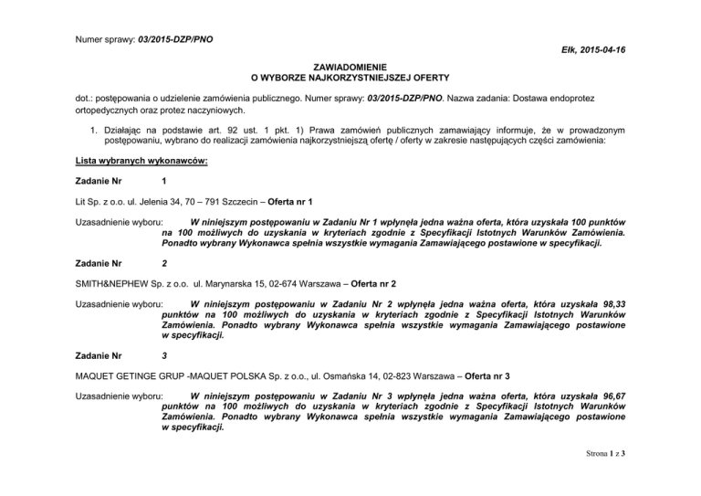 Numer sprawy: 03/2015-DZP/PNO Ełk, 2015-04-16 ZAWIADOMIENIE O WYBORZE NAJKORZYSTNIEJSZEJ OFERTY dot.: postępowania o udzielenie zamówienia publicznego. Numer sprawy: 03/2015-DZP/PNO. Nazwa zadania: Dostawa endoprotez ortopedycznych oraz protez naczyniowych. 1. Działając na podstawie art. 92 ust. 1 pkt. 1) Prawa zamówień publicznych zamawiający informuje, że w prowadzonym postępowaniu, wybrano do realizacji zamówienia najkorzystniejszą ofertę / oferty w zakresie następujących części zamówienia: Lista wybranych wykonawców: Zadanie Nr 1 Lit Sp. z o.o. ul. Jelenia 34, 70 – 791 Szczecin – Oferta nr 1 Uzasadnienie wyboru: W niniejszym postępowaniu w Zadaniu Nr 1 wpłynęła jedna ważna oferta, która uzyskała 100 punktów na 100 możliwych do uzyskania w kryteriach zgodnie z Specyfikacji Istotnych Warunków Zamówienia. Ponadto wybrany Wykonawca spełnia wszystkie wymagania Zamawiającego postawione w specyfikacji. Zadanie Nr 2 SMITH&NEPHEW Sp. z o.o. ul. Marynarska 15, 02-674 Warszawa – Oferta nr 2 Uzasadnienie wyboru: W niniejszym postępowaniu w Zadaniu Nr 2 wpłynęła jedna ważna oferta, która uzyskała 98,33 punktów na 100 możliwych do uzyskania w kryteriach zgodnie z Specyfikacji Istotnych Warunków Zamówienia. Ponadto wybrany Wykonawca spełnia wszystkie wymagania Zamawiającego postawione w specyfikacji. Zadanie Nr 3 MAQUET GETINGE GRUP -MAQUET POLSKA Sp. z o.o., ul. Osmańska 14, 02-823 Warszawa – Oferta nr 3 Uzasadnienie wyboru: W niniejszym postępowaniu w Zadaniu Nr 3 wpłynęła jedna ważna oferta, która uzyskała 96,67 punktów na 100 możliwych do uzyskania w kryteriach zgodnie z Specyfikacji Istotnych Warunków Zamówienia. Ponadto wybrany Wykonawca spełnia wszystkie wymagania Zamawiającego postawione w specyfikacji. Strona 1 z 3 Zadanie Nr 4 MAQUET GETINGE GRUP -MAQUET POLSKA Sp. z o.o., ul. Osmańska 14, 02-823 Warszawa – Oferta nr 3 Uzasadnienie wyboru: W niniejszym postępowaniu w Zadaniu Nr 4 wpłynęła jedna ważna oferta, która uzyskała 96,67 punktów na 100 możliwych do uzyskania w kryteriach zgodnie z Specyfikacji Istotnych Warunków Zamówienia. Ponadto wybrany Wykonawca spełnia wszystkie wymagania Zamawiającego postawione w specyfikacji. (UMOWY ZOSTANĄ PRZESŁANE POCZTĄ). Podstawą prawną dokonanego wyboru jest art. 91 ust. 1 Pzp oraz Kodeks Cywilny W prowadzonym postępowaniu złożono następujące oferty: Odrzucone oferty Ważne oferty Zadanie Oferty Nr 1 Nr 2 Lit Sp. z o.o. ul. Jelenia 34, 70 – 791 Szczecin SMITH&NEPHEW Sp. z o.o. ul. Marynarska 15, 02-674 Warszawa Cena 1 1 0 2 1 0 - 3 1 0 4 1 0 pkt Termin pkt Razem 151 362,00 zł 95 Cena 1 5 100,00 - - - - - - - - - - - - - - - - - pkt Termin pkt - Nr 3 MAQUET GETINGE GRUP -MAQUET POLSKA Sp. z o.o., ul. Osmańska 14, 02-823 Warszawa Razem Cena pkt Termin pkt Razem - - - - - - - - 2 3,33 98,33 - - - - - - - - - 88 992,00 zł 95 3 1,67 96,67 - - - - 33 102,00 zł 95 3 1,67 96,67 119 880,00 zł 95 2. Działając na podstawie art. 92 ust. 1 pkt. 2) Prawa zamówień publicznych zamawiający informuje o odrzuceniu z udziału w Strona 2 z 3 postępowaniu oferty / ofert: Brak 3. Działając na postawie art. 92 ust. 1 pkt 3) Prawa zamówień publicznych zamawiający informuje, że w prowadzonym postępowaniu nie zostali wykluczeni żadni wykonawcy. 4. Działając na postawie art. 92 ust 1 pkt 4) Prawa zamówień publicznych zamawiający informuje, że podpisanie umowy z wyłonionym wykonawcą możliwe będzie po dopełnianiu wszelkich formalności po upływie minimalnie 10 dni od dnia przesłania niniejszego zawiadomienia o wyborze najkorzystniejszej oferty. Środki ochrony prawnej Od niniejszej decyzji zamawiającego, wykonawcy przysługują środki ochrony prawnej (Odwołanie, Skarga do Sądu) wobec 1) niezgodnej z przepisami ustawy czynności podjętej przez zamawiającego w niniejszym postępowaniu, lub 2) zaniechaniu czynności, do której zamawiający jest zobowiązany na podstawie ustawy, Termin wniesienia odwołania: 10 dni od dnia przesłania niniejszego zawiadomienia faksem lub drogą elektroniczną, lub 15 dni od dnia przesłania niniejszego zawiadomienia, jeżeli zostało ono przesłane pisemnie. Informacje dotyczące środków ochrony prawnej znajdują się Specyfikacji istotnych warunków zamówienia oraz w Dziale VI Prawa zamówień publicznych „Środki ochrony prawnej", art. od 179 do 198g (tj. Dz. U. z 2013 r. poz. 907, z p. zm.) Komisja: Zatwierdził: Strona 3 z 3