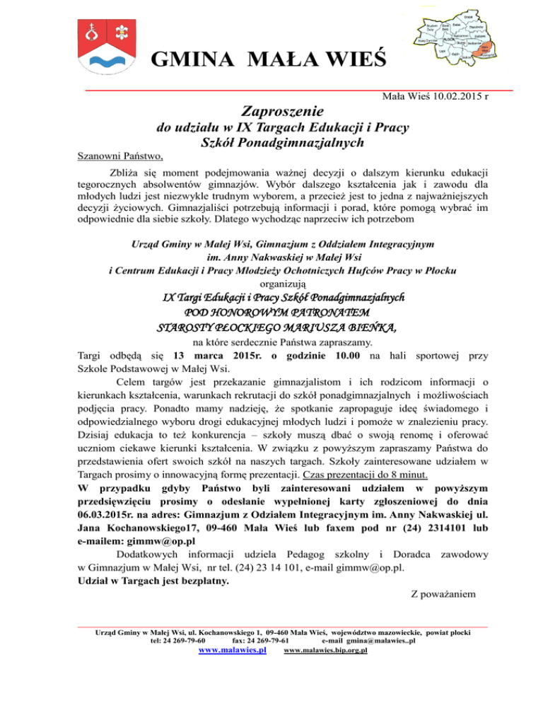 GMINA MAŁA WIEŚ Mała Wieś 10.02.2015 r Zaproszenie do udziału w IX Targach Edukacji i Pracy Szkół Ponadgimnazjalnych Szanowni Państwo, Zbliża się moment podejmowania ważnej decyzji o dalszym kierunku edukacji tegorocznych absolwentów gimnazjów. Wybór dalszego kształcenia jak i zawodu dla młodych ludzi jest niezwykle trudnym wyborem, a przecież jest to jedna z najważniejszych decyzji życiowych. Gimnazjaliści potrzebują informacji i porad, które pomogą wybrać im odpowiednie dla siebie szkoły. Dlatego wychodząc naprzeciw ich potrzebom Urząd Gminy w Małej Wsi, Gimnazjum z Oddziałem Integracyjnym im. Anny Nakwaskiej w Małej Wsi i Centrum Edukacji i Pracy Młodzieży Ochotniczych Hufców Pracy w Płocku organizują IX Targi Edukacji i Pracy Szkół Ponadgimnazjalnych POD HONOROWYM PATRONATEM STAROSTY PŁOCKIEGO MARIUSZA BIEŃKA, na które serdecznie Państwa zapraszamy. Targi odbędą się 13 marca 2015r. o godzinie 10.00 na hali sportowej przy Szkole Podstawowej w Małej Wsi. Celem targów jest przekazanie gimnazjalistom i ich rodzicom informacji o kierunkach kształcenia, warunkach rekrutacji do szkół ponadgimnazjalnych i możliwościach podjęcia pracy. Ponadto mamy nadzieję, że spotkanie zapropaguje ideę świadomego i odpowiedzialnego wyboru drogi edukacyjnej młodych ludzi i pomoże w znalezieniu pracy. Dzisiaj edukacja to też konkurencja – szkoły muszą dbać o swoją renomę i oferować uczniom ciekawe kierunki kształcenia. W związku z powyższym zapraszamy Państwa do przedstawienia ofert swoich szkół na naszych targach. Szkoły zainteresowane udziałem w Targach prosimy o innowacyjną formę prezentacji. Czas prezentacji do 8 minut. W przypadku gdyby Państwo byli zainteresowani udziałem w powyższym przedsięwzięciu prosimy o odesłanie wypełnionej karty zgłoszeniowej do dnia 06.03.2015r. na adres: Gimnazjum z Odziałem Integracyjnym im. Anny Nakwaskiej ul. Jana Kochanowskiego17, 09-460 Mała Wieś lub faxem pod nr (24) 2314101 lub e-mailem: [email protected] Dodatkowych informacji udziela Pedagog szkolny i Doradca zawodowy w Gimnazjum w Małej Wsi, nr tel. (24) 23 14 101, e-mail [email protected]. Udział w Targach jest bezpłatny. Z poważaniem __________________________________________________________________________________________ Urząd Gminy w Małej Wsi, ul. Kochanowskiego 1, 09-460 Mała Wieś, województwo mazowieckie, powiat płocki tel: 24 269-79-60 fax: 24 269-79-61 e-mail [email protected] www.malawies.pl www.malawies.bip.org.pl