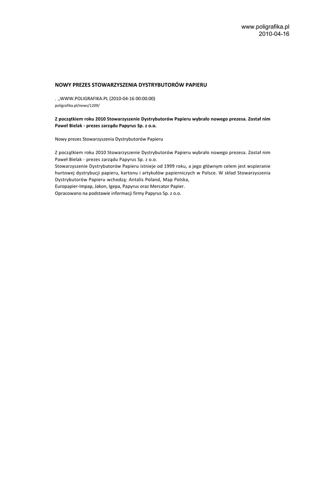 www.poligrafika.pl 2010-04-16 NOWY PREZES STOWARZYSZENIA DYSTRYBUTORÓW PAPIERU . .,WWW.POLIGRAFIKA.PL (2010-04-16 00:00:00) poligrafika.pl/news/1209/ Z początkiem roku 2010 Stowarzyszenie Dystrybutorów Papieru wybrało nowego prezesa. Został nim Paweł Bielak - prezes zarządu Papyrus Sp. z o.o. Nowy prezes Stowarzyszenia Dystrybutorów Papieru Z początkiem roku 2010 Stowarzyszenie Dystrybutorów Papieru wybrało nowego prezesa. Został nim Paweł Bielak - prezes zarządu Papyrus Sp. z o.o. Stowarzyszenie Dystrybutorów Papieru istnieje od 1999 roku, a jego głównym celem jest wspieranie hurtowej dystrybucji papieru, kartonu i artykułów papierniczych w Polsce. W skład Stowarzyszenia Dystrybutorów Papieru wchodzą: Antalis Poland, Map Polska, Europapier-Impap, Jakon, Igepa, Papyrus oraz Mercator Papier. Opracowano na podstawie informacji firmy Papyrus Sp. z o.o.