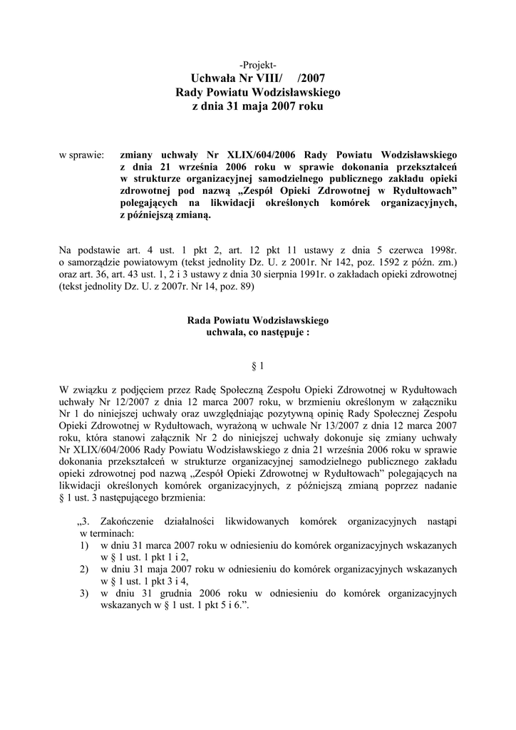 -Projekt- Uchwała Nr VIII/ /2007 Rady Powiatu Wodzisławskiego z dnia 31 maja 2007 roku w sprawie: zmiany uchwały Nr XLIX/604/2006 Rady Powiatu Wodzisławskiego z dnia 21 września 2006 roku w sprawie dokonania przekształceń w strukturze organizacyjnej samodzielnego publicznego zakładu opieki zdrowotnej pod nazwą „Zespół Opieki Zdrowotnej w Rydułtowach” polegających na likwidacji określonych komórek organizacyjnych, z późniejszą zmianą. Na podstawie art. 4 ust. 1 pkt 2, art. 12 pkt 11 ustawy z dnia 5 czerwca 1998r. o samorządzie powiatowym (tekst jednolity Dz. U. z 2001r. Nr 142, poz. 1592 z późn. zm.) oraz art. 36, art. 43 ust. 1, 2 i 3 ustawy z dnia 30 sierpnia 1991r. o zakładach opieki zdrowotnej (tekst jednolity Dz. U. z 2007r. Nr 14, poz. 89) Rada Powiatu Wodzisławskiego uchwala, co następuje : §1 W związku z podjęciem przez Radę Społeczną Zespołu Opieki Zdrowotnej w Rydułtowach uchwały Nr 12/2007 z dnia 12 marca 2007 roku, w brzmieniu określonym w załączniku Nr 1 do niniejszej uchwały oraz uwzględniając pozytywną opinię Rady Społecznej Zespołu Opieki Zdrowotnej w Rydułtowach, wyraŜoną w uchwale Nr 13/2007 z dnia 12 marca 2007 roku, która stanowi załącznik Nr 2 do niniejszej uchwały dokonuje się zmiany uchwały Nr XLIX/604/2006 Rady Powiatu Wodzisławskiego z dnia 21 września 2006 roku w sprawie dokonania przekształceń w strukturze organizacyjnej samodzielnego publicznego zakładu opieki zdrowotnej pod nazwą „Zespół Opieki Zdrowotnej w Rydułtowach” polegających na likwidacji określonych komórek organizacyjnych, z późniejszą zmianą poprzez nadanie § 1 ust. 3 następującego brzmienia: „3. Zakończenie działalności likwidowanych komórek organizacyjnych nastąpi w terminach: 1) w dniu 31 marca 2007 roku w odniesieniu do komórek organizacyjnych wskazanych w § 1 ust. 1 pkt 1 i 2, 2) w dniu 31 maja 2007 roku w odniesieniu do komórek organizacyjnych wskazanych w § 1 ust. 1 pkt 3 i 4, 3) w dniu 31 grudnia 2006 roku w odniesieniu do komórek organizacyjnych wskazanych w § 1 ust. 1 pkt 5 i 6.”. §2 Wykonanie uchwały powierza się Zarządowi Powiatu Wodzisławskiego. §3 Uchwała wchodzi w Ŝycie z dniem podjęcia. Załącznik Nr 1 do uchwały Nr VIII/....../2007 Rady Powiatu Wodzisławskiego z dnia 31 maja 2007r. Uchwała Nr 12/2007 Rady Społecznej Zespołu Opieki Zdrowotnej w Rydułtowach z dnia 12 marca 2007 roku w sprawie: uchylenia uchwały Nr 25/2006 Rady Społecznej Zespołu Opieki Zdrowotnej w Rydułtowach z dnia 14 listopada 2006 roku dotyczącej zmiany terminu przekształceń w strukturze organizacyjnej Zespołu Opieki Zdrowotnej w Rydułtowach polegających na likwidacji komórek organizacyjnych: Poradni Lekarza POZ i Poradni Pediatrycznej w Gminnym Ośrodku Zdrowia w Kornowacu przy ul. Zacisze 27 ustalonych na dzień 31 marca 2007 roku. Na podstawie art. 46, pkt 1 litery c ustawy o zakładach opieki zdrowotnej z dnia 30 sierpnia 1991 roku (tekst jednolity Dz. U. z 2007 r. Nr 14, poz. 89) oraz § 17 pkt 1 litery c statutu Zespołu Opieki Zdrowotnej w Rydułtowach i § 13 pkt 1 Regulaminu Rady Społecznej Zespołu Opieki Zdrowotnej w Rydułtowach Rada Społeczna Zespołu Opieki Zdrowotnej w Rydułtowach postanawia, co następuje: §1 Uchylić uchwałę Nr 25/2006 Rady Społecznej Zespołu Opieki Zdrowotnej w Rydultowach z dnia 14 listopada 2006 roku w sprawie zmiany terminu przekształceń w strukturze organizacyjnej Zespołu Opieki Zdrowotnej w Rydułtowach polegających na likwidacji komórek organizacyjnych zakładu: Poradni Lekarza POZ i Poradni Pediatrycznej w Gminnym Ośrodku Zdrowia w Kornowacu przy ul. Zacisze 27 ustalonych na dzień 31 marca 2007 roku. §2 Zobowiązać Dyrektora Zespołu Opieki Zdrowotnej w Rydułtowach do przedstawienia niniejszej uchwały Radzie Powiatu Wodzisławskiego. §3 Uchwała wchodzi w Ŝycie z dniem 30 marca 2007 roku. Przewodniczący Rady Społecznej Zespołu Opieki Zdrowotnej w Rydułtowach /-/ mgr Andrzej Kania Załącznik Nr 2 do Uchwały Nr VIII/....../2007 Rady Powiatu Wodzisławskiego z dnia 31 maja 2007r. Uchwała Nr 13/2007 Rady Społecznej Zespołu Opieki Zdrowotnej w Rydułtowach z dnia 12 marca 2007 roku w sprawie: zaopiniowania zmiany terminu przekształceń w strukturze organizacyjnej samodzielnego publicznego zakładu opieki zdrowotnej pod nazwą „Zespół Opieki Zdrowotnej w Rydułtowach” polegających na likwidacji komórek organizacyjnych: Poradni Lekarza POZ i Poradni Pediatrycznej w Gminnym Ośrodku Zdrowia w Kornowacu przy ul. Zacisze 27. Na podstawie art. 46, pkt 1 litery c ustawy o zakładach opieki zdrowotnej z dnia 30 sierpnia 1991 roku (tekst jednolity Dz. U. z 2007 r. Nr 14, poz. 89) oraz § 17 pkt 1 litery c statutu Zespołu Opieki Zdrowotnej w Rydułtowach i § 13 pkt 1 Regulaminu Rady Społecznej Zespołu Opieki Zdrowotnej w Rydułtowach Rada Społeczna Zespołu Opieki Zdrowotnej w Rydułtowach postanawia, co następuje: §1 1. Pozytywnie opiniuje się zmianę terminu przekształceń w strukturze organizacyjnej samodzielnego publicznego zakładu opieki zdrowotnej pod nazwą „Zespół Opieki Zdrowotnej w Rydułtowach” polegających na likwidacji komórek organizacyjnych zakładu: Poradni Lekarza POZ i Poradni Pediatrycznej w Gminnym Ośrodku Zdrowia w Kornowacu przy ul. Zacisze 27. 2. Zakończenie czynności likwidacyjnych oraz działalności komórek organizacyjnych ustala się na dzień 31 maja 2007 roku. §2 Zobowiązuje się Dyrektora Zespołu Opieki Zdrowotnej w Rydułtowach do przedstawienia niniejszej uchwały Radzie Powiatu Wodzisławskiego. §3 Uchwała wchodzi w Ŝycie z dniem 30 marca 2007 roku. Przewodniczący Rady Społecznej Zespołu Opieki Zdrowotnej w Rydułtowach /-/ mgr Andrzej Kania UZASADNIENIE do projektu Uchwały Nr VIII/ /2007 Rady Powiatu Wodzisławskiego z dnia 31 maja 2007 roku w sprawie: zmiany uchwały Nr XLIX/604/2006 Rady Powiatu Wodzisławskiego z dnia 21 września 2006 roku w sprawie dokonania p