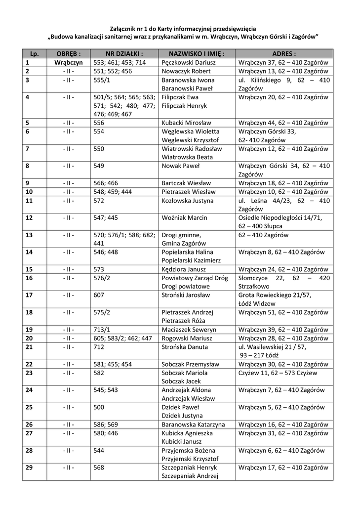 Załącznik nr 1 do Karty informacyjnej przedsięwzięcia „Budowa kanalizacji sanitarnej wraz z przykanalikami w m. Wrąbczyn, Wrąbczyn Górski i Zagórów” 1 2 3 Lp. OBRĘB : Wrąbczyn - II - II - NR DZIAŁKI : 553; 461; 453; 714 551; 552; 456 555/1 4 - II - 5 6 - II - II - 7 - II - 8 - II - NAZWISKO I IMIĘ : Pęczkowski Dariusz Nowaczyk Robert Baranowska Iwona Baranowski Paweł 501/5; 564; 565; 563; Filipczak Ewa 571; 542; 480; 477; Filipczak Henryk 476; 469; 467 556 Kubacki Mirosław 554 Węglewska Wioletta Węglewski Krzysztof 550 Wiatrowski Radosław Wiatrowska Beata 549 Nowak Paweł 9 10 11 - II - II - II - 566; 466 548; 459; 444 572 Bartczak Wiesław Pietraszek Wiesław Kozłowska Justyna 12 - II - 547; 445 Woźniak Marcin 13 - II - 14 - II - 15 16 - II - II - 17 - II - 570; 576/1; 588; 682; Drogi gminne, 441 Gmina Zagórów 546; 448 Popielarska Halina Popielarski Kazimierz 573 Kędziora Janusz 576/2 Powiatowy Zarząd Dróg Drogi powiatowe 607 Stroński Jarosław 18 - II - 575/2 19 20 21 - II - II - II - 713/1 605; 583/2; 462; 447 712 22 23 - II - II - 581; 455; 454 582 24 - II - 545; 543 25 - II - 500 26 27 - II - II - 586; 569 580; 446 28 - II - 544 29 - II - 568 Pietraszek Andrzej Pietraszek Róża Maciaszek Seweryn Rogowski Mariusz Strońska Danuta Sobczak Przemysław Sobczak Mariola Sobczak Jacek Andrzejak Aldona Andrzejak Wiesław Dzidek Paweł Dzidek Justyna Baranowska Katarzyna Kubicka Agnieszka Kubicki Janusz Przyjemska Bożena Przyjemski Krzysztof Szczepaniak Henryk Szczepaniak Andrzej ADRES : Wrąbczyn 37, 62 – 410 Zagórów Wrąbczyn 13, 62 – 410 Zagórów ul. Kilińskiego 9, 62 – 410 Zagórów Wrąbczyn 20, 62 – 410 Zagórów Wrąbczyn 44, 62 – 410 Zagórów Wrąbczyn Górski 33, 62- 410 Zagórów Wrąbczyn 12, 62 – 410 Zagórów Wrąbczyn Górski 34, 62 – 410 Zagórów Wrąbczyn 18, 62 – 410 Zagórów Wrąbczyn 10, 62 – 410 Zagórów ul. Leśna 4A/23, 62 – 410 Zagórów Osiedle Niepodległości 14/71, 62 – 400 Słupca 62 – 410 Zagórów Wrąbczyn 8, 62 – 410 Zagórów Wrąbczyn 24, 62 – 410 Zagórów Słomczyce 22, 62 – 420 Strzałkowo Grota Rowieckiego 21/57, Łódź Widzew Wrąbczyn 51, 62 – 410 Zagórów Wrąbczyn 39, 62 – 410 Zagórów Wrąbczyn 28, 62 – 410 Zagórów ul. Wasilewskiej 21 / 57, 93 – 217 Łódź Wrąbczyn 30, 62 – 410 Zagórów Czyżew 11, 62 – 573 Czyżew Wrąbczyn 7, 62 – 410 Zagórów Wrąbczyn 5, 62 – 410 Zagórów Wrąbczyn 16, 62 – 410 Zagórów Wrąbczyn 31, 62 – 410 Zagórów Wrąbczyn 6, 62 – 410 Zagórów Wrąbczyn 17, 62 – 410 Zagórów 30 - II - 711 Kordulasiński Jan Kordulasińska Danuta Kubacka Irena Bartczak Wanda Bartczak Mieczysław Maćkowiak Mariola Maćkowiak Jan Andrzejak Julian Wróblewska Zofia Wróblewski Stanisław Wróblewski Wiesław 31 32 - II - II - 713/3 567 33 - II - 577 34 35 - II - II - 587; 589 579/1 36 - II - 579/2 37 - II - 725/1 38 39 40 - II - II - II - 499/1 686 681; 484, 685 41 - II - 677 Kędziora Maria Kędziora Mikołaj Nowak Julian Krokowska Wanda Frankowska Ewa Frankowski Lucjan Kasprzak Tadeusz 42 43 44 - II - II - II - 499/2 498 497 Nowak Marek Popielarska Anna Graczyk Jacek 45 - II - 496; 486/2 46 - II - 47 48 - II - II - 49 - II - 50 - II - Jankowska Renata Jankowski Paweł 495/1; 487; 449 Olaszek Iwona Olaszek Tadeusz 494 Mierkiewicz Damian 493 Sobczak Przemysław Sobczak Wanda 486/1; 475; 733; Kordulasińska Irena 680/1 Kordulasiński Władysław 485 Wiśniewska Dorota 51 - II - 483 52 - II - 481; 479; 468 53 - II - 478; 471 Burda Małgorzata Burda Henryk Bartkowiak Łukasz Bartkowiak Aneta Matelski Waldemar 54 - II - 474 Sarnowska Marianna 55 - II - 473 Bagrowska Maria 56 - II - 472 57 - II - 470; 450; 716/1 58 - II - 465 Wójt Bernadeta Wójt Jan Nowak Elżbieta Nowak Gabriel Kordulasiński Radosław 59 - II - 464 Borowski Roman 60 - II - 463 Sobczak Seweryna Sobczak Eugeniusz ul. 11 Listopada 28/54, 62 – 510 Konin Wrąbczyn 38, 62 – 410 Zagórów Wrąbczyn 18A, 62 – 410 Zagórów Wrąbczyn 33, 62 – 410 Zagórów Wrąbczyn 35, 62 – 410 Zagórów Wrąbczyn 34A, 62 – 410 Zagórów Ul. Kochanowskiego 3/7, 44 – 100 Gliwice Wrąbczyn 36, 62 – 410 Zagórów Wrąbczyn 2, 62 – 410 Zagórów Wrąbczyn 43, 62 – 410 Zagórów Wrąbczyn 44, 62 – 410 Zagórów ul. Pyzderska 64, 62 – 410 Zagórów Wrąbczyn 2A, 62 – 410 Zagórów Wrąbczyn 8, 62 – 410 Zagórów Wrąbczyn Górski 12, 62 – 410 Zagórów Wrąbczyn 1, 62 – 410 Zagórów Wrąbczyn 49, 62 – 410 Zagórów Kościołków 5, 62 – 410 Zagórów Wrąbczyn 30, 62 – 410 Zagórów Grądzeń 10, 62 – 410 Zagórów Wrąbczyn 4, 62 – 410 Zagórów ul. Wolności 35, 62 – 404 Ciążeń Wrąbczyn Górski 10, 62 – 410 Zagórów Wrąbczyn Górski 12A, 62 – 410 Zagórów Wrąbczyn Górski 27, 62 – 410 Zagórów Wrąbczyn Górski 13, 62 – 410 Zagórów Wrąbczyn Górski 18, 62 – 410 Zagórów ul. Słupecka 14, 62 – 410 Zagórów Wrąbczyn Górski 34, 62 – 410 Zagórów Plac Szkolny 1 , 62 – 410 Zagórów Wrąbczyn Górski 38, 62 – 410 Zagórów Wrąbczyn Górski 11, 62 – 410 Zagórów 61 - II - 734 Kubicki Janusz 62 - II - 460; 442 63 - II - 458 64 - II - 457 Dżumak Andrzej Dżumak Urszula Matelska Anna Matelski Waldemar Wrzaskowski Błażej 65 - II - 452, 332/3 Gajewski Zbigniew 66 - II - 451 Szmyt Karol 67 - II - 443 68 - II - 688/3 69 70 - II - II - 688/1, 688/4 688/2 Andrzejak Regina Andrzejak Leopold Kasprzak Aleksandra Kasprzak Bernard Gmina Zagórów Śliwczyńska Wanda 71 - II - 459 Pietraszek Wiesław 72 73 - II - II - 687, 676 561, 562 74 - II - 501/6 75 - II - 606 76 77 - II - II - 726 575/4 Skarb Państwa Sobczak Halina Sobczak Grzegorz Wspólnota Gruntowa wsi Wrąbczyn Andrzejak Barbara Andrzejak Henryk Powiat słupecki Szczepaniak Andrzej 78 - II - 578 79 - II - 715 80 - II - 680/2 81 - II - 675 82 - II - 674 Kruszczak Renata Kruszczak Wiesław Kruczkowska Danuta 83 - II - 673 Kruczkowski Jan 84 - II - 672/2 85 - II - 590 Olaszek 
