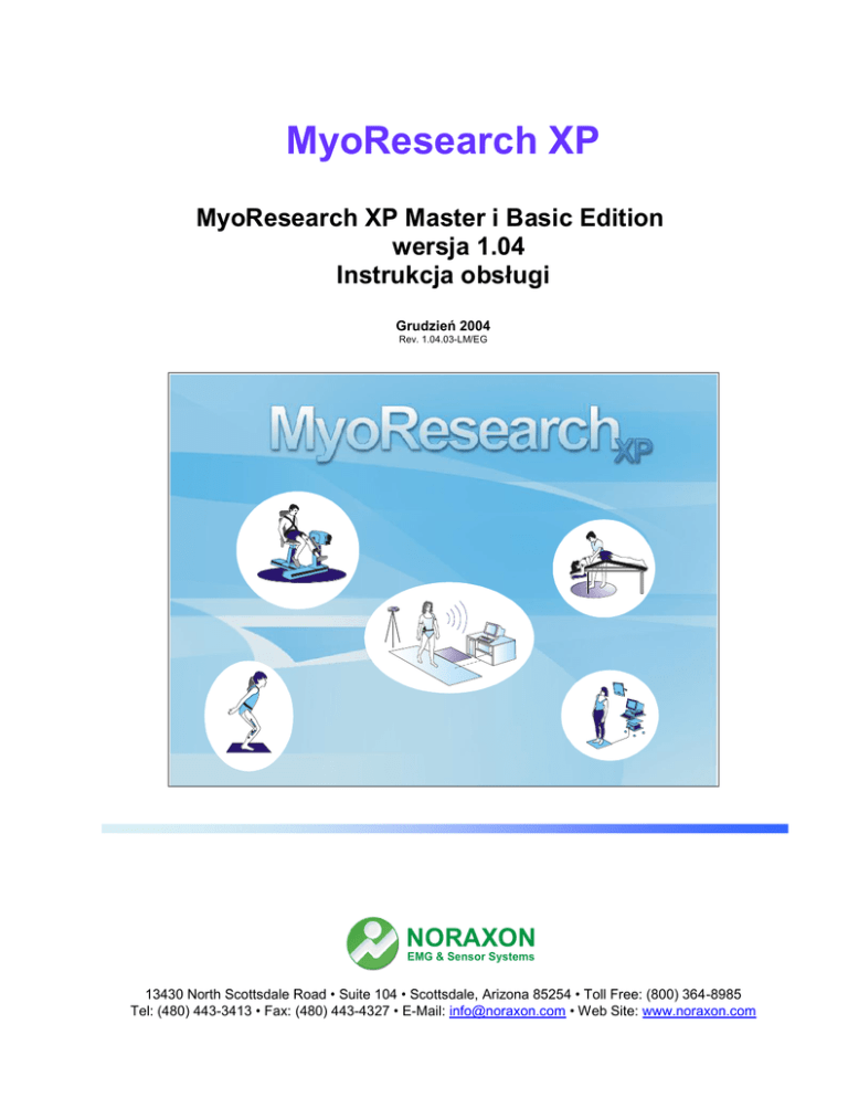 MyoResearch XP MyoResearch XP Master i Basic Edition wersja 1.04 Instrukcja obsługi Grudzień 2004 Rev. 1.04.03-LM/EG OR N XO A NU .SA .,INC . NORAXON EMG & Sensor Systems 13430 North Scottsdale Road • Suite 104 • Scottsdale, Arizona 85254 • Toll Free: (800) 364-8985 Tel: (480) 443-3413 • Fax: (480) 443-4327 • E-Mail: [email protected] • Web Site: www.noraxon.com NORAXON MyoResearch XP Master Version Manual EMG & Sensor Systems Spis treści: WSTĘP ..................................................................................................................................................... 8 MENU BAZY DANYCH ........................................................................................................................ 9 SZYBKIE URUCHAMIANIE ....................................................................................................................... 9 ELEMENTY OKNA GŁÓWNEGO: ............................................................................................................. 10 Elementy “Projekt” (Project”), “Nowy” (“New”) i “Organizuj” (“Organize") .......................... 10 Badany (Subject) – Nowy (New) ..................................................................................................... 13 Lista Badanych (Subject List) ......................................................................................................... 13 Narzędzia Listy Badanych:.............................................................................................................. 14 Informacje o Badanym (Subject Info) ............................................................................................. 14 Lista Wyników (Records List) ......................................................................................................... 15 Informacje o Wynikach (Record Info) ............................................................................................. 17 Obróbka sygnału pakietu (Batch signal processing) ...................................................................... 19 ELEMENTY PASKA NARZĘDZI PO PRAWEJ STRONIE: ............................................................................. 20 Kopiuj (Copy) .................................................................................................................................. 20 Eksport/Import ................................................................................................................................ 22 Usuń (Delete) .................................................................................................................................. 25 Przycisk Baza Danych Normatywnych (Normative Database) ....................................................... 25 PRZYCISKI DOLNEGO PASKA NARZĘDZI .............................................................................................. 25 Pomiar (Measure) ........................................................................................................................... 26 Przeglądanie/Analiza (View/Analyze) ............................................................................................. 26 Wyjdź (Exit) ..................................................................................................................................... 26 BAZA DANYCH NORMATYWNYCH (NORMATIVE DATABASE) .............................................................. 26 Wstęp ............................................................................................................................................... 26 Opis Menu Bazy Danych Normatywnych ........................................................................................ 28 MENU USTAWIEŃ POMIARU ......................................................................................................... 33 SZYBKIE URUCHAMIANIE ..................................................................................................................... 33 ELEMENTY OKNA GŁÓWNEGO: ............................................................................................................. 34 Elementy “Projekt” (Project”), “Nowy” (“New”) i “Organizuj” (“Organize") .......................... 34 Organizuj ("Organize") zawiera wszystkie funkcje niezbędne do zarządzania Katalogiem Projektu: (Edytuj, Kopiuj, Usuń). Funkcje te opisano dokładniej w Menu Pomocy Bazy Danych. ....................................... 34 Badany (Subject) – Nowy (New) ..................................................................................................... 34 Mapy Mięśni/Urządzeń ................................................................................................................... 35 Lista kanałów .................................................................................................................................. 35 Narzędzia lokalne dla listy kanałów................................................................................................ 37 Informacje (Info) ............................................................................................................................. 37 ELEMENTY PASKA NARZĘDZI PO PRAWEJ STRONIE ............................................................................. 38 Ikony Aplikacja (Application) i Konfiguracja (Configuration)....................................................... 38 Opcje Pomiarowe (Measurement Options) ..................................................................................... 38 Opcje Zapisu (Recording Options) ................................................................................................. 38 Wykresy Ciągłe (Continuous Traces) ......................................................................................... 39 Rejestracja okresowa (Periodic Recording) (tylko Master Edition) ........................................... 40 Rejestrowanie Aktywności Mnogic
