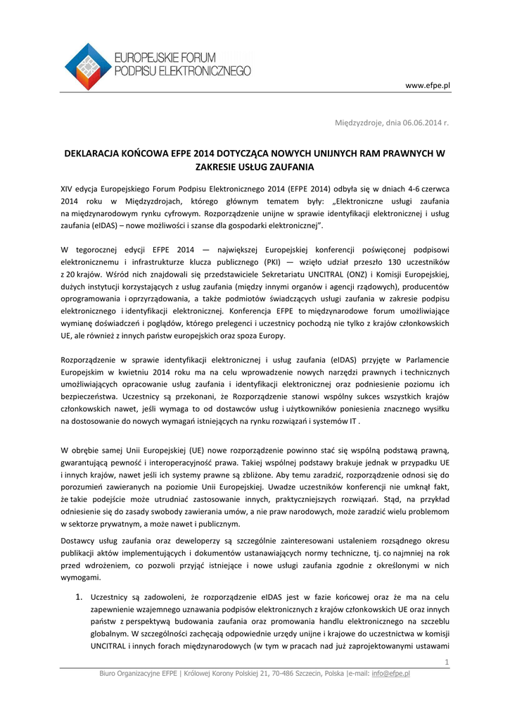 www.efpe.pl Międzyzdroje, dnia 06.06.2014 r. DEKLARACJA KOŃCOWA EFPE 2014 DOTYCZĄCA NOWYCH UNIJNYCH RAM PRAWNYCH W ZAKRESIE USŁUG ZAUFANIA XIV edycja Europejskiego Forum Podpisu Elektronicznego 2014 (EFPE 2014) odbyła się w dniach 4-6 czerwca 2014 roku w Międzyzdrojach, którego głównym tematem były: „Elektroniczne usługi zaufania na międzynarodowym rynku cyfrowym. Rozporządzenie unijne w sprawie identyfikacji elektronicznej i usług zaufania (eIDAS) – nowe możliwości i szanse dla gospodarki elektronicznej”. W tegorocznej edycji EFPE 2014 — największej Europejskiej konferencji poświęconej podpisowi elektronicznemu i infrastrukturze klucza publicznego (PKI) — wzięło udział przeszło 130 uczestników z 20 krajów. Wśród nich znajdowali się przedstawiciele Sekretariatu UNCITRAL (ONZ) i Komisji Europejskiej, dużych instytucji korzystających z usług zaufania (między innymi organów i agencji rządowych), producentów oprogramowania i oprzyrządowania, a także podmiotów świadczących usługi zaufania w zakresie podpisu elektronicznego i identyfikacji elektronicznej. Konferencja EFPE to międzynarodowe forum umożliwiające wymianę doświadczeń i poglądów, którego prelegenci i uczestnicy pochodzą nie tylko z krajów członkowskich UE, ale również z innych państw europejskich oraz spoza Europy. Rozporządzenie w sprawie identyfikacji elektronicznej i usług zaufania (eIDAS) przyjęte w Parlamencie Europejskim w kwietniu 2014 roku ma na celu wprowadzenie nowych narzędzi prawnych i technicznych umożliwiających opracowanie usług zaufania i identyfikacji elektronicznej oraz podniesienie poziomu ich bezpieczeństwa. Uczestnicy są przekonani, że Rozporządzenie stanowi wspólny sukces wszystkich krajów członkowskich nawet, jeśli wymaga to od dostawców usług i użytkowników poniesienia znacznego wysiłku na dostosowanie do nowych wymagań istniejących na rynku rozwiązań i systemów IT . W obrębie samej Unii Europejskiej (UE) nowe rozporządzenie powinno stać się wspólną podstawą prawną, gwarantującą pewność i interoperacyjność prawa. Takiej wspólnej podstawy brakuje jednak w przypadku UE i innych krajów, nawet jeśli ich systemy prawne są zbliżone. Aby temu zaradzić, rozporządzenie odnosi się do porozumień zawieranych na poziomie Unii Europejskiej. Uwadze uczestników konferencji nie umknął fakt, że takie podejście może utrudniać zastosowanie innych, praktyczniejszych rozwiązań. Stąd, na przykład odniesienie się do zasady swobody zawierania umów, a nie praw narodowych, może zaradzić wielu problemom w sektorze prywatnym, a może nawet i publicznym. Dostawcy usług zaufania oraz deweloperzy są szczególnie zainteresowani ustaleniem rozsądnego okresu publikacji aktów implementujących i dokumentów ustanawiających normy techniczne, tj. co najmniej na rok przed wdrożeniem, co pozwoli przyjąć istniejące i nowe usługi zaufania zgodnie z określonymi w nich wymogami. 1. Uczestnicy są zadowoleni, że rozporządzenie eIDAS jest w fazie końcowej oraz że ma na celu zapewnienie wzajemnego uznawania podpisów elektronicznych z krajów członkowskich UE oraz innych państw z perspektywą budowania zaufania oraz promowania handlu elektronicznego na szczeblu globalnym. W szczególności zachęcają odpowiednie urzędy unijne i krajowe do uczestnictwa w komisji UNCITRAL i innych forach międzynarodowych (w tym w pracach nad już zaprojektowanymi ustawami 1 Biuro Organizacyjne EFPE | Królowej Korony Polskiej 21, 70-486 Szczecin, Polska |e-mail: [email protected] www.efpe.pl modelowymi i konwencjami o transakcjach elektronicznych) po to, aby zapewnić, że rozporządzenie eIDAS zapoczątkuje również transakcje elektroniczne z podmiotami zlokalizowanymi poza UE. W ten sposób UE nie będzie wykluczona z mechanizmów handlu międzynarodowego w szerszym ujęciu. 2. Uczestnicy zwracają uwagę na niedawne przystąpienie przez Federację Rosyjską do Konwencji Organizacji Narodów Zjednoczonych o wykorzystywaniu komunikacji elektronicznej w kontraktach międzynarodowych z 2005 roku, która zapewnia podstawy prawne do wielostronnego, wzajemnego uznawania podpisów elektronicznych oraz zachęca państwa i inne podmioty do przystąpienia do niej po to, aby ustanowić ramy prawne umożliwiające globalny handel elektroniczny. 3. Uczestnicy Konferencji zwracają uwagę na konieczność dostosowania przez kraje członkowskie prawa krajowego, infrastruktury krajowej oraz procedur organizacyjnych do wymagań Rozporządzenia. 4. Wielokrotnie zwracano też uwagę na potrzebę zastosowania kompleksowego podejścia do wdrożenia zmian legislacyjnych w krajowych ramach prawnych. Ignorowanie faktu, że zmianę jednego aktu należy interpretować w kontekście zmian w powiązanych z nim przepisów i regulacji, może przynieść przeciwne skutki, tj. obniżyć rozwój usług związanych z podpisem elektronicznym oraz konkurencyjność. W wyniku tego mogą pojawić się trudności w rozprzestrzenianiu podpisu elektronicznego i identyfikacji elektronicznej. 5. Uczestnicy konferencji zalecają również, aby urzędy publiczne, sądy i inne strony zainteresowane zastosowały funkcjonalne podejście do interpretacji postanowień rozporządzenia eIDAS. W ten sposób zostanie osiągnięty ogólny cel rozporządzenia — umożliwienie podejścia do bezpiecznych, interoperacyjnych usług zaufania. 6. Zaznaczono też, że ustanowienie użytecznych ram dla usług zaufania należy połączyć z łatwymi w obsłudze narzędziami, które zapewnią jasne zrozumienie poziomu zaufania świadczonych usług. 7. Uczestnicy powtarzają przekonanie wyrażane na podczas poprzednich konferencji, że administracja publiczna powinna w coraz większym stopniu polegać na rozwiązaniach komercyjnych oferowanych przez dostawców usług prowadzących działalność na rynku cyfrowym. Rozwiązania te są oparte na sprawdzonych modelach i standardach europejsk