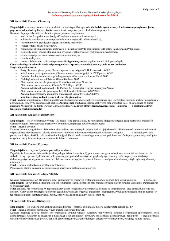 Załącznik nr 2 Szczecińskie Konkursy Przedmiotowe dla uczniów szkół gimnazjalnych Informacje dotyczące poszczególnych konkursów 2012/2013 XII Szczeciński Konkurs Chemiczny Etap miejski – zadania otwarte, test uzupełnień, zadania typu fałsz –prawda, nie będzie pytań testowych wielokrotnego wyboru z jedną poprawną odpowiedzią. Podczas konkursu uczniowie mogą korzystać z kalkulatorów prostych. Konkurs obejmuje cały materiał chemii w gimnazjum oraz zagadnienia: • mol, liczba Avogadro, masa i objętość molowa w warunkach normalnych, • obliczenia stechiometryczne na podstawie wzoru cząsteczki i równania reakcji, • stęŜenie molowe, przeliczanie stęŜeń, mieszanie roztworów, • reakcje redoks, bilans elektronowy, • właściwości utleniające kwasu azotowego(V) i siarkowego(VI), manganianu(VII) potasu i dichromianu(VI) potasu, • elektrolity słabe i mocne, stopień i stała dysocjacji, pH roztworów, hydroliza soli, wodorosole, • efekty energetyczne towarzyszące reakcjom chemicznym, • chemia analityczna, • izomeria łańcuchowa, połoŜenia podstawnika i geometryczna w węglowodorach i ich pochodnych. Część zadań będzie odnosiła się do załączonego tekstu i sprawdzała umiejętność czytania ze zrozumieniem. Przykładowa literatura : - Testy dla ucznia gimnazjum-„Chemia- sprawdziany osiągnięć”- H. Piankowska WSiP - KsiąŜka nauczyciela gimnazjum -„Chemia- sprawdziany osiągnięć ”- J.W.Dymara WSiP - Zadania z konkursów chemicznych dla gimnazjalistów – praca zbiorowa Toruń 2006 - Dialektyka chemiczna – Zdzisław Głowacki- Tutor 2002 - Zbiór zadań z chemii dla gimnazjum Teresa Kulawik i inni Nowa Era - Zbiór zadań z rozwiązaniami „Chemia”- M.A.Bigos WSiP - Zadania od łatwych do trudnych – K .Pazdro, M. Koszmider Oficyna Edukacyjna Pazdro - Zbiór zadań z chemii dla gimnazjum 1-3, J Głowacki, T. Szrama WSiP 2003 - Zadania dla uczestników konkursów chemicznych-Anna Rygielska OE1995 - oraz inne zbiory zadań i testów z chemii dla gimnazjum Finał - zadanie laboratoryjne, w którym punktowane będzie: prawidłowe wykrycie substancji, opis - przedstawienie toku analizy i uzasadnienie z równaniami jonowymi zachodzących reakcji. Zagadnienia: praktyczna chemia analityczna oraz wszystkie treści obowiązujące na etapie miejskim. Wskazówki do finału (wykaz jonów, przykładowe zadania) http://chemia.lo2.szczecin.pl/- konkursy ; e-mail kontaktowy: [email protected] XII Szczeciński Konkurs Matematyczny Etap miejski – test wielokrotnego wyboru (20 zadań ) typu prawda-fałsz, do rozwiązania którego niezbędna jest podstawowa znajomość elementów logiki (prawdziwość: alternatywy, koniunkcji, implikacji, równowaŜności zdań). Finał – zadania otwarte Konkurs obejmuje zagadnienia :działania w zbiorze liczb rzeczywistych, pojęcie funkcji i jej własności, układy równań liniowych z dwiema i większą liczbą niewiadomych , układy nierówności liniowych z dwiema niewiadomymi, własności trójkątów i czworokątów, pola powierzchni figur płaskich, pola powierzchni i objętości brył, przekształcenia geometryczne, podobieństwo, funkcje trygonometryczne kątów ostrych w trójkącie prostokątnym, twierdzenie Talesa i odwrotne. XII Szczeciński Konkurs Fizyczny Etap miejski- test wyboru / jedna odpowiedź prawidłowa/. Zagadnienia: kinematyka i dynamika (ruch w jednym i dwóch wymiarach), praca, moc, energia mechaniczna, własności mechaniczne ciał stałych, cieczy i gazów, hydrostatyka, pole grawitacyjne, pole elektrostatyczne, prąd stały i przemienny, pole magnetyczne i indukcja elektromagnetyczna, drgania mechaniczne i fale mechaniczne, optyka fizyczna i falowa, termodynamika, elementy fizyki jądrowej, elementy astronomii. Finał – zadania rachunkowe i problemowe (otwarte). Podczas obu etapów konkursu uczniowie mogą korzystać z kalkulatorów prostych. XII Szczeciński Konkurs Młodego Poligloty i niemiecki. Konkurs przeznaczony jest dla uczniów szkół gimnazjalnych znających w stopniu minimum dobrym dwa języki: angielski Etap miejski - sprawdzana będzie umiejętność rozumienia tekstu słuchanego oraz znajomość waŜniejszych struktur leksykalno-gramatycznych w dwóch językach. Finał konkursu ma formę ustną. W tej części kaŜdy uczeń losuje zestaw i rozmawia z komisją na temat ilustracji oraz tematyki, którego ona dotyczy. KaŜdy uczeń przystępuje do dwóch egzaminów ustnych: w języku angielskim i niemieckim. Przykładowe zagadnienia do dyskusji w tej części Konkursu: zainteresowania, hobby, czas wolny, rodzina, zakupy, szkoła, sport itp. VI Szczeciński Konkurs Historyczny Etap miejski – test wyboru oraz analiza tekstu źródłowego – materiał obejmujący historię od staroŜytności do 1918 r. Finał – zadania otwarte i zamknięte, w tym analiza tekstów źródłowych. Konkurs obejmuje historię państw, ich organizacji, struktur władzy, systemów politycznych, struktur i organizacji społeczeństw, Ŝycia gospodarczego, wydarzeń politycznych i militarnych oraz konfliktów i kryzysów społecznych, gospodarczych, religijnych i ideologicznych, działalność najwaŜniejszych postaci, dynastii, grup społecznych, Ŝycia religijnego, osiągnięć cywilizacyjnych, osiągnięć kultury i sztuki. 1 Załącznik nr 2 VII Szczeciński Konkurs Polonistyczny Etap miejski – test. Cały materiał z języka polskiego w gimnazjum, a ponadto: • podstawowe pojęcia procesu historycznoliterackiego: proces historycznoliteracki, periodyzacja, okres literacki, prąd literacki; • periodyzacja „szkolna”, inspirowana „sinusoidą KrzyŜanowskiego”; • periodyzacja trójdzielna (J. Ziomek), związane z nią trzy modele literatury; • znajomość pojęć: teoria literatury, historia literatury, poetyka, interpretacja; • podstawowe środki stylistyczne i tropy; • wiersz sylabiczny, wiersz nieregularny, wiersz wolny (umiejętność charakterystyki 