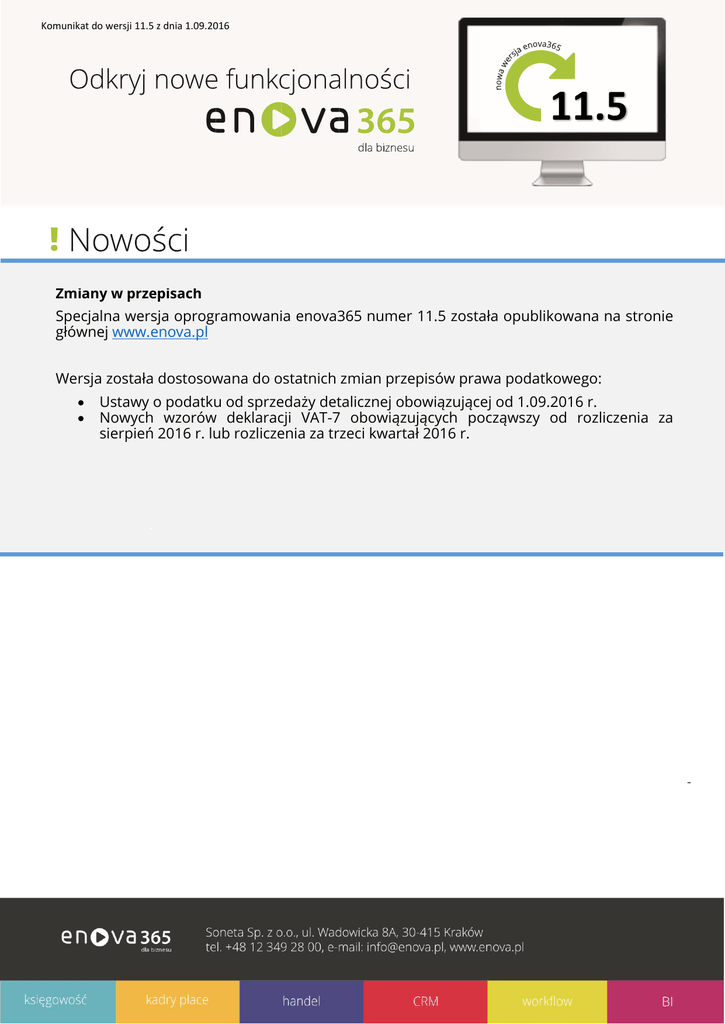 Komunikat do wersji 11.5 z dnia 1.09.2016 11.5 Zmiany w przepisach Specjalna wersja oprogramowania enova365 numer 11.5 została opublikowana na stronie głównej www.enova.pl Wersja została dostosowana do ostatnich zmian przepisów prawa podatkowego: Ustawy o podatku od sprzedaży detalicznej obowiązującej od 1.09.2016 r. Nowych wzorów deklaracji VAT-7 obowiązujących począwszy od rozliczenia za sierpień 2016 r. lub rozliczenia za trzeci kwartał 2016 r.