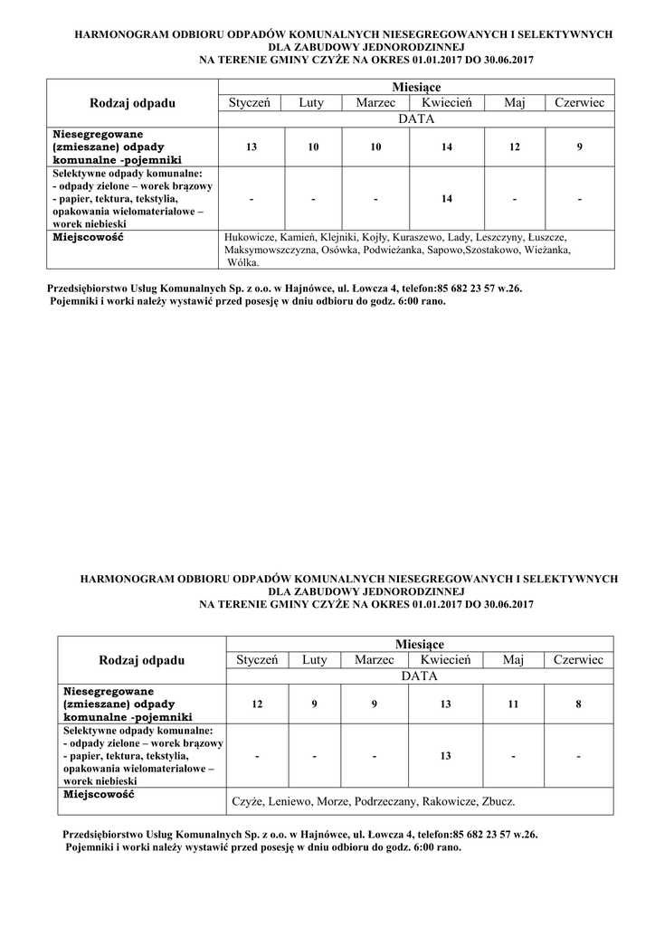 HARMONOGRAM ODBIORU ODPADÓW KOMUNALNYCH NIESEGREGOWANYCH I SELEKTYWNYCH DLA ZABUDOWY JEDNORODZINNEJ NA TERENIE GMINY CZYŻE NA OKRES 01.01.2017 DO 30.06.2017 Rodzaj odpadu Niesegregowane (zmieszane) odpady komunalne -pojemniki Selektywne odpady komunalne: - odpady zielone – worek brązowy - papier, tektura, tekstylia, opakowania wielomateriałowe – worek niebieski Miejscowość Miesiące Marzec Kwiecień DATA Styczeń Luty 13 10 10 - - - Maj Czerwiec 14 12 9 14 - - Hukowicze, Kamień, Klejniki, Kojły, Kuraszewo, Lady, Leszczyny, Łuszcze, Maksymowszczyzna, Osówka, Podwieżanka, Sapowo,Szostakowo, Wieżanka, Wólka. Przedsiębiorstwo Usług Komunalnych Sp. z o.o. w Hajnówce, ul. Łowcza 4, telefon:85 682 23 57 w.26. Pojemniki i worki należy wystawić przed posesję w dniu odbioru do godz. 6:00 rano. HARMONOGRAM ODBIORU ODPADÓW KOMUNALNYCH NIESEGREGOWANYCH I SELEKTYWNYCH DLA ZABUDOWY JEDNORODZINNEJ NA TERENIE GMINY CZYŻE NA OKRES 01.01.2017 DO 30.06.2017 Rodzaj odpadu Niesegregowane (zmieszane) odpady komunalne -pojemniki Selektywne odpady komunalne: - odpady zielone – worek brązowy - papier, tektura, tekstylia, opakowania wielomateriałowe – worek niebieski Miejscowość Miesiące Marzec Kwiecień DATA Styczeń Luty 12 9 9 - - - Maj Czerwiec 13 11 8 13 - - Czyże, Leniewo, Morze, Podrzeczany, Rakowicze, Zbucz. Przedsiębiorstwo Usług Komunalnych Sp. z o.o. w Hajnówce, ul. Łowcza 4, telefon:85 682 23 57 w.26. Pojemniki i worki należy wystawić przed posesję w dniu odbioru do godz. 6:00 rano. HARMONOGRAM ODBIORU ODPADÓW KOMUNALNYCH SELEKTYWNYCH DLA NA TERENIE GMINY CZYŻE NA OKRES OD 01.01.2017 r. DO 30.06.2017r. Rodzaj odpadu Tworzywa sztuczne, metale-pojemniki Szkło – pojemniki Miejscowość Styczeń Luty Marzec Miesiące Kwiecień Data Maj Czerwiec 2 1 1 4 2,16 6,20 11 8 8 5 10 13 Gmina Czyże