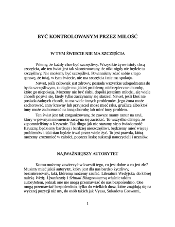 BYĆ KONTROLOWANYM PRZEZ MIŁOŚĆ W TYM ŚWIECIE NIE MA SZCZĘŚCIA Wiemy, że każdy chce być szczęśliwy. Wszystkie żywe istoty chcą szczęścia, ale ten świat jest tak skonstruowany, że nikt nigdy nie będzie tu szczęśliwy. Nie możemy być szczęśliwi. Powinniśmy zdać sobie z tego sprawę, że tutaj, w tym świecie, nie ma szczęścia i nie ma spokoju. Nawet, jeśli człowiek jest zdrowy, posiada wszystkie udogodnienia do bycia szczęśliwym, to ciągle ma jakieś problemy, niebezpieczne choroby, które go niepokoją. Możemy nie być słabi, dopóki jesteśmy młodzi, ale wiele chorób pojawi się, kiedy tylko zaczynamy się starzeć. Nawet, jeśli ktoś nie posiada żadnych chorób, to ma wiele innych problemów. Jego żona może zachorować, inny krewny lub przyjaciel może mieć raka, gruźlicę albo ktoś inny może zachorować na inną chorobę lub mieć inny problem. Ten świat jest tak zorganizowany, że zawsze mamy sznur na szyi, który w pewnym momencie zaczyna się zaciskać. To wszystko dlatego, że zapomnieliśmy o Krysznie. Tak długo jak nie staramy się o świadomość Kryszny, będziemy bardziej i bardziej nieszczęśliwi, będziemy mieć więcej problemów i taki stan będzie trwał przez wiele żyć. To jest prawda, którą możemy zrozumieć w całości, poprzez łaskę sukcesji nauczycieli i uczniów. NAJWAŻNIEJSZY AUTORYTET Komu możemy zawierzyć w kwestii tego, co jest dobre a co jest złe? Musimy mieć jakiś autorytet, który jest dla nas bardzo życzliwy, bezinteresowny, taki, któremu możemy zaufać. Literatura Wedyjska, do której należą Wedy, Upaniszady i Śrimad-Bhagavatam są właśnie takim autorytetem, jednak one nie mogą przemawiać do nas bezpośrednio. One mogą przemawiać bezpośrednio, tylko do wielkich dusz, które znajdują się na wyższej pozycji niż my, do osób takich jak Vyasa, Sukadeva Goswami, 1 Valmiki i Parasara. Jeśli bierzemy u nich lekcje, słuchamy od nich i czytamy pod ich kierunkiem, wtedy jesteśmy w stanie coś zrozumieć. Jeśli jednak sami czytamy, Śrimad-Bhagavatam, możemy być niepokojeni przez pożądanie i ignorancję. Wielcy mędrcy, którzy jako pierwsi wygłosili Śrimad-Bhagavatam ustanowili ten przykład. Jedynie instruowali oni swoich uczniów, po tym jak sami słuchali i zrealizowali te nauki w swoim życiu. W ten sposób byli oni w stanie wygłaszać Śrimad-Bhagavatam z platformy realizacji. Bhagavatam inspirowało ich. Powinniśmy próbować podążać za ich przykładem, w ten sposób możemy mieć mocną wiarę w pisma takie jak Wedy, Upaniszady, Bhagavad-Gita, czy Śrimad-Bhagavatam. Głęboka prawda zawarta w tych pismach jest przekazywana od niepamiętnych czasów, w dół poprzez nieprzerwaną sukcesję uczniów i nauczycieli, która została zapoczątkowana przez Pana Brahmę – wtórnego stwórcę tego wszechświata. W czasach nowożytnych tradycja ta była podtrzymywana przez Śrila Bhaktisiddhantę Sarasvati Thakura a następnie przez jego uczniów takich jak nasz Gurudewa i Śrila Bhaktivedanta Swami Maharaja. Mamy możliwość jej realizacji, szczególnie wtedy, kiedy studiujemy pisma, które zostały przyjęte poprzez tą sukcesję uczniów i nauczycieli. Pisma stwierdzają ponad wszelką wątpliwość, że Kryszna (znany również jako Hari) jest Najwyższą Absolutną Prawdą. Mówiąc inaczej, Kryszna jest Najwyższą Osobą Boga. Jest On oceanem transcendentalnej łagodności i transcendentalnych relacji. Posiada On w pełni wszystkie moce, możliwości, potencjały. Jest On również bardzo miłosierny i jest również źródłem oraz podstawą całej naszej egzystencji. DWA RODZAJE DUSZ W TYM ŚWIECIE My – wszystkie żywe istoty, we wszystkich gatunkach życia – jesteśmy duchowi w esencji, jesteśmy duszami. Istnieją dwa rodzaje dusz: wyzwolone dusze i uwarunkowane dusze. Wyzwolone dusze nigdy nie zapominają o Krysznie. One zawsze służą Mu z miłością i oddaniem. One nawet nie wiedzą, czym jest materialny świat. Niestety my uwarunkowane dusze, zapomnieliśmy o Krysznie. Właśnie dlatego wysłał On nas do tego świata, w którym jesteśmy spowici poprzez iluzoryczną energię – mayę. 2 Maya mówi – „Och, chcesz imitować Krysznę, chcesz skosztować jak smakuje ten świat, chcesz się nim cieszyć? Właśnie, dlatego zapomniałeś o Nim? Ja ci pomogę. Dam Ci każdy rodzaj bogactwa, dam ci męża, żonę, braci, siostry i wiele, wiele innych rzeczy. Będziesz mógł się do nich przywiązać i zapomnieć o Krysznie, coraz bardziej i bardziej.” Wtedy przywiązujemy się do tych rzeczy i to przywiązanie staje się przyczyną tego całego cierpienia. Powinniśmy wiedzieć, że całe to nasze przywiązanie, miłość i oddanie w tym świecie, są wypaczonym odzwierciedleniem naszej oryginalnej miłości do Kryszny. Jako uwarunkowane dusze w materialnym świecie, myślimy: „Mam tak wiele własności, tak wiele należy do mnie, jestem człowiekiem czynu na polu wielu działań. Jestem ojcem; Jestem matką; Jestem mężem; Jestem żoną; Jestem synem; Jestem córką; Jestem królem.” W ten sposób tworzymy sobie wiele fałszywych wizerunków. Poprzez wpływ wiedźmy mayi czasami wznosimy się a czasami upadamy. Ona stworzyła wiele chorób i problemów, aby nas nękać. Musimy jasno zrozumieć, w czym rzecz, że bez względu na zajmowaną pozycję w życiu, będziemy mieć problemy. Osoba może być Hitlerem czy Mussolinim, może być bardzo biedna albo może być kimś pomiędzy, ale w każdym przypadku będzie miała problemy, ponieważ tutaj problemy są wszędzie, na każdym kroku. „O KRYSZNO! JESTEM TWÓJ!” Śri Caitanya-caritamrta opisuje materialne cierpienia żywej istoty oraz sposób w jaki dobiegają one końca. „Kiedy uwarunkowana dusza sprzeciwia się Krysznie, w rezultacie tego wpada w materialną egzystencję, w nurt narodzin i śmierci. Wędruje tam bez celu poprzez 8.400.000 rodzajów form życia, będąc paloną poprzez trzy 