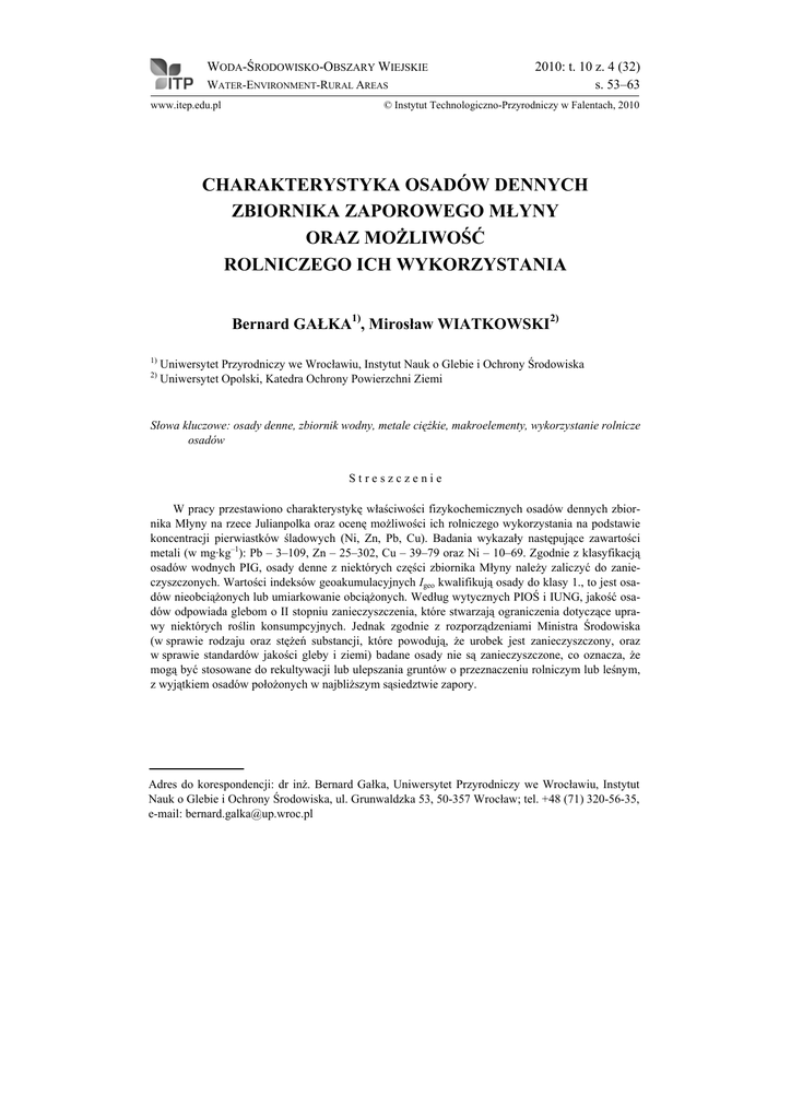 WODA-ŚRODOWISKO-OBSZARY WIEJSKIE WATER-ENVIRONMENT-RURAL AREAS www.itep.edu.pl 2010: t. 10 z. 4 (32) s. 53–63 © Instytut Technologiczno-Przyrodniczy w Falentach, 2010 CHARAKTERYSTYKA OSADÓW DENNYCH ZBIORNIKA ZAPOROWEGO MŁYNY ORAZ MOŻLIWOŚĆ ROLNICZEGO ICH WYKORZYSTANIA Bernard GAŁKA1), Mirosław WIATKOWSKI2) 1) 2) Uniwersytet Przyrodniczy we Wrocławiu, Instytut Nauk o Glebie i Ochrony Środowiska Uniwersytet Opolski, Katedra Ochrony Powierzchni Ziemi Słowa kluczowe: osady denne, zbiornik wodny, metale ciężkie, makroelementy, wykorzystanie rolnicze osadów Streszczenie W pracy przestawiono charakterystykę właściwości fizykochemicznych osadów dennych zbiornika Młyny na rzece Julianpolka oraz ocenę możliwości ich rolniczego wykorzystania na podstawie koncentracji pierwiastków śladowych (Ni, Zn, Pb, Cu). Badania wykazały następujące zawartości metali (w mg·kg–1): Pb – 3–109, Zn – 25–302, Cu – 39–79 oraz Ni – 10–69. Zgodnie z klasyfikacją osadów wodnych PIG, osady denne z niektórych części zbiornika Młyny należy zaliczyć do zanieczyszczonych. Wartości indeksów geoakumulacyjnych Igeo kwalifikują osady do klasy 1., to jest osadów nieobciążonych lub umiarkowanie obciążonych. Według wytycznych PIOŚ i IUNG, jakość osadów odpowiada glebom o II stopniu zanieczyszczenia, które stwarzają ograniczenia dotyczące uprawy niektórych roślin konsumpcyjnych. Jednak zgodnie z rozporządzeniami Ministra Środowiska (w sprawie rodzaju oraz stężeń substancji, które powodują, że urobek jest zanieczyszczony, oraz w sprawie standardów jakości gleby i ziemi) badane osady nie są zanieczyszczone, co oznacza, że mogą być stosowane do rekultywacji lub ulepszania gruntów o przeznaczeniu rolniczym lub leśnym, z wyjątkiem osadów położonych w najbliższym sąsiedztwie zapory. Adres do korespondencji: dr inż. Bernard Gałka, Uniwersytet Przyrodniczy we Wrocławiu, Instytut Nauk o Glebie i Ochrony Środowiska, ul. Grunwaldzka 53, 50-357 Wrocław; tel. +48 (71) 320-56-35, e-mail: [email protected] 54 Woda-Środowisko-Obszary Wiejskie t. 10 z. 4 (32) WSTĘP Zbiorniki wód stojących gromadzą, w formie osadów dennych, część materiału spływającego z terenu zlewni [ULRICH i in., 2000; WIATKOWSKI i in., 2008]. Skład chemiczny osadów zbiornika wodnego zależy od rodzaju utworów budujących jej zlewnię i od gospodarki prowadzonej przez człowieka. Jednym z wyznaczników nasilenia antropopresji są metale ciężkie odprowadzane do wód powierzchniowych ze ściekami przemysłowymi i komunalnymi oraz zmywane z pól i łąk, gdzie dostają się jako domieszki nawozów i środków ochrony roślin, z transportu oraz z emisji pyłowych trafiających do atmosfery [KAJAK, 2001; STRUTYŃSKI, ŁOJEK, 2002]. Metale ciężkie dopływające z wodami rzecznymi gromadzą się w osadach dennych w wyniku procesów sorpcji oraz sedymentacji materii mineralnej i organicznej. Ważną cechą, która wyróżnia metale ciężkie z innych substancji niepożądanych lub toksycznych jest to, że nie ulegają one biodegradacji, a jedynie biotransformacji [WOJTKOWSKA i in., 2005]. Metale oraz inne substancje mogą być unieruchamiane w osadach nawet na długi czas, liczony w dziesiątkach lub setkach lat [DOBICKI, 2004; POLECHOŃSKI, 2004]. Zjawisko zamulania zbiorników ma nie tylko aspekt geochemiczny, ale również techniczny (funkcjonalny) i często jest analizowane w ujęciu ilościowym oraz jakościowym [BEDNARCZYK i in., 2002; KOSTECKI i in., 1998; WIATKOWSKI, KASPEREK, 2007]. W ujęciu ilościowym zmiany miąższości osadów odłożonych w zbiorniku są mierzone w określonych odstępach czasu. Umożliwia to scharakteryzowanie dynamiki sedymentacji oraz prognozowanie tempa zmniejszania się pojemności zbiornika wodnego w trakcie jego eksploatacji. W Polsce takimi pomiarami objęto kilkanaście zbiorników wodnych na południu kraju. Badania w ujęciu jakościowym obejmowały między innymi oznaczenie własności fizycznych i chemicznych namułów oraz ocenę ich zmienności w miarę oddalania się od punktu zasilania zbiornika [MADEYSKI, 2006]. Analiza aktualnej zawartości metali ciężkich zakumulowanych w osadach dennych zbiornika stanowi ważną informację, identyfikującą źródła, prędkość oraz drogi dystrybucji pierwiastków w akwenie i jest podstawą ustalenia możliwości wtórnego zanieczyszczenia wód zbiornika [KOSTECKI i in., 1998]. Szczególne znaczenie ma to w przypadku małych zbiorników wodnych, nieobjętych programem badań monitoringowych, realizowanych przez Państwowy Instytut Geologiczny i Inspekcję Ochrony Środowiska. Kontrola właściwości osadów, szczególnie w przypadku małych zbiorników wodnych, jest istotna również ze względu na szybkie tempo ich zamulania i konieczność okresowego odmulania. Po każdym odmuleniu osady muszą być właściwe zagospodarowane, zależnie od ich żyzności oraz zanieczyszczenia. Badania osadów dennych są istotne w aspekcie Ramowej Dyrektywy Wodnej, która zobowiązała kraje członkowskie Unii Europejskiej do ustanowienia krajowych programów monitoringu wód powierzchniowych, które mają dostarczyć pełnej i spójnej informacji o stanie ekologicznym i chemicznym wód w obrębie każdej zlewni, a także umożliwić przeprowadzenie klasyfikacji tych wód. B. Gałka, M. Wiatkowski: Charakterystyka osadów dennych zbiornika zaporowego… 55 Na zbiorniku retencyjnym Młyny, zlokalizowanym na rzece Julianpolka, oprócz systematycznych badań hydrologicznych i analiz jakości wody [WIATKOWSKI, 2008], za konieczne uznano także przeprowadzenie analizy zawartości metali ciężkich w osadach dennych zbiornika oraz na jego dopływie i odpływie. Dotychczas nie badano zawartości metali ciężkich w osadach dennych tego zbiornika. Celem pracy jest charakterystyka właściwości fizykochemicznych i stopnia zanieczyszczenia osadów dennych zbiornika zaporowego Młyny oraz cieku zasilaj