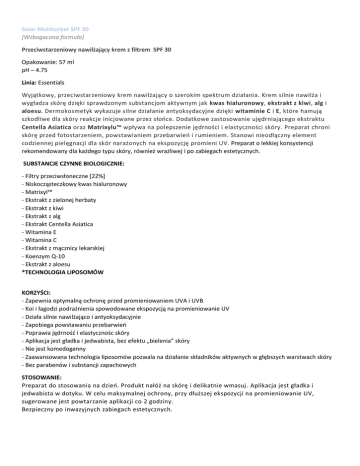 Solar Moisturizer SPF 30 [Wzbogacona formuła] Przeciwstarzeniowy nawilżający krem z filtrem SPF 30 Opakowanie: 57 ml pH – 4.75 Linia: Essentials Wyjątkowy, przeciwstarzeniowy krem nawilżający o szerokim spektrum działania. Krem silnie nawilża i wygładza skórę dzięki sprawdzonym substancjom aktywnym jak kwas hialuronowy, ekstrakt z kiwi, alg i aloesu. Dermokosmetyk wykazuje silne działanie antyoksydacyjne dzięki witaminie C i E, które hamują szkodliwe dla skóry reakcje inicjowane przez słońce. Dodatkowe zastosowanie ujędrniającego ekstraktu Centella Asiatica oraz Matrixylu™ wpływa na polepszenie jędrności i elastyczności skóry. Preparat chroni skórę przed fotostarzeniem, powstawianiem przebarwień i rumieniem. Stanowi nieodłączny element codziennej pielęgnacji dla skór narażonych na ekspozycję promieni UV. Preparat o lekkiej konsystencji rekomendowany dla każdego typu skóry, również wrażliwej i po zabiegach estetycznych. SUBSTANCJE CZYNNE BIOLOGICZNIE: - Filtry przeciwsłoneczne [22%] - Niskocząsteczkowy kwas hialuronowy - Matrixyl™ - Ekstrakt z zielonej herbaty - Ekstrakt z kiwi - Ekstrakt z alg - Ekstrakt Centella Asiatica - Witamina E - Witamina C - Ekstrakt z mącznicy lekarskiej - Koenzym Q-10 - Ekstrakt z aloesu *TECHNOLOGIA LIPOSOMÓW KORZYŚCI: - Zapewnia optymalną ochronę przed promieniowaniem UVA i UVB - Koi i łagodzi podrażnienia spowodowane ekspozycją na promieniowanie UV - Działa silnie nawilżająco i antyoksydacyjnie - Zapobiega powstawaniu przebarwień - Poprawia jędrność i elastycznośc skóry - Aplikacja jest gładka i jedwabista, bez efektu „bielenia” skóry - Nie jest komedogenny - Zaawansowana technologia liposomów pozwala na działanie składników aktywnych w głębszych warstwach skóry - Bez parabenów i substancji zapachowych STOSOWANIE: Preparat do stosowania na dzień. Produkt nałóż na skórę i delikatnie wmasuj . Aplikacja jest gładka i jedwabista w dotyku. W celu maksymalnej ochrony, przy dłuższej ekspozycji na promieniowanie UV, sugerowane jest powtarzanie aplikacji co 2 godziny. Bezpieczny po inwazyjnych zabiegach estetycznych. Active Ingredients: Octinoxate, Oxybenzone, Octisalate, Avobenzone, Octocrylene INCI: Water (Aqua), C12-15 Alkyl Benzoate, Butylene Glycol, Octyldodecyl Neopentanoate, Caprylic/Capric Triglyceride , Sodium Hyaluronate, Camellia Sinensis Leaf Extract, Teprenone, Phenoxyethanol, Caprylyl Glycol , Ethylhexylglycerin , Hexylene Glycol, Cyclopentasiloxane, Cyclohexasiloxane, Actinidia Chinensis (Kiwi) Fruit Extract, Algae Extract, Artemisia Vulgaris Extract, Centella Asiatica Extract , Echinacea Purpurea Extract, Methyl Methacrylate/Glycol Dimethacrylate Crosspolymer, Carbomer, Yeast Polysaccharides, Acrylates/C10-30 Alkyl Acrylate Crosspolymer, Triethanolamine , PEG-8, Tocopherol , Ascorbyl Palmitate , Ascorbic Acid , Citric Acid, Sorbitan Oleate, Polysorbate 20, Palmitoyl Pentapeptide-4, Darutoside, Glycerin , Polygonum Aviculare Extract, Arctostaphylos Uva Ursi Leaf Extract , Mitracarpus Scaber Extract, Plankton Extract , Lecithin , Micrococcus Lysate, Arabidopsis Thaliana Extract , Ubiquinone, Disodium EDTA, Aloe Barbadensis Leaf Extract.