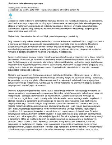 Rodzina z dzieckiem autystycznym Dodany przez Karolina Kisiel-Sneka poniedziałek, 02 kwietnia 2012 09:50 - Poprawiony niedziela, 01 kwietnia 2012 21:15 Znaczenie i rola rodziny w całokształcie rozwoju dziecka jest kwestią bezsporną. W odniesieniu do dziecka autystycznego rola rodziny wyraźnie wzrasta. Autystyk jest dzieckiem do pewnego stopnia wyjątkowym, potrzebuje od rodziców specjalnej pomocy, wymaga indywidualnego traktowania. Jego rozwój zależy od warunków środowiskowych i właściwego zaspokajania przez rodziców jego potrzeb. Najbardziej obezwładnia bezsilność i lęk przed niepewną przyszłością. Gdy rozszerza się zakres wiedzy rodziców o naturze kalectwa i możliwościach przyjścia dziecku z pomocą, zmniejsza się poczucie beznadziejności, i wzrasta chęć do działania. Dla dobra dziecka ważne jest, by rodzice chcieli i umieli okazać mu swoje zadowolenie i radość z wszelkich jego osiągnięć nawet wtedy, gdy są one wyjątkowo skromne, nie powinni myśleć o nim jako o dziecku skazanym na życie w poczuciu nieszczęścia. Istotnym elementem postaw wobec niepełnosprawności dziecka przejawianych w danej rodzinie jest wiedza. Podstawą jej formowania stanowią indywidualne doświadczenia danej jednostki oraz funkcjonujące w jej otoczeniu stereotypy. Niedostatki wiedzy o dziecku mogą kształtować nieadekwatne względem jego możliwości oczekiwania. Rodzicom na ogół trudno pogodzić się z myślą, że ich dziecko jest niepełnosprawne. Upośledzenie niezależnie od stopnia i rozwoju, przygnębia większość rodziców. Rodzina jest naturalnym środowiskiem życia dziecka i młodzieży. Stanowi system, w którym relacje między poszczególnymi członkami mają wyraźny wpływ na pozostałe osoby i sprawiają, że powstaje złożony kompleks różnokierunkowych wzajemnych zależności decydujących o sytuacji zdrowego rodzeństwa. Oddziałuje na to bez wątpienia na pierwszym stopniu dziecko autystyczne i stopień jego zaburzenia. Dziecko autystyczne jest bardzo ładne, budzi satysfakcję rodziców i akceptację otoczenia do czasu ujawnienia się pierwszych symptomów. Niepokój rodziców narasta, gdy dziecko staje się niespokojne i odbiega zachowaniem od rówieśników. Dziecko autystyczne wymaga od rodziców, szczególnie od matki poświęcenia dziecku wiele czasu, wymaga wiele cierpliwości i stałego kontaktu z dzieckiem, pozwalającego na baczne obserwowanie jego zachowania, odgadywanie jego potrzeb i ciągle znajdowanie sposobów niesienia mu pomocy. Wszyscy rodzice mają trudności ze zrozumieniem zachowania dziecka i jego relacji. Zarówno ojcowie, jak i matki, wybierając bezstresowe formy komunikowania, unikają kontaktu fizycznego z dzieckiem. Ich ograniczenie wynika z wcześniejszych negatywnych doświadczeń. Dziecko autystyczne odrzuca bowiem kontakt fizyczny, a jego zachowanie przy próbach podtrzymania tej więzi jest pełne agresji lub całkowitej obojętności. Rodzice wybierają więc takie formy relacji z dzieckiem, które są możliwe dla nich do zrealizowania i nie są związane z dodatkowym stresem. Jeżeli chodzi o matki wybierają one takie formy kontaktów z dziećmi, które nie przynoszą im dodatkowych napięć, toteż największe znaczenie przywiązują do czynności pielęgnacyjnych, zabaw z dzieckiem i kontroli jego kontaktów z innymi dziećmi. W wychowaniu dziecka autystycznego ważna jest optymalna równowaga interesów dziecka z całą rodziną. 1/4 Rodzina z dzieckiem autystycznym Dodany przez Karolina Kisiel-Sneka poniedziałek, 02 kwietnia 2012 09:50 - Poprawiony niedziela, 01 kwietnia 2012 21:15 Należy równomiernie zaangażować w opiekę i wychowanie wszystkich członków rodziny U zdrowego rodzeństwa dziecka autystycznego w chwili pojawienia się w rodzinie dziecka upośledzonego występują negatywne przeżycia emocjonalne. Nasilają się one wraz z upływem czasu, gdy rodzice poświęcają ?choremu? dziecku coraz więcej uwagi. Powoduje to, że zdrowe rodzeństwo czuje się zazdrosne. Mimo, że współczuje ?choremu? bratu lub siostrze i rozumie dlaczego potrzebuje ono tak intensywnej opieki, to jednocześnie czuje się skrzywdzone i mniej kochane. Uczucie to szczególnie potęguje się, gdy porówna sytuację swoją i swoich rówieśników. Postrzega wtedy chore rodzeństwo jako źródło swoich niepowodzeń, odczuwa zazdrość, wrogość, gniew, agresję. Będąc jednak świadomym oczekiwań rodziców, nie ujawnia tych uczuć, a nawet czuje się winne z powodu ich przeżywania Skutkiem tego jest podwyższony poziom napięcia emocjonalnego, niepewność uczuciowa o raz zaburzenie obrazu samego siebie. Małe rodzeństwo dzieci autystycznych szczególnie zaniepokojone jest możliwością zarażenia się kalectwem, a kiedy wchodzi w okres dojrzewania zaczyna obawiać się, że w przyszłości może mieć dziecko niepełnosprawne. Funkcjonowanie zdrowego rodzeństwa dzieci autystycznych uzależnione jest od wielu czynników, które kształtują: warunki życia i wychowania, relacje z otoczeniem, przebyte doświadczenia. W pierwszym rzędzie zależy ono jednak od informacji, jakie zdrowe dziecko czerpie na swój temat. Źródłem tych informacji są: rodzice, rówieśnicy, szkoła, społeczeństwo. Opinie i poglądy tych środowisk kształtowane są często przez pryzmat obecnych w życiu rodzeństwa dzieci autystycznych. Zdrowe rodzeństwo dzieci autystycznych charakteryzuje się wyraźnym poczuciem własnej tożsamości oraz pozytywną samooceną. Nie czuje się psychicznie uzależnione od autystycznego brata lub siostry ani też wykorzystywane do opieki nad nim. Kontakty chorym bratem lub siostrą oparte są na współczuciu i miłości. Rodzeństwo nie lubi, gdy autystyczne dziecko jest agresywne i rozzłoszczone. Autyzm traktuje jako ciężki, nieuleczalny stan. Mimo, iż nie są rodzeństwu obojętne potrzeby innych ludzi, na istotnym miejscu stawia własne dobro i ważne dla siebie plany życiowe. Je