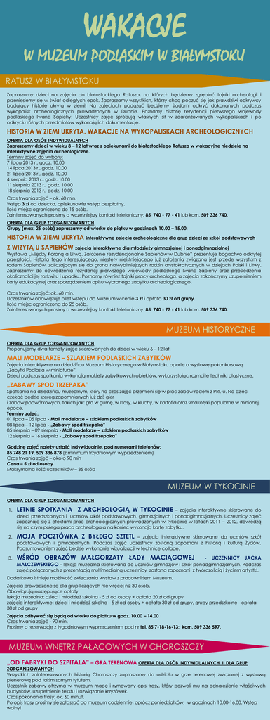WAKACJE W MUZEUM PODLASKIM W BIAŁYMSTOKU RATUSZ W BIAŁYMSTOKU Zapraszamy dzieci na zajęcia do białostockiego Ratusza, na których będziemy zgłębiać tajniki archeologii i przeniesiemy się w świat odległych epok. Zapraszamy wszystkich, którzy chcą poczuć się jak prawdziwi odkrywcy badający historię ukrytą w ziemi! Na zajęciach podążać będziemy śladami odkryć dokonanych podczas wykopalisk archeologicznych prowadzonych w Dubnie. Poznamy historię rezydencji pierwszego wojewody podlaskiego Iwana Sapiehy. Uczestnicy zajęć spróbują własnych sił w zaaranżowanych wykopaliskach i po odkryciu różnych przedmiotów wykonają ich dokumentację. HISTORIA W ZIEMI UKRYTA. WAKACJE NA WYKOPALISKACH ARCHEOLOGICZNYCH OFERTA DLA OSÓB INDYWIDUALNYCH Zapraszamy dzieci w wieku 8 – 12 lat wraz z opiekunami do białostockiego Ratusza w wakacyjne niedziele na interaktywne zajęcia archeologiczne. Terminy zajęć do wyboru: 7 lipca 2013 r., godz. 10.00 14 lipca 2013 r., godz. 10.00 21 lipca 2013 r., godz. 10.00 4 sierpnia 2013 r., godz. 10.00 11 sierpnia 2013 r., godz. 10.00 18 sierpnia 2013 r., godz. 10.00 Czas trwania zajęć – ok. 60 min. Wstęp 3 zł od dziecka, opiekunowie wstęp bezpłatny. Ilość miejsc ograniczona do 15 osób. Zainteresowanych prosimy o wcześniejszy kontakt telefoniczny: 85 740 - 77 - 41 lub kom. 509 336 740. OFERTA DLA GRUP ZORGANIZOWANYCH Grupy (max. 25 osób) zapraszamy od wtorku do piątku w godzinach 10.00 – 15.00. HISTORIA W ZIEMI UKRYTA interaktywne zajęcia archeologiczne dla grup dzieci ze szkół podstawowych Z WIZYTĄ U SAPIEHÓW zajęcia interaktywne dla młodzieży gimnazjalnej i ponadgimnazjalnej Wystawa „Między Koroną a Litwą. Założenie rezydencjonalne Sapiehów w Dubnie” prezentuje bogactwo odkrytej przeszłości. Historia tego interesującego, niestety nieistniejącego już założenia związana jest przede wszystkim z rodem Sapiehów, zaliczającym się do grona najwybitniejszych rodzin arystokratycznych w dziejach Polski i Litwy. Zapraszamy do odwiedzenia rezydencji pierwszego wojewody podlaskiego Iwana Sapiehy oraz prześledzenia okoliczności jej rozkwitu i upadku. Poznamy również tajniki pracy archeologa, a zajęcia zakończymy uzupełnieniem karty edukacyjnej oraz sporządzeniem opisu wybranego zabytku archeologicznego. Czas trwania zajęć: ok. 60 min. Uczestników obowiązuje bilet wstępu do Muzeum w cenie 3 zł i opłata 30 zł od grupy. Ilość miejsc ograniczona do 25 osób. Zainteresowanych prosimy o wcześniejszy kontakt telefoniczny: 85 740 - 77 - 41 lub kom. 509 336 740. MUZEUM HISTORYCZNE OFERTA DLA GRUP ZORGANIZOWANYCH Proponujemy dwa tematy zajęć skierowanych do dzieci w wieku 6 – 12 lat. MALI MODELARZE – SZLAKIEM PODLASKICH ZABYTKÓW Zajęcia interaktywne na dziedzińcu Muzeum Historycznego w Białymstoku oparte o wystawę pokonkursową „Zabytki Podlasia w miniaturze”. Dzieci podczas spotkania wykonają makiety zabytkowych obiektów, wykorzystując rozmaite techniki plastyczne. „ZABAWY SPOD TRZEPAKA” Spotkania na dziedzińcu muzealnym, który na czas zajęć przemieni się w plac zabaw rodem z PRL-u. Na dzieci czekać będzie szereg zapomnianych już dziś gier i zabaw podwórkowych, takich jak: gra w gumę, w klasy, w kluchy, w kartofla oraz smakołyki popularne w minionej epoce. Terminy zajęć: 01 lipca – 05 lipca - Mali modelarze – szlakiem podlaskich zabytków 08 lipca – 12 lipca - „Zabawy spod trzepaka” 05 sierpnia – 09 sierpnia - Mali modelarze – szlakiem podlaskich zabytków 12 sierpnia – 16 sierpnia - „Zabawy spod trzepaka” Godzinę zajęć należy ustalić indywidualnie, pod numerami telefonów: 85 748 21 19, 509 336 878 (z minimum trzydniowym wyprzedzeniem) Czas trwania zajęć – około 90 min Cena – 5 zł od osoby Maksymalna ilość uczestników – 35 osób MUZEUM W TYKOCINIE OFERTA DLA GRUP ZORGANIZOWANYCH 1. LETNIE SPOTKANIA Z ARCHEOLOGIĄ W TYKOCINIE 2. MOJA POCZTÓWKA Z BYŁEGO SZTETL 3. WŚRÓD OBRAZÓW MAŁGORZATY ŁADY MACIĄGOWEJ – zajęcia interaktywne skierowane do dzieci przedszkolnych i uczniów szkół podstawowych, gimnazjalnych i ponadgimnazjalnych. Uczestnicy zajęć zapoznają się z efektami prac archeologicznych prowadzonych w Tykocinie w latach 2011 – 2012, dowiedzą się na czym polega praca archeologa a na koniec wykonają kartę zabytku. – zajęcia interaktywne skierowane do uczniów szkół podstawowych i gimnazjalnych. Podczas zajęć uczestnicy zostaną zapoznani z historią i kulturą Żydów. Podsumowaniem zajęć będzie wykonanie wizualizacji w technice collage. - UCZENNICY JACKA MALCZEWSKIEGO – lekcja muzealna skierowana do uczniów gimnazjów i szkół ponadgimnazjalnych. Podczas zajęć połączonych z prezentacją multimedialną uczestnicy zostaną zapoznani z twórczością i życiem artystki. Dodatkowo istnieje możliwość zwiedzania wystaw z pracownikiem Muzeum. Zajęcia prowadzone są dla grup liczących nie więcej niż 30 osób. Obowiązują następujące opłaty: lekcja muzealna: dzieci i młodzież szkolna - 5 zł od osoby + opłata 20 zł od grupy zajęcia interaktywne: dzieci i młodzież szkolna - 5 zł od osoby + opłata 30 zł od grupy, grupy przedszkolne - opłata 30 zł od grupy Zajęcia odbywać się będą od wtorku do piątku w godz. 10.00 – 14.00 Czas trwania zajęć - 90 min. Prosimy o rezerwację z tygodniowym wyprzedzeniem pod nr tel. 85 7-18-16-13; kom. 509 336 597. MUZEUM WNĘTRZ PAŁACOWYCH W CHOROSZCZY „OD FABRYKI DO SZPITALA” – GRA TERENOWA OFERTA DLA OSÓB INDYWIDUALNYCH I DLA GRUP ZORGANIZOWANYCH Wszystkich zainteresowanych historią Choroszczy zapraszamy do udziału w grze terenowej związanej z wystawą plenerową pod takim samym tytułem. Uczestnik zabawy otrzyma w muzeum mapę i rymowany opis trasy, który pozwoli mu na odnalezienie właściwych budynków, uzupełnienie tekstu i rozwiązanie krzyżówek. Czas pokonania trasy: ok. 60 minut. Po opis trasy prosimy się zg