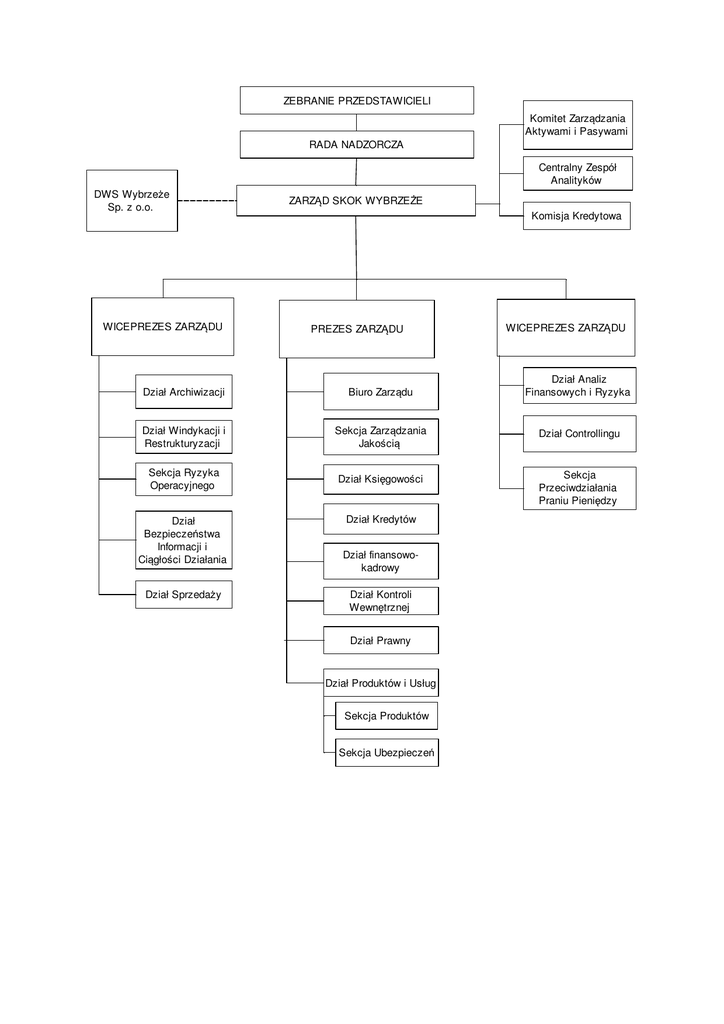 ZEBRANIE PRZEDSTAWICIELI Komitet Zarządzania Aktywami i Pasywami RADA NADZORCZA Centralny Zespół Analityków DWS Wybrzeże Sp. z o.o. WICEPREZES ZARZĄDU ZARZĄD SKOK WYBRZEŻE Komisja Kredytowa PREZES ZARZĄDU WICEPREZES ZARZĄDU Dział Analiz Finansowych i Ryzyka Dział Archiwizacji Biuro Zarządu Dział Windykacji i Restrukturyzacji Sekcja Zarządzania Jakością Dział Controllingu Sekcja Ryzyka Operacyjnego Dział Księgowości Sekcja Przeciwdziałania Praniu Pieniędzy Dział Bezpieczeństwa Informacji i Ciągłości Działania Dział Sprzedaży Dział Kredytów Dział finansowokadrowy Dział Kontroli Wewnętrznej Dział Prawny Dział Produktów i Usług Sekcja Produktów Sekcja Ubezpieczeń