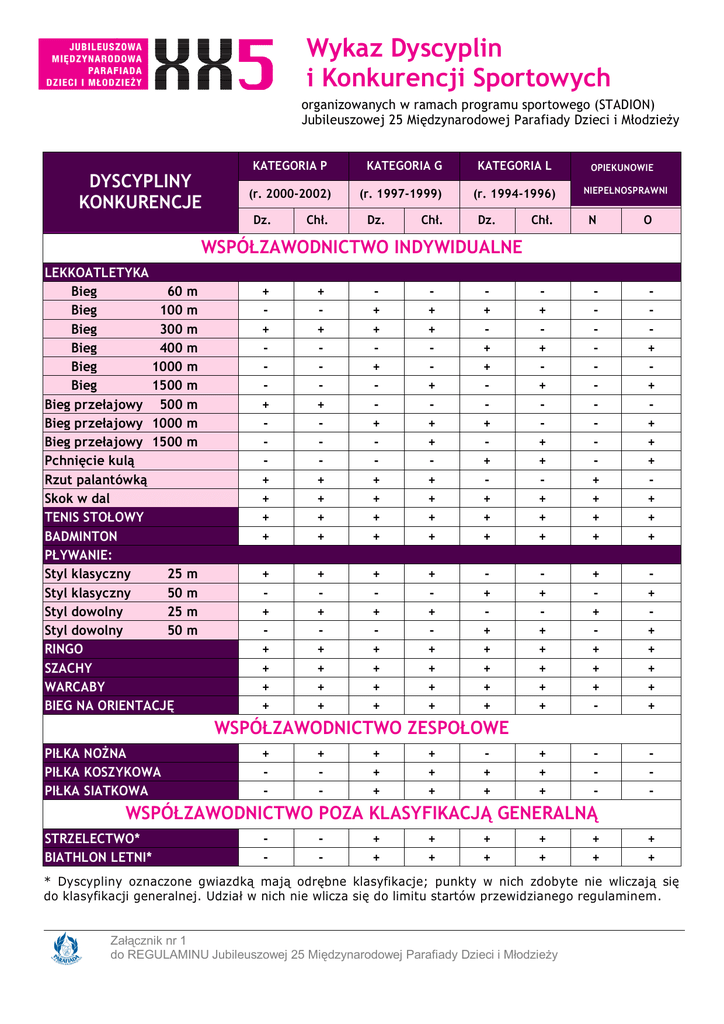 Wykaz Dyscyplin i Konkurencji Sportowych organizowanych w ramach programu sportowego (STADION) Jubileuszowej 25 Międzynarodowej Parafiady Dzieci i Młodzieży KATEGORIA P DYSCYPLINY KONKURENCJE (r. 2000-2002) Dz. Chł. KATEGORIA G (r. 1997-1999) Dz. Chł. KATEGORIA L (r. 1994-1996) Dz. OPIEKUNOWIE NIEPEŁNOSPRAWNI Chł. N O WSPÓŁZAWODNICTWO INDYWIDUALNE LEKKOATLETYKA Bieg 60 Bieg 100 Bieg 300 Bieg 400 Bieg 1000 Bieg 1500 Bieg przełajowy 500 Bieg przełajowy 1000 Bieg przełajowy 1500 Pchnięcie kulą Rzut palantówką Skok w dal TENIS STOŁOWY BADMINTON PŁYWANIE: Styl klasyczny 25 Styl klasyczny 50 Styl dowolny 25 Styl dowolny 50 RINGO SZACHY WARCABY BIEG NA ORIENTACJĘ m m m m m m m m m + + + + + + + + + + + + + + + + + + + + + + + + + + + + + + + + + + + + + + + + + + + + + + + + + + + + + + + + + + + m m m m + + + + + + + + + + + + + + + + + + + + + + + + + + + + + + + + + + + + + + + + + - + + + + + + + + + - - WSPÓŁZAWODNICTWO ZESPOŁOWE PIŁKA NOŻNA PIŁKA KOSZYKOWA PIŁKA SIATKOWA + - + - + + + + + + + + WSPÓŁZAWODNICTWO POZA KLASYFIKACJĄ GENERALNĄ STRZELECTWO* BIATHLON LETNI* - - + + + + + + + + + + + + * Dyscypliny oznaczone gwiazdką mają odrębne klasyfikacje; punkty w nich zdobyte nie wliczają się do klasyfikacji generalnej. Udział w nich nie wlicza się do limitu startów przewidzianego regulaminem. Załącznik nr 1 do REGULAMINU Jubileuszowej 25 Międzynarodowej Parafiady Dzieci i Młodzieży