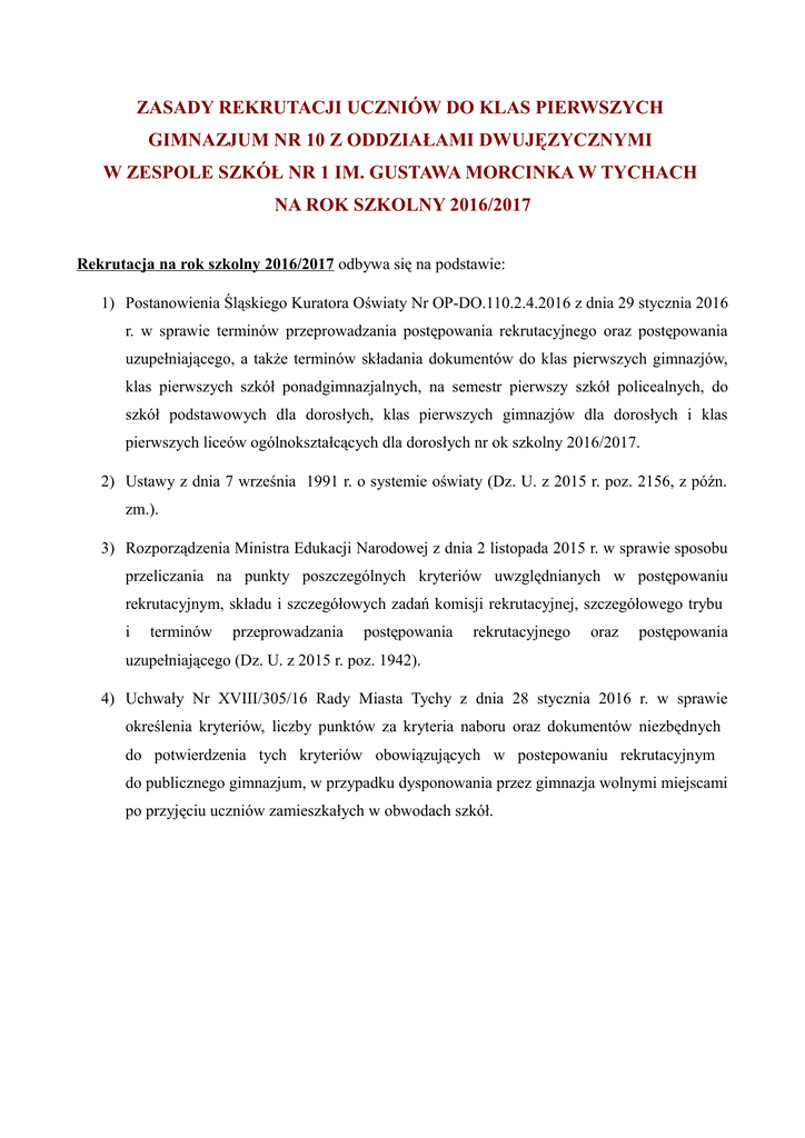 ZASADY REKRUTACJI UCZNIÓW DO KLAS PIERWSZYCH GIMNAZJUM NR 10 Z ODDZIAŁAMI DWUJĘZYCZNYMI W ZESPOLE SZKÓŁ NR 1 IM. GUSTAWA MORCINKA W TYCHACH NA ROK SZKOLNY 2016/2017 Rekrutacja na rok szkolny 2016/2017 odbywa się na podstawie: 1) Postanowienia Śląskiego Kuratora Oświaty Nr OP-DO.110.2.4.2016 z dnia 29 stycznia 2016 r. w sprawie terminów przeprowadzania postępowania rekrutacyjnego oraz postępowania uzupełniającego, a także terminów składania dokumentów do klas pierwszych gimnazjów, klas pierwszych szkół ponadgimnazjalnych, na semestr pierwszy szkół policealnych, do szkół podstawowych dla dorosłych, klas pierwszych gimnazjów dla dorosłych i klas pierwszych liceów ogólnokształcących dla dorosłych nr ok szkolny 2016/2017. 2) Ustawy z dnia 7 września 1991 r. o systemie oświaty (Dz. U. z 2015 r. poz. 2156, z późn. zm.). 3) Rozporządzenia Ministra Edukacji Narodowej z dnia 2 listopada 2015 r. w sprawie sposobu przeliczania na punkty poszczególnych kryteriów uwzględnianych w postępowaniu rekrutacyjnym, składu i szczegółowych zadań komisji rekrutacyjnej, szczegółowego trybu i terminów przeprowadzania postępowania rekrutacyjnego oraz postępowania uzupełniającego (Dz. U. z 2015 r. poz. 1942). 4) Uchwały Nr XVIII/305/16 Rady Miasta Tychy z dnia 28 stycznia 2016 r. w sprawie określenia kryteriów, liczby punktów za kryteria naboru oraz dokumentów niezbędnych do potwierdzenia tych kryteriów obowiązujących w postepowaniu rekrutacyjnym do publicznego gimnazjum, w przypadku dysponowania przez gimnazja wolnymi miejscami po przyjęciu uczniów zamieszkałych w obwodach szkół. Gimnazjum nr 10 z Oddziałami Dwujęzycznymi przyjmuje uczniów z rejonu (obwodu): Lp Ulica Numer/Zakres numerów 1 2 3 4 5 6 7 8 9 10 11 12 13 14 15 16 17 18 19 20 21 22 23 24 25 26 27 28 29 30 31 32 33 34 35 36 37 38 Aleja Niepodległości Aleja Niepodległości Bławatków Bratków Chabrów Cmentarna Dziewanny Dzwonkowa Edukacji Edukacji Filaretów Filomatów Fitelberga Fredry Frycza Modrzewskiego Generała De Gaulle'a Goździków Jaskrów Kaczeniec Kardynała Wyszyńskiego Krokusów Marzanny Niezapominajek Olchowa Ostróżki Oświęcimska Oświęcimska Paproci Poziomkowa Przemysłowa Rybna Składowa Skotnica Stokrotek Wejchertów Wędkarska Za Drogą Zwierzyniecka od 194 do 230 (parzyste) od 57 do 87 (nieparzyste) wszystkie wszystkie wszystkie wszystkie wszystkie wszystkie od 15 do 57 (nieparzyste) od 46 do 102 (parzyste) wszystkie wszystkie wszystkie wszystkie wszystkie wszystkie do 33 wszystkie wszystkie wszystkie od 6 do 40 (parzyste) wszystkie wszystkie wszystkie wszystkie wszystkie do 52 parzyste do 73 nieparzyste wszystkie wszystkie wszystkie wszystkie wszystkie wszystkie wszystkie wszystkie wszystkie wszystkie od 108 do 126 1. O przyjęciu kandydata do Gimnazjum nr 10 z Oddziałami Dwujęzycznymi decyduje wynik postępowania rekrutacyjnego. 2. Postępowanie rekrutacyjne jest prowadzone na wniosek rodzica/opiekunów prawnych kandydata. 3. Do klasy pierwszej Gimnazjum nr 10 z Oddziałami Dwujęzycznymi w Zespole Szkół nr 1 przyjmowani są z urzędu absolwenci sześcioletnich szkół podstawowych zamieszkali w obwodzie Gimnazjum nr 10 z Oddziałami Dwujęzycznymi. 4. Postępowanie rekrutacyjne prowadzone jest z wykorzystaniem systemów informatycznych. 5. Oddział dwujęzyczny jest oddziałem pozaobwodowym. 6. Warunkiem przyjęcia kandydata do oddziału dwujęzycznego jest uczestnictwo w: a) Ogólnopolskim teście predyspozycji językowych, przygotowany w Instytucie Lingwistyki Stosowanej UW. b) Laureaci Wojewódzkich Konkursów Interdyscyplinarnych organizowanych przez Kuratorów Oświaty są zwolnieni z testu predyspozycji językowych. 7. Do wszystkich pozostałych oddziałów kandydaci zamieszkali poza obwodem Gimnazjum nr 10 z Oddziałami Dwujęzycznymi mogą być przyjęci po przeprowadzeniu postępowania rekrutacyjnego w przypadku, gdy szkoła nadal dysponuje wolnymi miejscami. 8. W celu przeprowadzenia postępowania rekrutacyjnego dyrektor szkoły: • powołuje Szkolną Komisję Rekrutacyjną; • wyznacza przewodniczącego Szkolnej Komisji Rekrutacyjnej; • podaje do publicznej wiadomości kryteria rekrutacji do szkoły i wykaz wymaganych dokumentów; • rozpatruje odwołania rodziców/opiekunów prawnych od postanowień komisji rekrutacyjnej; tryb odwoławczy określa Ustawa z dnia 6 grudnia 2013 r. o zmianie ustawy o systemie oświaty oraz niektórych innych ustaw (Dz. U. z 2014 r. poz. 7 art. 20zc ust. 6-9). • wyznacza termin postępowania uzupełniającego w porozumieniu z Prezydentem Miasta. 9. Kryteria naboru uczniów do gimnazjów dla dzieci spoza obwodu: a) Laureat lub finalista Wojewódzkiego Konkursu Interdyscyplinarnego organizowanym przez Śląskiego Kuratora Oświaty jest przyjmowany do gimnazjum w pierwszej kolejności – 150 pkt b) Średnia ocen ze świadectwa ukończenia szkoły podstawowej – liczba punktów = średnia ocen x 10 c) Wyniki sprawdzianu OKE – 1% = 0,2 pkt liczba punktów = część I egzaminu …% x 0,2 pkt + część II egzaminu …% x 0,2 pkt + część III egzaminu …% x 0,2 pkt d) Ocena z zachowania – maksymalnie 10 pkt wzorowe – 10 pkt bardzo dobre – 8 pkt dobre – 4 pkt poprawne – 0 pkt e) Kandydat, którego rodzeństwo uczęszcza do szkoły/zespołu/innej szkoły zlokalizowanej w tym samym budynku – 6 pkt f) Kandydat, który jest absolwentem szkoły w zespole/innej szkoły zlokalizowanej w tym samym budynku – 4 pkt a..11. Jeżeli po przeprowadzeniu postępowania rekrutacyjnego szkoła dysponuje nadal wolnymi miejscami, przeprowadza się postępowanie uzupełniające. W roku szkolnym 2016/2017 zapraszamy absolwentów szkół podstawowych do klas: - klasy dwujęzycznej, - klasy hiszpańsko-angielska, - klasy matematyczno-angielska, - klasy humanistycznej. TERMINY REKRUTACJI do Gimnazjum nr 10 z Oddziałami Dwujęzycznymi w roku szkolnym 2016/2017 TERMIN od 06.05.2016 do 10.06.2016 od 06.05.2016 do 