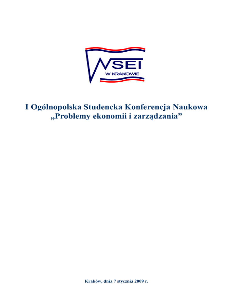 I Ogólnopolska Studencka Konferencja Naukowa „Problemy ekonomii i zarządzania” Kraków, dnia 7 stycznia 2009 r. Zakład Inwestycji i Nieruchomości Koło Naukowe Ekonomiki Budownictwa i Nieruchomości I Ogólnopolska Studencka Konferencja Naukowa „Problemy ekonomii i zarządzania” 9.00 - Otwarcie konferencji – Rektor WSEI doc. dr Aleksander Kowalski 9.10 - Przywitanie gości – ZałoŜyciel KN Ekonomiki Budownictwa i Nieruchomości - mgr Zofia Gródek 1. 2. 3. 4. 5. 6. 7. 8. 9. 10. 11. 12. 13. 14. 15. 16. 9.20 - Sesja plenarna (SW-1) Aleksandra Stopińska, Iwona Strzępek, Łukasz Skowroński, Sylwester Wojda - Akademiki, stancje dla absolwentów - analiza obecnej sytuacji Uniwersytetu Ekonomicznego w Krakowie Opiekun naukowy: mgr Bartłomiej Marona Uniwersytet Ekonomiczny w Krakowie Karolina Chrabąszcz - Komunikat z badań: Autostrada A4 Kraków-Tarnów oczami tarnowian. Szanse i zagroŜenia. Opiekun naukowy: prof. dr hab. Leszek Kałkowski i mgr Marzena Bac Małopolska WyŜsza Szkoła Ekonomiczna w Tarnowie BoŜena Obuchowicz - Analiza najwaŜniejszych wskaźników giełdowych sektora spółek deweloperskich Opiekun naukowy: mgr Magdalena Gostkowska - Drzewicka Sopocka Szkoła WyŜsza w Sopocie Magdalena BłaŜejewicz - Stan obecny i perspektywy rozwoju deweloperskiego rynku mieszkaniowego w Trójmieście Opiekun naukowy: mgr Magdalena Gostkowska - Drzewicka Sopocka Szkoła WyŜsza w Sopocie Monika Mateja - Ceny nieruchomości gruntowych na cele budowlane w Trójmieście w latach 2003 - 2008 Opiekun naukowy: mgr Magdalena Gostkowska - Drzewicka Sopocka Szkoła WyŜsza w Sopocie Paweł Agustyn, Damian Maślanka, Małgorzata Terlikowska - Tendencje na polskim rynku nieruchomości Opiekun naukowy: mgr Małgorzata Terlikowska WyŜsza Szkoła Ekonomii i Informatyki w Krakowie Magdalena Stolarz, Andrzej DroŜdŜ - Analiza cen nieruchomości w Krakowie Opiekun naukowy: mgr Małgorzata Terlikowska WyŜsza Szkoła Ekonomii i Informatyki w Krakowie Beata Przepióra - Wpływ polityki Stanów Zjednoczonych na gospodarkę globalną Opiekun naukowy: dr Sławomir Kotylak Uniwersytet Zielonogórski Katarzyna Oryszczak - Ekonomiczne aspekty rozwoju przemysłu kreatywnego Akademia Ekonomiczna im. Karola Adamieckiego w Katowicach Beata Wróbel, Kazimierz Nagody-Mrozowicz - Uwarunkowania rozwoju kompetencji pracowniczych w świetle postaw młodzieŜy studiującej. Opiekun naukowy: dr Kazimierz Nagody-Mrozowicz Małopolska WyŜsza Szkoła Ekonomiczna w Tarnowie Marlena Zaguła, Mateusz Czekierda - Komunikacja interpersonalna i negocjacje w biznesie Opiekun naukowy: mgr Sylwia Dyrda- Maciałek Państwowa WyŜsza Szkoła Zawodowa w Jarosławiu Magdalena Janiszewska - Współpraca buduje - znaczenie pracy zespołowej w osiąganiu rezultatów przez organizację. Opiekun naukowy: mgr Wioletta Tokarska - Ołownia WyŜsza Szkoła Ekonomii i Prawa im. Prof. Edwarda Lipińskiego w Kielcach Magdalena Walczak - Is it payable to play fair Opiekun naukowy: dr Paweł Kuśmierczyk WyŜsza Szkoła Bankowa we Wrocławiu Marta Beściak - Świadczenia pienięŜne z ubezpieczenia społecznego w razie choroby i macierzyństwa w polskim systemie ubezpieczeń społecznych Opiekun naukowy: prof. dr hab. Łukasz Sułkowski Społeczna WyŜsza Szkoła Przedsiębiorczości i Zarządzania w Łodzi Justyna Rysiak, Piotr Kowalczyk - Ekonomia- samotnie czy w parze z innymi naukami? Uniwersytet Warszawski Anna Kopeć - Charakterystyka form partnerstwa publiczno -prywatnego (PPP) jako metody finansowania przedsięwzięć w sektorze turystyki Opiekun naukowy: dr BoŜena Grad WyŜsza Szkoła Ekonomii, Turystyki i Nauk Społecznych w Kielcach 12.00 – Dyskusja i podsumowanie sesji plenarnej 12.30 – 13.00 – Przerwa na poczęstunek 13.00 - Sekcja I (sala SW-1) Sekcja I – Problemy ekonomii 1. ElŜbieta Nosal - Szczygieł - Tendencje rozwoju oszczędności gospodarstw domowych w Polsce w latach 1997 – 2008 Opiekun naukowy: prof. zw. dr hab. Stanisław Owsiak Uniwersytet Ekonomiczny w Krakowie 2. Justyna Antosik, Ilona Spadło, Zdzisław Schabek - Regionalny program operacyjny województwa świętokrzyskiego jako istotny instrument finansowania rozwoju regionu świętokrzyskiego Opiekun naukowy: dr BoŜena Grad WyŜsza Szkoła Ekonomii, Turystyki i Nauk Społecznych w Kielcach 3. Justyna Chwała - Miasto jako produkt. Miasto jako marka. Opiekun naukowy: dr Marta Trojanowska Państwowa WyŜsza Szkoła Zawodowa w Jarosławiu 4. Paulina Paul - LeŜajsk jako miejsce pielgrzymek, miasto w ujęciu kulturalnym i ekonomicznym Opiekun naukowy: mgr Sylwia Dyrda- Maciałek Państwowa WyŜsza Szkoła Zawodowa w Jarosławiu 5. Marek Uliński - Inflacja na Węgrzech w świetle ilościowej teorii inflacji Opiekun naukowy: dr Joanna Czech-Rogosz Akademia Ekonomiczna im. Karola Adamieckiego w Katowicach 6. Tomasz Mataczyński - Sektor prywatny a wzrost gospodarczy Ukrainy Opiekun naukowy: dr Joanna Czech-Rogosz Akademia Ekonomiczna im. Karola Adamieckiego w Katowicach 7. Karolina Szymaniec - Rola kryzysu finansowego z 1998 r. w przezwycięŜaniu załamania transformacyjnego Federacji Rosyjskiej Opiekun naukowy: dr Joanna Czech-Rogosz Akademia Ekonomiczna im. Karola Adamieckiego w Katowicach 8. Bartłomiej Słoik - Kulturowe czynniki rozwoju gospodarczego na przykładzie Japonii Opiekun naukowy: dr Joanna Czech - Rogosz Akademia Ekonomiczna im. Karola Adamieckiego w Katowicach 9. Judyta Smolik - Analiza finansowa w dobie globalizacji Opiekun naukowy: dr Kazimierz Nagody-Mrozowicz Małopolska WyŜsza Szkoła Ekonomiczna w Tarnowie 10. Grzegorz Walczak, Paweł Wieszała - Wykorzystanie wielokryterialnej metody interaktywnej w zarządzaniu zapasami Opiekun naukowy: dr inŜ. Tomasz Błaszczyk Akademia Ekonomiczna im. Karola Adamieckiego w Katowicach 15.00 – Dyskusja i zakończenie obrad 15.45 – Zakończenie konferencji (sala SW-1) 13.00 - Sekcja II (sala SW-2) Sekcja II – Problemy zarządzania 1. Katarzyna Raczyńska - Faza integracji w fuz