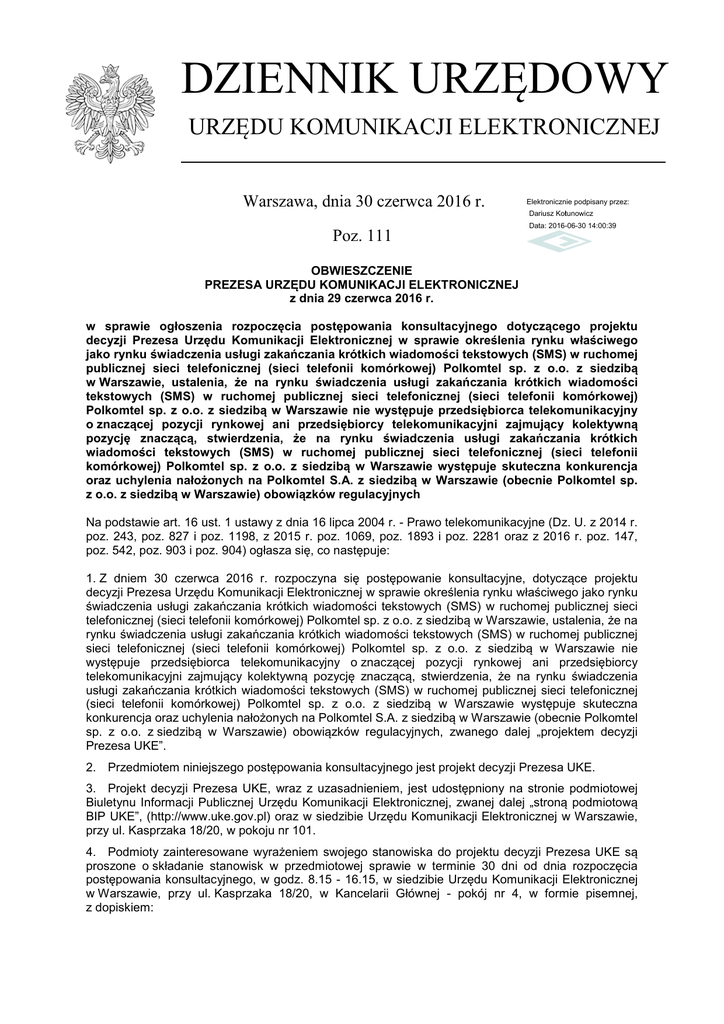 DZIENNIK URZĘDOWY URZĘDU KOMUNIKACJI ELEKTRONICZNEJ Warszawa, dnia 30 czerwca 2016 r. Elektronicznie podpisany przez: Dariusz Kołtunowicz Poz. 111 Data: 2016-06-30 14:00:39 OBWIESZCZENIE PREZESA URZĘDU KOMUNIKACJI ELEKTRONICZNEJ z dnia 29 czerwca 2016 r. w sprawie ogłoszenia rozpoczęcia postępowania konsultacyjnego dotyczącego projektu decyzji Prezesa Urzędu Komunikacji Elektronicznej w sprawie określenia rynku właściwego jako rynku świadczenia usługi zakańczania krótkich wiadomości tekstowych (SMS) w ruchomej publicznej sieci telefonicznej (sieci telefonii komórkowej) Polkomtel sp. z o.o. z siedzibą w Warszawie, ustalenia, że na rynku świadczenia usługi zakańczania krótkich wiadomości tekstowych (SMS) w ruchomej publicznej sieci telefonicznej (sieci telefonii komórkowej) Polkomtel sp. z o.o. z siedzibą w Warszawie nie występuje przedsiębiorca telekomunikacyjny o znaczącej pozycji rynkowej ani przedsiębiorcy telekomunikacyjni zajmujący kolektywną pozycję znaczącą, stwierdzenia, że na rynku świadczenia usługi zakańczania krótkich wiadomości tekstowych (SMS) w ruchomej publicznej sieci telefonicznej (sieci telefonii komórkowej) Polkomtel sp. z o.o. z siedzibą w Warszawie występuje skuteczna konkurencja oraz uchylenia nałożonych na Polkomtel S.A. z siedzibą w Warszawie (obecnie Polkomtel sp. z o.o. z siedzibą w Warszawie) obowiązków regulacyjnych Na podstawie art. 16 ust. 1 ustawy z dnia 16 lipca 2004 r. - Prawo telekomunikacyjne (Dz. U. z 2014 r. poz. 243, poz. 827 i poz. 1198, z 2015 r. poz. 1069, poz. 1893 i poz. 2281 oraz z 2016 r. poz. 147, poz. 542, poz. 903 i poz. 904) ogłasza się, co następuje: 1. Z dniem 30 czerwca 2016 r. rozpoczyna się postępowanie konsultacyjne, dotyczące projektu decyzji Prezesa Urzędu Komunikacji Elektronicznej w sprawie określenia rynku właściwego jako rynku świadczenia usługi zakańczania krótkich wiadomości tekstowych (SMS) w ruchomej publicznej sieci telefonicznej (sieci telefonii komórkowej) Polkomtel sp. z o.o. z siedzibą w Warszawie, ustalenia, że na rynku świadczenia usługi zakańczania krótkich wiadomości tekstowych (SMS) w ruchomej publicznej sieci telefonicznej (sieci telefonii komórkowej) Polkomtel sp. z o.o. z siedzibą w Warszawie nie występuje przedsiębiorca telekomunikacyjny o znaczącej pozycji rynkowej ani przedsiębiorcy telekomunikacyjni zajmujący kolektywną pozycję znaczącą, stwierdzenia, że na rynku świadczenia usługi zakańczania krótkich wiadomości tekstowych (SMS) w ruchomej publicznej sieci telefonicznej (sieci telefonii komórkowej) Polkomtel sp. z o.o. z siedzibą w Warszawie występuje skuteczna konkurencja oraz uchylenia nałożonych na Polkomtel S.A. z siedzibą w Warszawie (obecnie Polkomtel sp. z o.o. z siedzibą w Warszawie) obowiązków regulacyjnych, zwanego dalej „projektem decyzji Prezesa UKE”. 2. Przedmiotem niniejszego postępowania konsultacyjnego jest projekt decyzji Prezesa UKE. 3. Projekt decyzji Prezesa UKE, wraz z uzasadnieniem, jest udostępniony na stronie podmiotowej Biuletynu Informacji Publicznej Urzędu Komunikacji Elektronicznej, zwanej dalej „stroną podmiotową BIP UKE”, (http://www.uke.gov.pl) oraz w siedzibie Urzędu Komunikacji Elektronicznej w Warszawie, przy ul. Kasprzaka 18/20, w pokoju nr 101. 4. Podmioty zainteresowane wyrażeniem swojego stanowiska do projektu decyzji Prezesa UKE są proszone o składanie stanowisk w przedmiotowej sprawie w terminie 30 dni od dnia rozpoczęcia postępowania konsultacyjnego, w godz. 8.15 - 16.15, w siedzibie Urzędu Komunikacji Elektronicznej w Warszawie, przy ul. Kasprzaka 18/20, w Kancelarii Głównej - pokój nr 4, w formie pisemnej, z dopiskiem: Dziennik Urzędowy Urzędu Komunikacji Elektronicznej –2– Poz. 111 „Stanowisko dotyczące projektu decyzji Prezesa Urzędu Komunikacji Elektronicznej w sprawie określenia rynku właściwego jako rynku świadczenia usługi zakańczania krótkich wiadomości tekstowych (SMS) w ruchomej publicznej sieci telefonicznej (sieci telefonii komórkowej) Polkomtel sp. z o.o. z siedzibą w Warszawie, ustalenia, że na rynku świadczenia usługi zakańczania krótkich wiadomości tekstowych (SMS) w ruchomej publicznej sieci telefonicznej (sieci telefonii komórkowej) Polkomtel sp. z o.o. z siedzibą w Warszawie nie występuje przedsiębiorca telekomunikacyjny o znaczącej pozycji rynkowej ani przedsiębiorcy telekomunikacyjni zajmujący kolektywną pozycję znaczącą, stwierdzenia, że na rynku świadczenia usługi zakańczania krótkich wiadomości tekstowych (SMS) w ruchomej publicznej sieci telefonicznej (sieci telefonii komórkowej) Polkomtel sp. z o.o. z siedzibą w Warszawie występuje skuteczna konkurencja oraz uchylenia nałożonych na Polkomtel S.A. z siedzibą w Warszawie (obecnie Polkomtel sp. z o.o. z siedzibą w Warszawie) obowiązków regulacyjnych Urząd Komunikacji Elektronicznej ul. Kasprzaka 18/20 01-211 Warszawa” oraz elektronicznej na adres e-mail: [email protected] 5. Wyniki niniejszego postępowania konsultacyjnego będą ogłoszone zgodnie z art. 16 ust. 2 ustawy z dnia 16 lipca 2004 r. - Prawo telekomunikacyjne: 1) na tablicy ogłoszeń w siedzibie Urzędu Komunikacji Elektronicznej w Warszawie, przy ul. Kasprzaka 18/20; 2) na stronie podmiotowej BIP UKE (http://www.uke.gov.pl). Prezes Urzędu Komunikacji Elektronicznej Magdalena Gaj
