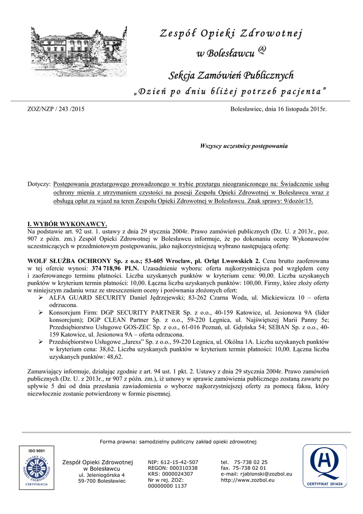 Zespół Opieki Zdrowotnej w Bolesławcu Sekcja Zamówień