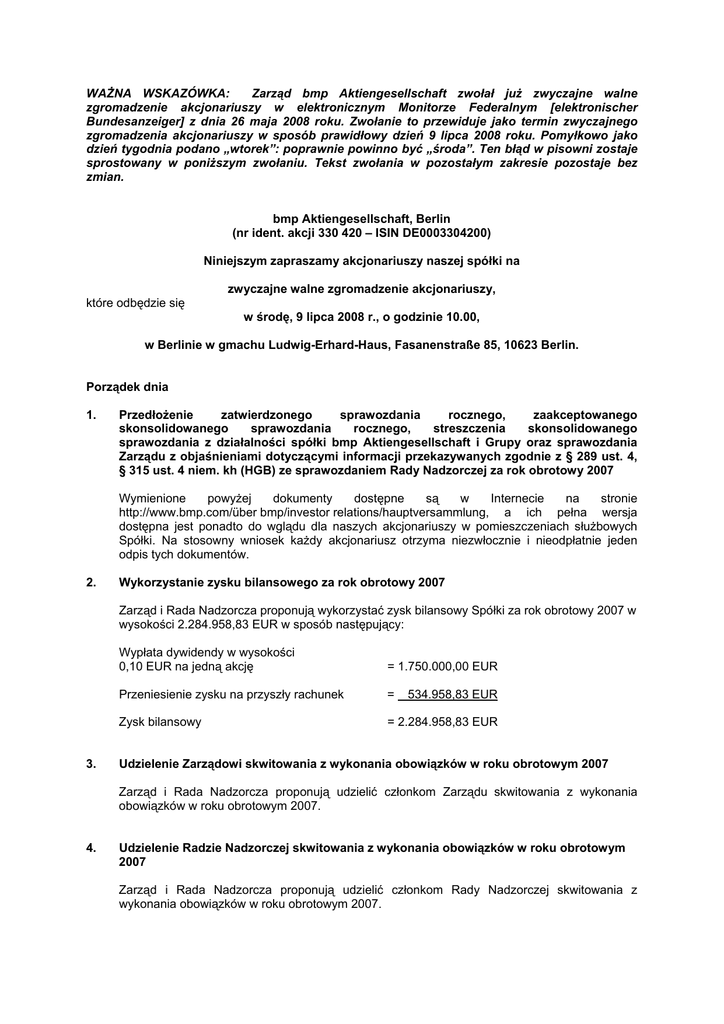 WAŻNA WSKAZÓWKA: Zarząd bmp Aktiengesellschaft zwołał już zwyczajne walne zgromadzenie akcjonariuszy w elektronicznym Monitorze Federalnym [elektronischer Bundesanzeiger] z dnia 26 maja 2008 roku. Zwołanie to przewiduje jako termin zwyczajnego zgromadzenia akcjonariuszy w sposób prawidłowy dzień 9 lipca 2008 roku. Pomyłkowo jako dzień tygodnia podano „wtorek”: poprawnie powinno być „środa”. Ten błąd w pisowni zostaje sprostowany w poniższym zwołaniu. Tekst zwołania w pozostałym zakresie pozostaje bez zmian. bmp Aktiengesellschaft, Berlin (nr ident. akcji 330 420 – ISIN DE0003304200) Niniejszym zapraszamy akcjonariuszy naszej spółki na zwyczajne walne zgromadzenie akcjonariuszy, które odbędzie się w środę, 9 lipca 2008 r., o godzinie 10.00, w Berlinie w gmachu Ludwig-Erhard-Haus, Fasanenstraße 85, 10623 Berlin. Porządek dnia 1. Przedłożenie zatwierdzonego sprawozdania rocznego, zaakceptowanego skonsolidowanego sprawozdania rocznego, streszczenia skonsolidowanego sprawozdania z działalności spółki bmp Aktiengesellschaft i Grupy oraz sprawozdania Zarządu z objaśnieniami dotyczącymi informacji przekazywanych zgodnie z § 289 ust. 4, § 315 ust. 4 niem. kh (HGB) ze sprawozdaniem Rady Nadzorczej za rok obrotowy 2007 Wymienione powyżej dokumenty dostępne są w Internecie na stronie http://www.bmp.com/über bmp/investor relations/hauptversammlung, a ich pełna wersja dostępna jest ponadto do wglądu dla naszych akcjonariuszy w pomieszczeniach służbowych Spółki. Na stosowny wniosek każdy akcjonariusz otrzyma niezwłocznie i nieodpłatnie jeden odpis tych dokumentów. 2. Wykorzystanie zysku bilansowego za rok obrotowy 2007 Zarząd i Rada Nadzorcza proponują wykorzystać zysk bilansowy Spółki za rok obrotowy 2007 w wysokości 2.284.958,83 EUR w sposób następujący: 3. Wypłata dywidendy w wysokości 0,10 EUR na jedną akcję = 1.750.000,00 EUR Przeniesienie zysku na przyszły rachunek = Zysk bilansowy = 2.284.958,83 EUR 534.958,83 EUR Udzielenie Zarządowi skwitowania z wykonania obowiązków w roku obrotowym 2007 Zarząd i Rada Nadzorcza proponują udzielić członkom Zarządu skwitowania z wykonania obowiązków w roku obrotowym 2007. 4. Udzielenie Radzie Nadzorczej skwitowania z wykonania obowiązków w roku obrotowym 2007 Zarząd i Rada Nadzorcza proponują udzielić członkom Rady Nadzorczej skwitowania z wykonania obowiązków w roku obrotowym 2007. 5. Wybory nowego składu Rady Nadzorczej Zgodnie z §§ 95 ust. 1, 96 ust. 1, 101 ust. 1 niem. ustawy o akcjach w związku z § 10 ust. 1 Statutu w skład Rady Nadzorczej wchodzi trzech członków reprezentujących akcjonariuszy. Walne zgromadzenie akcjonariuszy nie jest związane przedłożonymi propozycjami kandydatur. Kadencja obecnych członków Rady Nadzorczej, Gerda Schmitz-Morkramera, Bernda Brunkego i Ulricha Ankelego, upływa z końcem niniejszego zwyczajnego walnego zgromadzenia. Rada Nadzorcza proponuje, aby ze skutkiem od momentu zakończenia niniejszego zwyczajnego walnego zgromadzenia do zakończenia walnego zgromadzenia, które podejmie uchwałę o udzieleniu skwitowania za czwarty rok obrotowy od początku kadencji, ponownie wybrać a) pana Gerda Schmitz-Morkramera, samodzielnego adwokata, Monachium, b) pana mgr inż. Bernda Brunkego, doradcę przedsiębiorstw/partnera w spółce Roland Berger Strategy Consultants GmbH, Berlin, c) pana dypl. ekon. Ulricha Ankelego, emerytowanego Dyrektora w banku KfW, Oberursel, na członków Rady Nadzorczej. Pan Schmitz-Morkramer jest członkiem tworzonych obowiązkowo rad nadzorczych i podobnych organów kontrolnych w następujących spółkach: • YOC AG (Berlin) – przewodniczący rady nadzorczej, • Merck Finck Treuhand Aktiengesellschaft (Monachium) – przewodniczący rady nadzorczej, • MLP AG (Heidelberg) – zastępca przewodniczącego rady nadzorczej. Pan Brunke i pan Ankele nie sprawowali żadnych innych mandatów w tworzonych obowiązkowo radach nadzorczych lub innych organach kontrolnych. 6. Wynagrodzenie Rady Nadzorczej Zarząd i Rada Nadzorcza proponują przyjąć uchwałę następującej treści: W brzmieniu uregulowania w sprawie wynagrodzenia Rady Nadzorczej, które zostało przyjęte na walnym zgromadzeniu w dniu 4 lipca 2001 r., wprowadza się następujące zmiany. Członkowie Rady Nadzorczej otrzymują za swoją działalność roczne wynagrodzenie podstawowe obliczone proporcjonalnie do okresu rocznego w następującej wysokości: 1. 10.000,00 EUR dla przewodniczącego Rady Nadzorczej oraz 2. 5.000,00 EUR dla pozostałych członków Rady Nadzorczej. Ponadto wypłacane jest wynagrodzenie za każdy dzień posiedzenia w następującej wysokości: 2/18 1. 2.500,00 EUR dla przewodniczącego Rady Nadzorczej, 2. 1.500,00 EUR dla zastępcy przewodniczącego Rady Nadzorczej oraz 3. 1.000,00 EUR dla pozostałych członków Rady Nadzorczej. Ponadto członkom Rady Nadzorczej przysługuje wynagrodzenie uzależnione od wyników Spółki, które jest wypłacane w przypadku, kiedy spółka bmp AG osiągnie zgodnie z przyjętym sprawozdaniem rocznym (określony zgodnie z kodeksem handlowym HGB) zysk bilansowy (po potrąceniu co najmniej 4 procent wkładów wniesionych na poczet najniższej kwoty emisji akcji) przekraczający 20 centów przypadających na jedną akcję. Wysokość wynagrodzenia uzależnionego od osiąganych wyników kształtuje się przy tym następująco: W przypadku zysku przypadającego na jedną akcję w wysokości powyżej 20 centów 1. 2.000,00 EUR od każdego centa dla przewodniczącego Rady Nadzorczej oraz 2. 1.000,00 EUR od każdego centa dla pozostałych członków Rady Nadzorczej. W przypadku podwyższenia kapitału w zamian za wniesienie wkładu gotówkowego lub rzeczowego (aportu) na nowe akcje przypada zamiast kwoty 20 centów od każdej akcji wartość określona na podstawie stosunku czasu, jaki upłynął między dniem całkowitego wniesienia wkładu na poczet podwyższenia kapitału a końcem rok