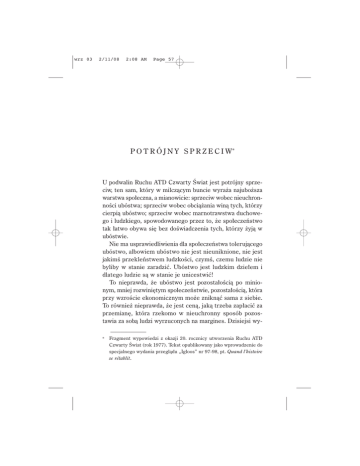 wrz 03 2/11/08 2:08 AM Page 57 P O T R Ó J N Y S P R Z E C I W* U podwalin Ruchu ATD Czwarty Âwiat jest potrójny sprzeciw, ten sam, który w milczàcym buncie wyra˝a najubo˝sza warstwa spo∏eczna, a mianowicie: sprzeciw wobec nieuchronnoÊci ubóstwa; sprzeciw wobec obcià˝ania winà tych, którzy cierpià ubóstwo; sprzeciw wobec marnotrawstwa duchowego i ludzkiego, spowodowanego przez to, ˝e spo∏eczeƒstwo tak ∏atwo obywa si´ bez doÊwiadczenia tych, którzy ˝yjà w ubóstwie. Nie ma usprawiedliwienia dla spo∏eczeƒstwa tolerujàcego ubóstwo, albowiem ubóstwo nie jest nieuniknione, nie jest jakimÊ przekleƒstwem ludzkoÊci, czymÊ, czemu ludzie nie byliby w stanie zaradziç. Ubóstwo jest ludzkim dzie∏em i dlatego ludzie sà w stanie je unicestwiç! To nieprawda, ˝e ubóstwo jest pozosta∏oÊcià po minionym, mniej rozwini´tym spo∏eczeƒstwie, pozosta∏oÊcià, która przy wzroÊcie ekonomicznym mo˝e zniknàç sama z siebie. To równie˝ nieprawda, ˝e jest cenà, jakà trzeba zap∏aciç za przemian´, która rzekomo w nieuchronny sposób pozostawia za sobà ludzi wyrzuconych na margines. Dzisiejsi wy* ——————— Fragment wypowiedzi z okazji 20. rocznicy utworzenia Ruchu ATD Czwarty Âwiat (rok 1977). Tekst opublikowany jako wprowadzenie do specjalnego wydania przeglàdu „Igloos” nr 97-98, pt. Quand l’histoire se rétablit. wrz 03 2/11/08 2:08 AM Page 58 58 Ojciec Józef Wrzesiƒski z Alwine de Vos van Steenwijk, pierwszà przewodniczàcà Mi´dzynarodowego Ruchu ATD Czwarty Âwiat, Pary˝, Gare du Nord, 1961. kluczeni byli wykluczonymi tak˝e wczoraj! Przemiana sama w sobie nie jest wi´c powodem wykluczenia. JeÊli unicestwienie ubóstwa nie zostanie uznane za pierwszorz´dny cel w projektach rozwoju wspólnoty narodowej, to utrzyma si´ ono niezale˝nie od ustroju paƒstwowego czy post´pu technicznego. Ruch nie godzi si´ wi´c na ˝adne usprawiedliwianie ubóstwa. Ubóstwo istnieje tylko dlatego, ˝e my do niego dopusz- wrz 03 2/11/08 2:08 AM Potrójny sprzeciw Page 59 59 czamy. Domagamy si´ stanowczoÊci politycznej w jego unicestwianiu. Ruch nie zgadza si´, aby oskar˝aç najubo˝sze rodzin o to, ˝e same upodoba∏y sobie skrajne ubóstwo, ˝e trwajà w nim z braku woli albo przez zaniedbanie! Któ˝, tak naprawd´, móg∏by upodobaç sobie niedostatek i zale˝noÊç? Kto z w∏asnej woli móg∏by si´ godziç na wykonywanie najbardziej niewdzi´cznej pracy? Kto móg∏by dobrowolnie akceptowaç fakt, ˝e nie jest doceniony jako pracownik, ˝e nie mo˝e uczestniczyç w walkach robotniczych, w walkach politycznych, ˝e nie mo˝e ˝yç wed∏ug w∏asnego wyboru, ˝e jest uwa˝any za nieudolnego i leniwego? Kto móg∏by znajdowaç upodobanie w byciu pogardzanym, w ˝yciu na spo∏ecznym marginesie, gdzie nie jest si´ przez nikogo wys∏uchanym, skàd nie ma ˝adnej ucieczki? Je˝eli trwasz w tym ubóstwie, to tylko dlatego, ˝e nie masz Êrodków na wyjÊcie z tej sytuacji; ˝e nie otrzyma∏eÊ odpowiedniego wykszta∏cenia, które umo˝liwi∏oby ci wyuczenie si´ zawodu, nawiàzywanie przyjaêni i budowanie solidarnoÊci z innymi, wypowiadanie si´, zrozumienie funkcjonowania Êwiata, który ci´ otacza i w którym ˝yjesz. Kto, z w∏asnej woli, móg∏by si´ godziç na brak dost´pu do sztuki, muzyki, poezji; na to, ˝eby nie mieç wp∏ywu na w∏asne ˝ycie i ˝ycie innych; ˝eby patrzeç na swoje rosnàce dzieci, jak niepowodzenia szkolne zamykajà przed nimi wszystkie drogi? Komu mo˝e si´ podobaç, ˝e jest stale trzymany na uboczu, bo wzbudza w innych ludziach strach bàdê nieufnoÊç? Kto b´dzie w stanie uwierzyç, ˝e warto prze˝yç ˝ycie, chocia˝ jest krótkà chwilà, skoro nawet nadzieja budzi w nim przestrach? Takie nastawienie wobec najubo˝szej warstwy spo∏ecznej to marnotrawstwo duchowe i ludzkie nie do przyj´cia, i Ruch wrz 03 2/11/08 2:08 AM Page 60 60 nie mo˝e na to przystaç. Kto mo˝e bowiem wiedzieç lepiej ni˝ ten ubogi lud, który sam takiego losu doÊwiadczy∏, co tak naprawd´ ciemi´˝y ludzi, co ich niszczy? GdybyÊmy wys∏uchali rodzin z najubo˝szych osiedli, opowiedzia∏yby nam o tym wszystkim, co upokarza i przygniata cz∏owieka w naszym spo∏eczeƒstwie. Mog∏yby por´czyç, ˝e ka˝da przemiana, ka˝dy post´p, ka˝da nowa orientacja polityczna sà z korzyÊcià dla wszystkich. Dzi´ki swojemu doÊwiadczeniu, te rodziny mog∏yby nas nauczyç, czym naprawd´ sà sprawiedliwoÊç i wolnoÊç! MoglibyÊmy si´ od nich dowiedzieç, jakie wymogi stawia nam prawdziwa demokracja, w której ka˝dy obywatel zostaje wys∏uchany, bo jest przede wszystkim cz∏owiekiem! Ojciec Józef Wrzesiƒski i kard. Jean-Marie Lustiger przed katedrà Notre Dame w Pary˝u, po mszy porannej 17 paêdziernika 1987.