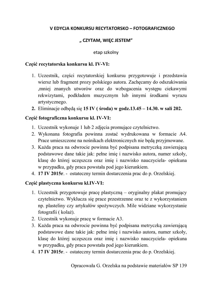 V EDYCJA KONKURSU RECYTATORSKO – FOTOGRAFICZNEGO „ CZYTAM, WIĘC JESTEM” etap szkolny Część recytatorska konkursu kl. IV-VI: 1. Uczestnik, części recytatorskiej konkursu przygotowuje i przedstawia wiersz lub fragment prozy polskiego autora. Zachęcamy do odszukiwania ,mniej znanych utworów oraz do wzbogacenia występu ciekawymi rekwizytami, podkładem muzycznym lub innymi środkami wyrazu artystycznego. 2. Eliminacje odbędą się 15 IV ( środa) w godz.13.45 – 14.30. w sali 202. Część fotograficzna konkursu kl. IV-VI: 1. Uczestnik wykonuje 1 lub 2 zdjęcia promujące czytelnictwo. 2. Wykonana fotografia powinna zostać wydrukowana w formacie A4. Prace umieszczone na nośnikach elektronicznych nie będą przyjmowane. 3. Każda praca na odwrocie powinna być podpisana metryczką zawierającą podstawowe dane takie jak: pełne imię i nazwisko autora, numer szkoły, klasę do której uczęszcza oraz imię i nazwisko nauczyciela- opiekuna w przypadku, gdy praca powstała pod jego kierunkiem. 4. 17 IV 2015r. - ostateczny termin dostarczenia prac do p. Orzelskiej. Część plastyczna konkursu kl.IV-VI: 1. Uczestnik przygotowuje pracę plastyczną – oryginalny plakat promujący czytelnictwo. Wyklucza się prace przestrzenne oraz te z wykorzystaniem np. plasteliny czy artykułów spożywczych. Mile widziane wykorzystanie fotografii ( kolaż). 2. Uczestnik wykonuje pracę w formacie A3. 3. Każda praca na odwrocie powinna być podpisana metryczką zawierającą podstawowe dane takie jak: pełne imię i nazwisko autora, numer szkoły, klasę do której uczęszcza oraz imię i nazwisko nauczyciela- opiekuna w przypadku, gdy praca powstała pod jego kierunkiem. 4. 17 IV 2015r. - ostateczny termin dostarczenia prac do p. Orzelskiej. Opracowała G. Orzelska na podstawie materiałów SP 139