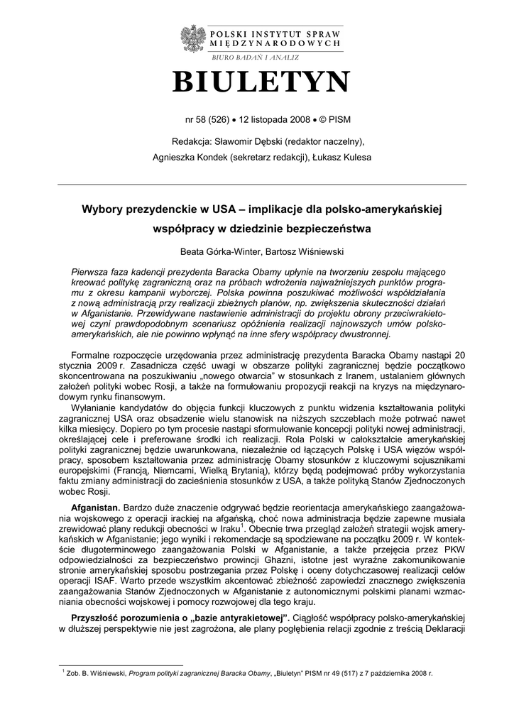 BIURO BADAŃ I ANALIZ BIULETYN nr 58 (526) 12 listopada 2008 © PISM Redakcja: Sławomir Dębski (redaktor naczelny), Agnieszka Kondek (sekretarz redakcji), Łukasz Kulesa Wybory prezydenckie w USA – implikacje dla polsko-amerykańskiej współpracy w dziedzinie bezpieczeństwa Beata Górka-Winter, Bartosz Wiśniewski Pierwsza faza kadencji prezydenta Baracka Obamy upłynie na tworzeniu zespołu mającego kreować politykę zagraniczną oraz na próbach wdrożenia najważniejszych punktów programu z okresu kampanii wyborczej. Polska powinna poszukiwać możliwości współdziałania z nową administracją przy realizacji zbieżnych planów, np. zwiększenia skuteczności działań w Afganistanie. Przewidywane nastawienie administracji do projektu obrony przeciwrakietowej czyni prawdopodobnym scenariusz opóźnienia realizacji najnowszych umów polskoamerykańskich, ale nie powinno wpłynąć na inne sfery współpracy dwustronnej. Formalne rozpoczęcie urzędowania przez administrację prezydenta Baracka Obamy nastąpi 20 stycznia 2009 r. Zasadnicza część uwagi w obszarze polityki zagranicznej będzie początkowo skoncentrowana na poszukiwaniu „nowego otwarcia” w stosunkach z Iranem, ustalaniem głównych założeń polityki wobec Rosji, a także na formułowaniu propozycji reakcji na kryzys na międzynarodowym rynku finansowym. Wyłanianie kandydatów do objęcia funkcji kluczowych z punktu widzenia kształtowania polityki zagranicznej USA oraz obsadzenie wielu stanowisk na niższych szczeblach może potrwać nawet kilka miesięcy. Dopiero po tym procesie nastąpi sformułowanie koncepcji polityki nowej administracji, określającej cele i preferowane środki ich realizacji. Rola Polski w całokształcie amerykańskiej polityki zagranicznej będzie uwarunkowana, niezależnie od łączących Polskę i USA więzów współpracy, sposobem kształtowania przez administrację Obamy stosunków z kluczowymi sojusznikami europejskimi (Francją, Niemcami, Wielką Brytanią), którzy będą podejmować próby wykorzystania faktu zmiany administracji do zacieśnienia stosunków z USA, a także polityką Stanów Zjednoczonych wobec Rosji. Afganistan. Bardzo duże znaczenie odgrywać będzie reorientacja amerykańskiego zaangażowania wojskowego z operacji irackiej na afgańską, choć nowa administracja będzie zapewne musiała zrewidować plany redukcji obecności w Iraku1. Obecnie trwa przegląd założeń strategii wojsk amerykańskich w Afganistanie; jego wyniki i rekomendacje są spodziewane na początku 2009 r. W kontekście długoterminowego zaangażowania Polski w Afganistanie, a także przejęcia przez PKW odpowiedzialności za bezpieczeństwo prowincji Ghazni, istotne jest wyraźne zakomunikowanie stronie amerykańskiej sposobu postrzegania przez Polskę i oceny dotychczasowej realizacji celów operacji ISAF. Warto przede wszystkim akcentować zbieżność zapowiedzi znacznego zwiększenia zaangażowania Stanów Zjednoczonych w Afganistanie z autonomicznymi polskimi planami wzmacniania obecności wojskowej i pomocy rozwojowej dla tego kraju. Przyszłość porozumienia o „bazie antyrakietowej”. Ciągłość współpracy polsko-amerykańskiej w dłuższej perspektywie nie jest zagrożona, ale plany pogłębienia relacji zgodnie z treścią Deklaracji 1 Zob. B. Wiśniewski, Program polityki zagranicznej Baracka Obamy, „Biuletyn” PISM nr 49 (517) z 7 października 2008 r. 1952 Polski Instytut Spraw Międzynarodowych w sprawie współpracy strategicznej z 20 sierpnia br. będą uzależnione od losów Umowy dotyczącej rozmieszczenia na terytorium RP antybalistycznych obronnych rakiet przechwytujących2. W sferze obrony budżet USA na rok 2009 zawiera trzy warunki uruchomienia funduszy przewidzianych na rozmieszczenie systemu obrony przeciwrakietowej w Europie. Po pierwsze, Polska i Republika Czeska muszą podpisać i ratyfikować porozumienia o utworzeniu baz (odpowiednio rakietowej i radarowej) oraz towarzyszące im porozumienia SOFA. Po drugie, komisje obrony i budżetowa w obydwu izbach Kongresu mają otrzymać raport zawierający niezależną ocenę programu europejskiego za 2008 r. Po trzecie, sekretarz obrony powinien zaświadczyć, iż rakiety przechwytujące, które mają znaleźć się w bazie w Redzikowie, będą zdolne do efektywnego działania w warunkach operacyjnych. Realizacja polsko-amerykańskiego porozumienia mogłaby zatem de facto zostać zablokowana już w przypadku odrzucenia przez czeski parlament umów zawartych pomiędzy USA a Czechami. Możliwość takiego scenariusza wzrosła po ostatnich wyborach, kiedy ODS, partia premiera Topolánka popierająca budowę radaru, utraciła większość w Senacie (głosowanie nad ratyfikacją zapowiedziano na grudzień br.). Nawet jeśli obydwa państwa spełnią warunek ratyfikacji, dynamika realizacji porozumień USA z Polską i Czechami może ulec znacznemu osłabieniu. Nowa administracja nie zakwestionuje zasadności rozmieszczenia elementów systemu w Europie. Kluczowe może jednak okazać się stanowisko europejskich sojuszników USA, o których poparcie będzie zabiegał Obama, chcąc zapewnić powodzenie operacji afgańskiej. Nie będzie to możliwe bez uzyskania zwiększenia ich zaangażowania (w tym militarnego). Tymczasem niektóre państwa europejskie (Francja, Niemcy), pomimo formalnie wyrażonej aprobaty dla projektu MD na szczycie NATO w Bukareszcie, wciąż zgłaszają zastrzeżenia, wskazując m.in. na konieczność inwestowania przede wszystkim w te programy, które mogą chronić siły sojuszników podczas operacji ekspedycyjnych. Wskazują również na zagrożenia płynące z antagonizowania Rosji. Poparcie FR będzie ponadto dla USA niezbędne w przypadku, gdyby nowa administracja zdecydowała się na zainicjowanie nałożenia dotkliwych sankcji lub na interwencję militarną dla powstrzymania postępów programu nuklearnego Iranu. Pretekstem do opóźnienia budowy baz europejskich mogą stać s