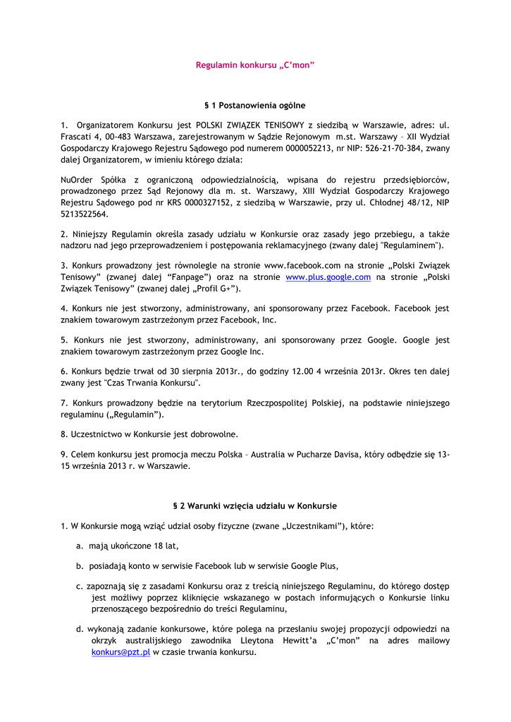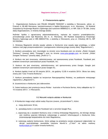 Regulamin konkursu „C’mon” § 1 Postanowienia ogólne 1. Organizatorem Konkursu jest POLSKI ZWIĄZEK TENISOWY z siedzibą w Warszawie, adres: ul. Frascati 4, 00-483 Warszawa, zarejestrowanym w Sądzie Rejonowym m.st. Warszawy – XII Wydział Gospodarczy Krajowego Rejestru Sądowego pod numerem 0000052213, nr NIP: 526-21-70-384, zwany dalej Organizatorem, w imieniu którego działa: NuOrder Spółka z ograniczoną odpowiedzialnością, wpisana do rejestru przedsiębiorców, prowadzonego przez Sąd Rejonowy dla m. st. Warszawy, XIII Wydział Gospodarczy Krajowego Rejestru Sądowego pod nr KRS 0000327152, z siedzibą w Warszawie, przy ul. Chłodnej 48/12, NIP 5213522564. 2. Niniejszy Regulamin określa zasady udziału w Konkursie oraz zasady jego przebiegu, a także nadzoru nad jego przeprowadzeniem i postępowania reklamacyjnego (zwany dalej "Regulaminem"). 3. Konkurs prowadzony jest równolegle na stronie www.facebook.com na stronie „Polski Związek Tenisowy” (zwanej dalej “Fanpage”) oraz na stronie www.plus.google.com na stronie „Polski Związek Tenisowy” (zwanej dalej „Profil G+”). 4. Konkurs nie jest stworzony, administrowany, ani sponsorowany przez Facebook. Facebook jest znakiem towarowym zastrzeżonym przez Facebook, Inc. 5. Konkurs nie jest stworzony, administrowany, ani sponsorowany przez Google. Google jest znakiem towarowym zastrzeżonym przez Google Inc. 6. Konkurs będzie trwał od 30 sierpnia 2013r., do godziny 12.00 4 września 2013r. Okres ten dalej zwany jest "Czas Trwania Konkursu". 7. Konkurs prowadzony będzie na terytorium Rzeczpospolitej Polskiej, na podstawie niniejszego regulaminu („Regulamin”). 8. Uczestnictwo w Konkursie jest dobrowolne. 9. Celem konkursu jest promocja meczu Polska – Australia w Pucharze Davisa, który odbędzie się 1315 września 2013 r. w Warszawie. § 2 Warunki wzięcia udziału w Konkursie 1. W Konkursie mogą wziąć udział osoby fizyczne (zwane „Uczestnikami”), które: a. mają ukończone 18 lat, b. posiadają konto w serwisie Facebook lub w serwisie Google Plus, c. zapoznają się z zasadami Konkursu oraz z treścią niniejszego Regulaminu, do którego dostęp jest możliwy poprzez kliknięcie wskazanego w postach informujących o Konkursie linku przenoszącego bezpośrednio do treści Regulaminu, d. wykonają zadanie konkursowe, które polega na przesłaniu swojej propozycji odpowiedzi na okrzyk australijskiego zawodnika Lleytona Hewitt’a „C’mon” na adres mailowy [email protected] w czasie trwania konkursu. 2. Poprawne wykonanie zadania zwane jest dalej łącznie w niniejszym Regulaminie „Zgłoszeniem”. 3. Uczestnik przystępując do udziału w Konkursie wyraża zgodę na przetwarzanie jego danych osobowych niezbędnych do realizacji procesu Konkursu (zgodnie z Ustawą z dnia 29.08.1997 roku o Ochronie Danych Osobowych; tekst jednolity: Dz. U. z 2002r. Nr 101, poz. 926 ze zm.). 4. Organizator zastrzega sobie prawo do dochodzenia roszczeń z tytułu wszelkich szkód poniesionych przez Organizatora w związku z naruszeniem przez danego Uczestnika warunków określonych w ust. 4. W Konkursie nie mogą brać udziału pracownicy Organizatora, Sponsora oraz osoby współpracujące z tymi podmiotami na jakiejkolwiek innej podstawie prawnej niż stosunek pracy. § 3 Zasady i przebieg Konkursu 1. Konkurs trwa od 30.08.2013 do 4.09.2013 (do godziny 12:00). 2. Organizator opublikuje na Fanpage oraz na Profilu G+ informację o konkursie, która będzie stanowić o rozpoczęciu konkursu. W trakcie trwania konkursu Organizator kilkukrotnie przypomni na Fanpage oraz Profilu G+ o realizowanym konkursie. 3. Uczestnik ma możliwość wzięcia udziału w konkursie poprzez wysłanie wiadomości e-mail na adres [email protected]. 4. Zadanie konkursowe polega na przesłaniu swojej propozycji odpowiedzi polskich kibiców na okrzyk „C’mon” australijskiego zawodnika Lleytona Hewitt’a. W chwili przesłania Zgłoszenia, więc w momencie otrzymania Zgłoszenia przez Organizatora, Uczestnik automatycznie potwierdza, że przysługuje mu pełnia praw autorskich do tego pomysłu. Zgłoszoną Pracę Konkursową stanowi więc samodzielnie zredagowana przez Uczestnika wiadomość wysłana na adres e-mail [email protected]. 5. Uczestnik może zgłosić dowolną liczbę Prac Konkursowych, przy czym wysłanie wiadomości e-mail jest równoznaczne ze zgłoszeniem go do Konkursu. 6. Jeżeli zgłoszona przez Uczestnika Praca Konkursowa będzie naruszała prawa osób trzecich, w tym prawa autorskie lub prawa do znaków towarowych, w szczególności będzie stanowiła opracowania w rozumieniu ustawy o prawie autorskim i prawach pokrewnych, będzie niestosowna, obraźliwa, wulgarna, lub w inny sposób naruszać będzie dobre obyczaje, ukazywać treści powszechnie uznane za naganne, niedopuszczalne lub w innym stopniu nie będzie odpowiadać oczekiwaniom Organizatora bądź nie będzie spełniała wymagań Konkursu oraz regulaminu facebook.com praz plus.google.com, zgłoszenie nie zostanie przyjęte do Konkursu. 7. W ciągu trzech dni roboczych od momentu zakończenia konkursu Jury (wybrane przez Organizatora) wybierze 4 najlepsze Zgłoszenia. W tym samym czasie lista zwycięzców zostanie opublikowana na Fanpage oraz Profilu G+ Polskiego Związku Tenisowego. 8. Komisja dokonuje wyboru Prac Konkursowych wedle swobodnego uznania. 9. Uczestnicy będący autorami 4 najwyżej ocenionych Prac Konkursowych otrzymają nagrodę. 10. Zwycięzcy Konkursu zostaną powiadomieni o wygranej poprzez wiadomość e-mail. W terminie nie dłuższym niż 2 dni od otrzymania powiadomienia o wygranej zwycięzca zobowiązany jest podać za pośrednictwem wiadomości zwrotnej następujące dane: a) Imię i nazwisko, b) Adres na jaki ma zostać dostarczona nagroda oraz c) Numer telefonu kontaktowego. 11. W przypadku niedopełnienia obowiązków informacyjnych zawartych w ust. 10 przez zwycięzcę w określonym terminie zwycięzca taki traci prawo do nag