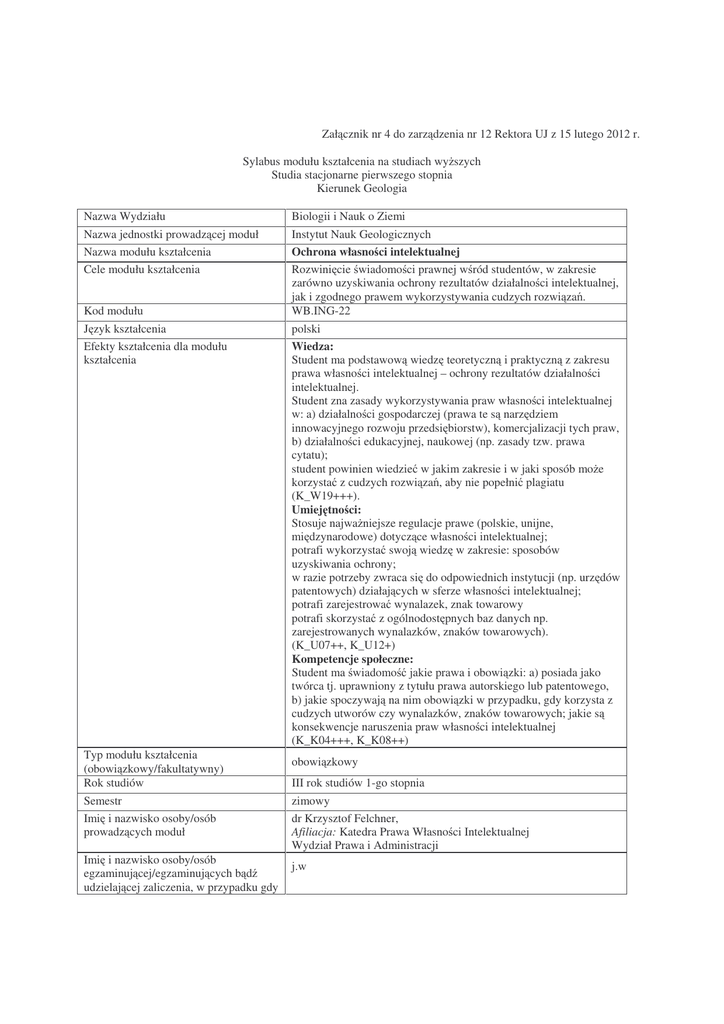Zał cznik nr 4 do zarz dzenia nr 12 Rektora UJ z 15 lutego 2012 r. Sylabus modułu kształcenia na studiach wy szych Studia stacjonarne pierwszego stopnia Kierunek Geologia Nazwa Wydziału Nazwa jednostki prowadz cej moduł Nazwa modułu kształcenia Cele modułu kształcenia Kod modułu J zyk kształcenia Efekty kształcenia dla modułu kształcenia Typ modułu kształcenia (obowi zkowy/fakultatywny) Rok studiów Semestr Imi i nazwisko osoby/osób prowadz cych moduł Imi i nazwisko osoby/osób egzaminuj cej/egzaminuj cych b d udzielaj cej zaliczenia, w przypadku gdy Biologii i Nauk o Ziemi Instytut Nauk Geologicznych Ochrona własno ci intelektualnej Rozwini cie wiadomo ci prawnej w ród studentów, w zakresie zarówno uzyskiwania ochrony rezultatów działalno ci intelektualnej, jak i zgodnego prawem wykorzystywania cudzych rozwi za . WB.ING-22 polski Wiedza: Student ma podstawow wiedz teoretyczn i praktyczn z zakresu prawa własno ci intelektualnej – ochrony rezultatów działalno ci intelektualnej. Student zna zasady wykorzystywania praw własno ci intelektualnej w: a) działalno ci gospodarczej (prawa te s narz dziem innowacyjnego rozwoju przedsi biorstw), komercjalizacji tych praw, b) działalno ci edukacyjnej, naukowej (np. zasady tzw. prawa cytatu); student powinien wiedzie w jakim zakresie i w jaki sposób mo e korzysta z cudzych rozwi za , aby nie popełni plagiatu (K_W19+++). Umiej tno ci: Stosuje najwa niejsze regulacje prawe (polskie, unijne, mi dzynarodowe) dotycz ce własno ci intelektualnej; potrafi wykorzysta swoj wiedz w zakresie: sposobów uzyskiwania ochrony; w razie potrzeby zwraca si do odpowiednich instytucji (np. urz dów patentowych) działaj cych w sferze własno ci intelektualnej; potrafi zarejestrowa wynalazek, znak towarowy potrafi skorzysta z ogólnodost pnych baz danych np. zarejestrowanych wynalazków, znaków towarowych). (K_U07++, K_U12+) Kompetencje społeczne: Student ma wiadomo jakie prawa i obowi zki: a) posiada jako twórca tj. uprawniony z tytułu prawa autorskiego lub patentowego, b) jakie spoczywaj na nim obowi zki w przypadku, gdy korzysta z cudzych utworów czy wynalazków, znaków towarowych; jakie s konsekwencje naruszenia praw własno ci intelektualnej (K_K04+++, K_K08++) obowi zkowy III rok studiów 1-go stopnia zimowy dr Krzysztof Felchner, Afiliacja: Katedra Prawa Własno ci Intelektualnej Wydział Prawa i Administracji j.w nie jest to osoba prowadz ca dany moduł Sposób realizacji Wymagania wst pne i dodatkowe Rodzaj i liczba godzin zaj dydaktycznych wymagaj cych bezpo redniego udziału nauczyciela akademickiego i studentów, gdy w danym module przewidziane s takie zaj cia Liczba punktów ECTS przypisana modułowi Bilans punktów ECTS Stosowane metody dydaktyczne Metody sprawdzania i kryteria oceny efektów kształcenia uzyskanych przez studentów Forma i warunki zaliczenia modułu, w tym zasady dopuszczenia do egzaminu, zaliczenia, a tak e forma i warunki zaliczenia poszczególnych zaj wchodz cych w zakres danego modułu Tre ci modułu kształcenia Zaj cia po 2 godziny tygodniowo przez 7 tygodni semestru zimowego i przygotowanie prezentacji na zadany temat. bez wymaga wst pnych 15 h konwersatorium 1 punkt ECTS udział w zaj ciach - 15 h przygotowanie wyst pienia, prezentacji itp. - 5 h przygotowanie do zaliczenia - 10 h suma - 30 h Wprowadzenie teoretyczne, dyskusja, przygotowanie wyst pie lub opracowa przez studentówstudentów Sprawdzanie zrozumienia zagadnie podczas dyskusji; ocena poprawno ci merytorycznej opracowa i prezentacji oraz testu zaliczeniowego. Obecno podczas zaj oraz zaliczenie testu 1. Wst p-podstawy prawa- obowi zywanie prawa 2. Wst p do prawa własno ci intelektualnej 3. Prawo autorskie ( ródła prawa-przedmiot (utwór), wył czenia spod ochrony, tzw. domena publiczna) 4. Prawo autorskie (podmiot prawa) 5. Prawo autorskie (tre praw autorskich: osobiste i maj tkowe oraz czas ich trwania + prawa pokrewne) 6. Prawo autorskie (dozwolony u ytek m.in.: osobisty, cytat) 7. Prawo autorskie (umowy dot. praw aut., odpowiedzialno z tytułu naruszenia prawa autorskiego, plagiat) 8. Prawo autorskie (organizacje zbiorowego zarz dzania, ochrona wizerunku, ochrona 9. Sui generis baz danych) 10. Prawo patentowe (wynalazki, wynalazki implementowane przy u yciu programów komputerowych, wzory u ytkowe) 11. Wzory przemysłowe, topografie układów scalonych 12. Prawo znaków towarowych 13. Oznaczenia geograficzne pochodzenia, prawo odmian ro lin 14. Ustawa o zwalczaniu nieuczciwej konkurencji 15. Komercjalizacja praw własno ci. Tre ci powy sze s przedstawiane przez prowadz cego podczas zaj ; studenci bior udział w dyskusji, mog by poproszeni o przygotowanie krótkich wyst pie - prezentacji na zadane tematy zwi zane z problematyk zaj . Wykaz literatury podstawowej i uzupełniaj cej, obowi zuj cej do zaliczenia danego modułu J. Barta, M. Czajkowska – D browska, Z. wi kalski, R. Markiewicz, E. Traple - Prawo autorskie i prawa pokrewne. Komentarz. Wyd. V 2011 r. M. Po niak – Niedzielska, J. Szczotka. M. Mozgawa, Prawo autorskie i prawa pokrewne. Zarys wykładu. Warszawa 2007 r. J. Barta, R. Markiewicz, Prawo autorskie 2010 r. M. du Vall, Prawo patentowe, Warszawa 2008 r. E. Nowi ska, U. Promi ska, M. du Vall, Prawo własno ci przemysłowej, LexisNexis 2008 r. T. Szymanek: Prawo własno ci przemysłowej. Podr cznik akademicki, Wydawnictwo - Europejska Wy sza Szkoła Prawa i Administracji, 2008 r. Ochrona własno ci intelektualnej, red. A. Adamczak, M du Vall, Warszawa 2010 r. Wymiar, zasady i forma odbywania praktyk, w przypadku, gdy program kształcenia przewiduje praktyki