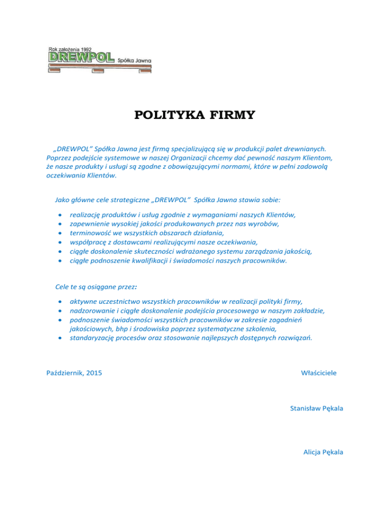POLITYKA FIRMY „DREWPOL” Spółka Jawna jest firmą specjalizującą się w produkcji palet drewnianych. Poprzez podejście systemowe w naszej Organizacji chcemy dać pewność naszym Klientom, że nasze produkty i usługi są zgodne z obowiązującymi normami, które w pełni zadowolą oczekiwania Klientów. Jako główne cele strategiczne „DREWPOL” Spółka Jawna stawia sobie: realizację produktów i usług zgodnie z wymaganiami naszych Klientów, zapewnienie wysokiej jakości produkowanych przez nas wyrobów, terminowość we wszystkich obszarach działania, współpracę z dostawcami realizującymi nasze oczekiwania, ciągłe doskonalenie skuteczności wdrażanego systemu zarządzania jakością, ciągłe podnoszenie kwalifikacji i świadomości naszych pracowników. Cele te są osiągane przez: aktywne uczestnictwo wszystkich pracowników w realizacji polityki firmy, nadzorowanie i ciągłe doskonalenie podejścia procesowego w naszym zakładzie, podnoszenie świadomości wszystkich pracowników w zakresie zagadnień jakościowych, bhp i środowiska poprzez systematyczne szkolenia, standaryzację procesów oraz stosowanie najlepszych dostępnych rozwiązań. Październik, 2015 Właściciele Stanisław Pękala Alicja Pękala