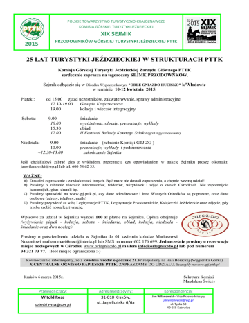 POLSKIE TOWARZYSTWO TURYSTYCZNO-KRAJOZNAWCZE KOMISJA GÓRSKIEJ TURYSTYKI JEŹDZIECKIEJ XIX SEJMIK PRZODOWNIKÓW GÓRSKIEJ TURYSTYKI JEŹDZIECKIEJ PTTK 2015 25 LAT TURYSTYKI JEŹDZIECKIEJ W STRUKTURACH PTTK Komisja Górskiej Turystyki Jeździeckiej Zarządu Głównego PTTK serdecznie zaprasza na tegoroczny SEJMK PRZODOWNKÓW. Sejmik odbędzie się w Ośrodku Wypoczynkowym "ORLE GNIAZDO HUCISKO" k/Włodowic w terminie 10-12 kwietnia 2015. Piątek : od 15.00 zjazd uczestników, zakwaterowanie, sprawy administracyjne 17.30-19.00 Gawęda Krajoznawcza 19.00 kolacja i wieczór integracyjny Sobota: 9.00 10.00 15.30 17.00 Niedziela: 9.00 10.00 ~12.30-13.00 śniadanie wyróżnienia, obrady, prezentacje, wykłady obiad II Festiwal Ballady Konnego Szlaku (grill z pysznościami) śniadanie (zebranie Komisji GTJ ZG ) prezentacje, wykłady i podsumowanie zakończenie Sejmiku Jeśli chciał(a)byś zabrać głos z wykładem, prezentacją czy opowiadaniem w trakcie Sejmiku proszę o kontakt: [email protected] lub tel. 600 58 62 35. WAŻNE: A) Dostałeś zaproszenie - zawiadom też innych. Być może nie dostali zaproszenia, a chętnie wezmą udział! B) Prosimy o zabranie również informatorów, folderów, wizytówek i zdjęć o swoich Ośrodkach. Nie zapomnijcie harmonijek, gitar, drumli itp. C) Prosimy sprawdzić na www.gtj.pttk.pl, czy dane teleadresowe i inne Waszych Ośrodków są poprawne, oraz dane osobowe (adresy, telefony, maile) D) Prosimy przywieźć ze sobą Legitymacje PTTK, Legitymacje Przodownickie, Książeczki Jeździeckie oraz zdjęcie, gdy trzeba zrobić nową legitymację. Wpisowe za udział w Sejmiku wynosi 160 zł płatne na Sejmiku. Opłata obejmuje /wyżywienie piątek - kolacja, sobota - śniadanie, obiad, kolacja, niedziela śniadanie oraz dwa noclegi/ Prosimy o potwierdzenie udziału w Sejmiku do 01 kwietnia koledze Mariuszowi Noconiowi mailem [email protected] lub SMS na numer 602 176 699. Jednocześnie prosimy o rezerwacje miejsc noclegowych w Ośrodku www.orlegniazdo.pl mailem [email protected] lub pod numerem 34 321 73 77. ilość miejsc ograniczona :-) Równocześnie informujemy, że 2 kwietnia /środa/ o godzinie 21.37 rozpalamy na Hali Boraczej (Węgierska Górka) X CENTRALNE OGNISKO PAPIESKIE PTTK. ZAPRASZAMY DO UDZIAŁU. Szczegóły na www.gtj.pttk.pl Kraków 6 marca 2015r. Przewodniczący: Witold Rosa [email protected] Sekretarz Komisji Magdalena Świeży Adres rejestracyjny: Korespondencja: 31-010 Kraków, ul. Jagiellońska 6/6a Jan Wilanowski – Vice Przewodniczący [email protected] ul. Tyska 50 40-655 Katowice