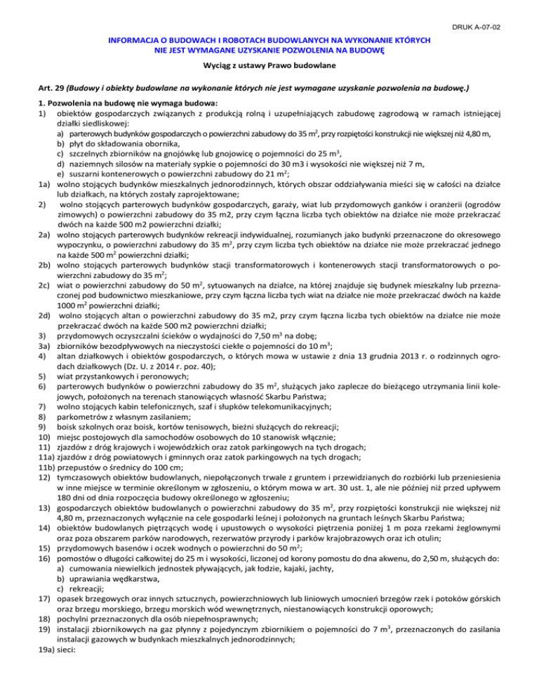 DRUK A-07-02 INFORMACJA O BUDOWACH I ROBOTACH BUDOWLANYCH NA WYKONANIE KTÓRYCH NIE JEST WYMAGANE UZYSKANIE POZWOLENIA NA BUDOWĘ Wyciąg z ustawy Prawo budowlane Art. 29 (Budowy i obiekty budowlane na wykonanie których nie jest wymagane uzyskanie pozwolenia na budowę.) 1. Pozwolenia na budowę nie wymaga budowa: 1) obiektów gospodarczych związanych z produkcją rolną i uzupełniających zabudowę zagrodową w ramach istniejącej działki siedliskowej: a) parterowych budynków gospodarczych o powierzchni zabudowy do 35 m2, przy rozpiętości konstrukcji nie większej niż 4,80 m, b) płyt do składowania obornika, c) szczelnych zbiorników na gnojówkę lub gnojowicę o pojemności do 25 m3, d) naziemnych silosów na materiały sypkie o pojemności do 30 m3 i wysokości nie większej niż 7 m, e) suszarni kontenerowych o powierzchni zabudowy do 21 m2; 1a) wolno stojących budynków mieszkalnych jednorodzinnych, których obszar oddziaływania mieści się w całości na działce lub działkach, na których zostały zaprojektowane; 2) wolno stojących parterowych budynków gospodarczych, garaży, wiat lub przydomowych ganków i oranżerii (ogrodów zimowych) o powierzchni zabudowy do 35 m2, przy czym łączna liczba tych obiektów na działce nie może przekraczać dwóch na każde 500 m2 powierzchni działki; 2a) wolno stojących parterowych budynków rekreacji indywidualnej, rozumianych jako budynki przeznaczone do okresowego wypoczynku, o powierzchni zabudowy do 35 m2, przy czym liczba tych obiektów na działce nie może przekraczać jednego na każde 500 m2 powierzchni działki; 2b) wolno stojących parterowych budynków stacji transformatorowych i kontenerowych stacji transformatorowych o powierzchni zabudowy do 35 m2; 2c) wiat o powierzchni zabudowy do 50 m2, sytuowanych na działce, na której znajduje się budynek mieszkalny lub przeznaczonej pod budownictwo mieszkaniowe, przy czym łączna liczba tych wiat na działce nie może przekraczać dwóch na każde 1000 m2 powierzchni działki; 2d) wolno stojących altan o powierzchni zabudowy do 35 m2, przy czym łączna liczba tych obiektów na działce nie może przekraczać dwóch na każde 500 m2 powierzchni działki; 3) przydomowych oczyszczalni ścieków o wydajności do 7,50 m3 na dobę; 3a) zbiorników bezodpływowych na nieczystości ciekłe o pojemności do 10 m3; 4) altan działkowych i obiektów gospodarczych, o których mowa w ustawie z dnia 13 grudnia 2013 r. o rodzinnych ogrodach działkowych (Dz. U. z 2014 r. poz. 40); 5) wiat przystankowych i peronowych; 6) parterowych budynków o powierzchni zabudowy do 35 m2, służących jako zaplecze do bieżącego utrzymania linii kolejowych, położonych na terenach stanowiących własność Skarbu Państwa; 7) wolno stojących kabin telefonicznych, szaf i słupków telekomunikacyjnych; 8) parkometrów z własnym zasilaniem; 9) boisk szkolnych oraz boisk, kortów tenisowych, bieżni służących do rekreacji; 10) miejsc postojowych dla samochodów osobowych do 10 stanowisk włącznie; 11) zjazdów z dróg krajowych i wojewódzkich oraz zatok parkingowych na tych drogach; 11a) zjazdów z dróg powiatowych i gminnych oraz zatok parkingowych na tych drogach; 11b) przepustów o średnicy do 100 cm; 12) tymczasowych obiektów budowlanych, niepołączonych trwale z gruntem i przewidzianych do rozbiórki lub przeniesienia w inne miejsce w terminie określonym w zgłoszeniu, o którym mowa w art. 30 ust. 1, ale nie później niż przed upływem 180 dni od dnia rozpoczęcia budowy określonego w zgłoszeniu; 13) gospodarczych obiektów budowlanych o powierzchni zabudowy do 35 m2, przy rozpiętości konstrukcji nie większej niż 4,80 m, przeznaczonych wyłącznie na cele gospodarki leśnej i położonych na gruntach leśnych Skarbu Państwa; 14) obiektów budowlanych piętrzących wodę i upustowych o wysokości piętrzenia poniżej 1 m poza rzekami żeglownymi oraz poza obszarem parków narodowych, rezerwatów przyrody i parków krajobrazowych oraz ich otulin; 15) przydomowych basenów i oczek wodnych o powierzchni do 50 m2; 16) pomostów o długości całkowitej do 25 m i wysokości, liczonej od korony pomostu do dna akwenu, do 2,50 m, służących do: a) cumowania niewielkich jednostek pływających, jak łodzie, kajaki, jachty, b) uprawiania wędkarstwa, c) rekreacji; 17) opasek brzegowych oraz innych sztucznych, powierzchniowych lub liniowych umocnień brzegów rzek i potoków górskich oraz brzegu morskiego, brzegu morskich wód wewnętrznych, niestanowiących konstrukcji oporowych; 18) pochylni przeznaczonych dla osób niepełnosprawnych; 19) instalacji zbiornikowych na gaz płynny z pojedynczym zbiornikiem o pojemności do 7 m3, przeznaczonych do zasilania instalacji gazowych w budynkach mieszkalnych jednorodzinnych; 19a) sieci: DRUK A-07-02 a) elektroenergetycznych obejmujących napięcie znamionowe nie wyższe niż 1 kV, b) wodociągowych, c) kanalizacyjnych, d) cieplnych, e) telekomunikacyjnych; 20) przyłączy: elektroenergetycznych, wodociągowych, kanalizacyjnych, gazowych, cieplnych i telekomunikacyjnych; 20a) telekomunikacyjnych linii kablowych; 20b) kanalizacji kablowej; 21) urządzeń pomiarowych, wraz z ogrodzeniami i drogami wewnętrznymi, państwowej służby hydrologiczno-meteorologicznej i państwowej służby hydrogeologicznej: a) posterunków: wodowskazowych, meteorologicznych, opadowych oraz wód podziemnych, b) punktów: obserwacyjnych stanów wód podziemnych oraz monitoringu jakości wód podziemnych, c) piezometrów obserwacyjnych i obudowanych źródeł; 22) obiektów małej architektury; 23) ogrodzeń; 24) obiektów przeznaczonych do czasowego użytkowania w trakcie realizacji robót budowlanych, położonych na terenie budowy, oraz ustawianie barakowozów używanych przy wykonywaniu robót budowlanych, badaniach geologicznych i pomiarach geodezyjnych; 25) tymczasowych obiektów budowlanych stanowiących wyłącznie eksponaty wystawowe, niepełniących 