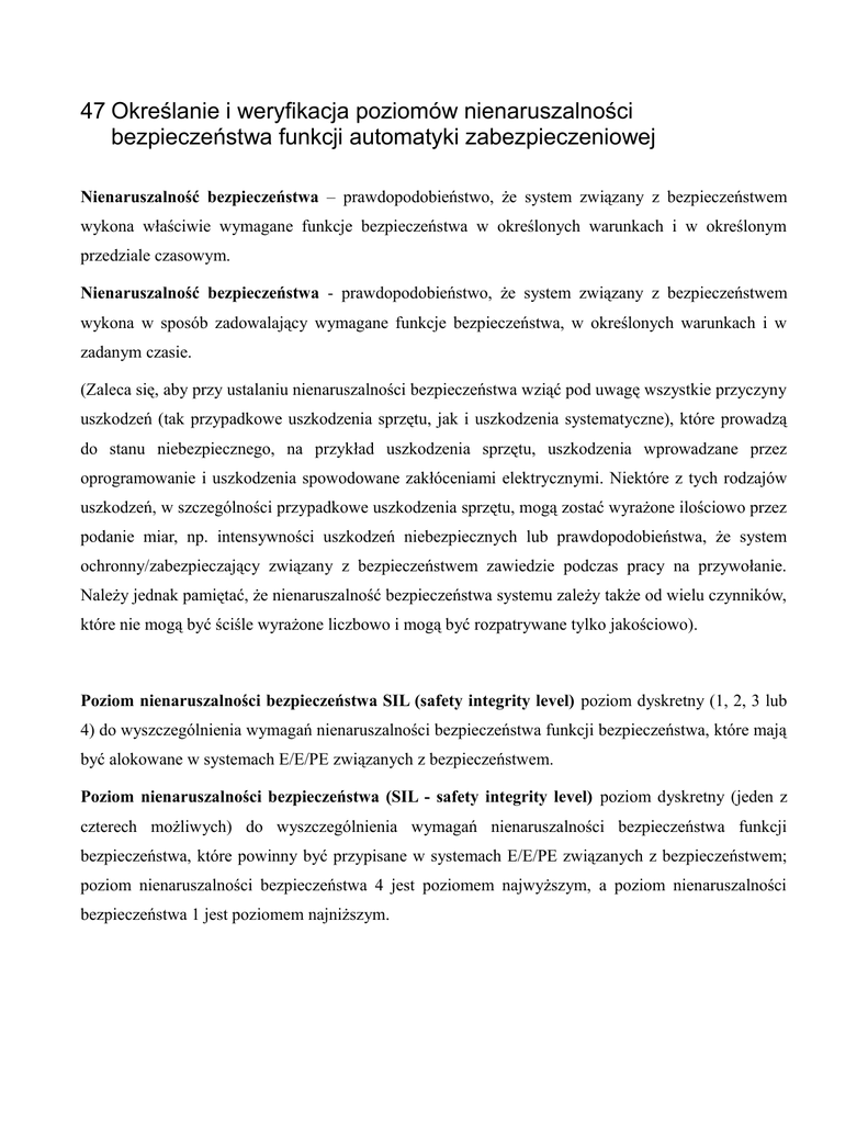47 Określanie i weryfikacja poziomów nienaruszalności bezpieczeństwa funkcji automatyki zabezpieczeniowej Nienaruszalność bezpieczeństwa – prawdopodobieństwo, że system związany z bezpieczeństwem wykona właściwie wymagane funkcje bezpieczeństwa w określonych warunkach i w określonym przedziale czasowym. Nienaruszalność bezpieczeństwa - prawdopodobieństwo, że system związany z bezpieczeństwem wykona w sposób zadowalający wymagane funkcje bezpieczeństwa, w określonych warunkach i w zadanym czasie. (Zaleca się, aby przy ustalaniu nienaruszalności bezpieczeństwa wziąć pod uwagę wszystkie przyczyny uszkodzeń (tak przypadkowe uszkodzenia sprzętu, jak i uszkodzenia systematyczne), które prowadzą do stanu niebezpiecznego, na przykład uszkodzenia sprzętu, uszkodzenia wprowadzane przez oprogramowanie i uszkodzenia spowodowane zakłóceniami elektrycznymi. Niektóre z tych rodzajów uszkodzeń, w szczególności przypadkowe uszkodzenia sprzętu, mogą zostać wyrażone ilościowo przez podanie miar, np. intensywności uszkodzeń niebezpiecznych lub prawdopodobieństwa, że system ochronny/zabezpieczający związany z bezpieczeństwem zawiedzie podczas pracy na przywołanie. Należy jednak pamiętać, że nienaruszalność bezpieczeństwa systemu zależy także od wielu czynników, które nie mogą być ściśle wyrażone liczbowo i mogą być rozpatrywane tylko jakościowo). Poziom nienaruszalności bezpieczeństwa SIL (safety integrity level) poziom dyskretny (1, 2, 3 lub 4) do wyszczególnienia wymagań nienaruszalności bezpieczeństwa funkcji bezpieczeństwa, które mają być alokowane w systemach E/E/PE związanych z bezpieczeństwem. Poziom nienaruszalności bezpieczeństwa (SIL - safety integrity level) poziom dyskretny (jeden z czterech możliwych) do wyszczególnienia wymagań nienaruszalności bezpieczeństwa funkcji bezpieczeństwa, które powinny być przypisane w systemach E/E/PE związanych z bezpieczeństwem; poziom nienaruszalności bezpieczeństwa 4 jest poziomem najwyższym, a poziom nienaruszalności bezpieczeństwa 1 jest poziomem najniższym. Rys. 47.1. Określenie wymaganego poziomu SIL na podstawie grafu ryzyka Weryfikacja: • Metoda jakościowa Rys. 47.2. Metoda jakościowa oceny poziomu SIL • Metoda ilościowa Rys. 47.3. Kryteria probabilistyczne do weryfikacji SIL Rys. 47.4 Wyznaczenie PFD podsystemu (ZRODLA/47/*.pdf)