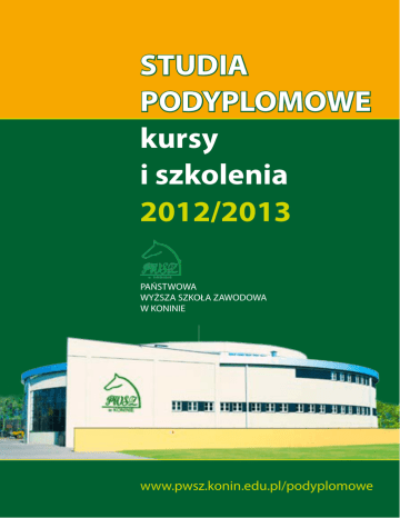 STUDIA PODYPLOMOWE kursy i szkolenia 2012/2013 PAŃSTWOWA WYŻSZA SZKOŁA ZAWODOWA W KONINIE www.pwsz.konin.edu.pl/podyplomowe STUDIA PODYPLOMOWE Zgłoszenia osobiste lub listowne należy składać w Dziekanacie Wydziału Społeczno-Technicznego ul. Przyjaźni 1 (pok. 6 lub 7), 62-510 Konin Dodatkowe informacje można uzyskać pod numerem telefonu: 63-249-72-34 lub drogą elektroniczną: [email protected] Wymagane dokumenty: 1.podanie o przyjęcie na studia lub kurs 2.kwestionariusz osobowy 3.odpis dyplomu ukończenia studiów (w przypadku kursów – świadectwo ukończenia szkoły średniej/ ponadgimnazjalnej) 4.dwie fotografie legitymacyjne 5.kserokopia dowodu osobistego 6.ankieta dla kandydata na studia podyplomowe 4 Administracja samorządowa 6 Akademia Marketingu Praktycznego 7 Akademia Trenerów Biznesu 8 Animator i menadżer kultury 9 Bankowość i analiza finansowa 10 Business English 11 Edukacja artystyczna z opieką nad małym dzieckiem 12 Finanse i inwestycje samorządowe 13 Kompetencje pedagogiczne nauczyciela 14 Menedżer rozwoju lokalnego i regionalnego 15 Menedżer turystyki i rekreacji 16 Organizacja i zarządzanie w sektorze publicznym 17 Podatki i skarbowość 18 Profilaktyka społeczna i resocjalizacja 19 Rachunkowość 20 Translacja z elementami biznesu – język niemiecki 21 Wdrażanie i rozliczanie projektów unijnych 22 Zarządzanie bezpieczeństwem i higieną pracy 23 Zarządzanie jakością 24 Zarządzanie kadrami i prawo pracy 25 KURSY JĘZYKOWE 26 SZKOLENIA 27 3 Szanowni Państwo, kształcenie ustawiczne, czyli rozwijanie wiedzy, umiejętności i kwalifikacji przez całe życie, uznawane jest obecnie za jeden z najważniejszych czynników wpływających na wzrost gospodarczy i rozwój społeczny. Każdego roku, w różnych formach tego kształcenia uczestniczy co trzeci obywatel Unii Europejskiej w wieku od 25 do 64 lat. 4 się minimalnej wymaganej liczby kandydatów (po zebraniu grupy). Formami kształcenia ustawicznego są studia podyplomowe, kursy i szkolenia przeznaczone dla osób, które chcą poszerzyć, uzupełnić i zaktualizować posiadaną wiedzę lub planują zmianę profilu zawodowego i przekwalifikowanie się. O dużej popularności tych form kształcenia, a w szczególności studiów podyplomowych świadczy liczba słuchaczy wynosząca w Polsce obecnie ponad 180 tys. osób. Studia podyplomowe i kursy prowadzone przez PWSZ w Koninie trwają dwa lub trzy semestry, natomiast szkolenia kilka lub kilkanaście dni. Zajęcia na studiach odbywają się w weekendy, natomiast na kursach i szkoleniach również w dni robocze. Koszt uczestnictwa w poszczególnych studiach waha się od 1100 do 1600 zł za semestr, w kursach od 450 za semestr, natomiast w szkoleniach od 300 zł. Opłata za studia podyplomowe wnoszona jest w dwóch lub trzech ratach semestralnych, ale istnieje możliwość rozłożenia opłaty na większą liczbę rat. Ponadto, słuchacz może ubiegać się o dofinansowanie z zakładu pracy. Nie przewiduje się opłat rekrutacyjnych. Państwowa Wyższa Szkoła Zawodowa w Koninie oferuje 20 studiów podyplomowych oraz kilka kursów i szkoleń. Przyjęcie na studia lub kurs nie wymaga zdawania egzaminów wstępnych, lecz następuje na podstawie złożonego podania wraz z załącznikami. Z kolei przyjęcie na szkolenie następuje na podstawie złożonego formularza zgłoszeniowego. Studia, kursy i szkolenia uruchamiane są w momencie zgłoszenia Warunkiem ukończenia studiów lub kursu jest uzyskanie zaliczeń i zdanie egzaminów z przedmiotów określonych w planie studiów lub kursu oraz złożenie egzaminu końcowego lub obrona pracy podyplomowej. Absolwenci studiów otrzymują świadectwo ukończenia studiów podyplomowych, zgodne z wytycznymi określonymi przez Ministra Nauki i Szkolnictwa Wyższego, absolwenci kursów – świadectwo ukoń- czenia kursu dokształcającego, natomiast uczestnicy szkoleń – zaświadczenie o ukończeniu szkolenia. Ponadto w przypadku studiów podyplomowych organizowanych na mocy porozumienia z innymi instytucjami, absolwenci otrzymają dyplom wystawiany przez PWSZ w Koninie wspólnie z partnerem. W roku akademickim 2011/2012 na studiach podyplomowych w PWSZ w Koninie kształciło się 366 słuchaczy. W ciągu 14 lat funkcjonowania Uczelni zrealizowano i zakończono 75 edycji studiów, które ukończyło 2.712 osób. Od roku akademickiego 2012/2013 słuchacze wybranych studiów podyplomowych będą mieli możliwość uczestniczenia w bezpłatnych zajęciach z języka angielskiego, ściśle związanych z problematyką studiów. Zachęcamy do skorzystania z naszej oferty. dr Artur Zimny Pełnomocnik Rektora ds. Studiów Podyplomowych PAŃSTWOWA WYŻSZA SZKOŁA ZAWODOWA W KONINIE 5 ADMINISTRACJA SAMORZĄDOWA Studia są organizowane we współpracy z Urzędem Miejskim w Koninie Cel Zapoznanie słuchaczy z prawno-finansowymi aspektami funkcjonowania administracji, zaprezentowanie możliwości zastosowania technologii informacyjnych w jednostkach samorządowych oraz przygotowanie do pracy w różnych obszarach i na różnych szczeblach administracji samorządowej. Adresaci Studia przeznaczone są dla absolwentów szkół wyższych o profilu ekonomicznym, politologicznym, administracyjnym i prawniczym, zainteresowanych prawno-finansowymi aspektami funkcjonowania administracji samorządowej, a także dla pracowników i kadry wszystkich szczebli administracji samorządowej. Wykładowcy Kadrę dydaktyczną stanowią pracownicy urzędu miasta, prawnicy specjalizujący się w zakresie prawa administracyjnego i zamówień publicznych, osoby z wieloletnim doświadczeniem w pracy w administracji samorządowej oraz wykładowcy zajmujący się teoretycznymi aspektami administracji publicznej. 6 Plan studiów ·• wstęp do nauki o państwie i prawie • prawo i postępowanie administracyjne • ustrój samorządu terytorialnego w Polsce • regionalizm w UE • instytucje nadzoru i kontroli samorządu terytorialnego • finan