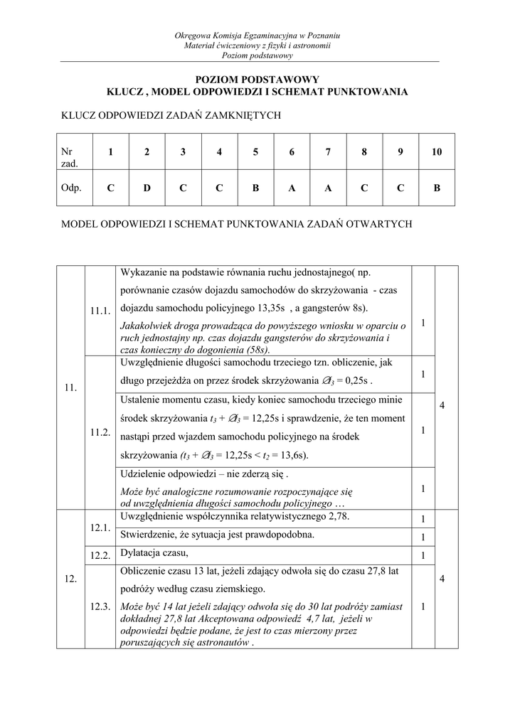 Okręgowa Komisja Egzaminacyjna w Poznaniu Materiał ćwiczeniowy z fizyki i astronomii Poziom podstawowy POZIOM PODSTAWOWY KLUCZ , MODEL ODPOWIEDZI I SCHEMAT PUNKTOWANIA KLUCZ ODPOWIEDZI ZADAŃ ZAMKNIĘTYCH Nr zad. 1 2 3 4 5 6 7 8 9 10 Odp. C D C C B A A C C B MODEL ODPOWIEDZI I SCHEMAT PUNKTOWANIA ZADAŃ OTWARTYCH Wykazanie na podstawie równania ruchu jednostajnego( np. porównanie czasów dojazdu samochodów do skrzyŜowania - czas 11.1. dojazdu samochodu policyjnego 13,35s , a gangsterów 8s). Jakakolwiek droga prowadząca do powyŜszego wniosku w oparciu o ruch jednostajny np. czas dojazdu gangsterów do skrzyŜowania i czas konieczny do dogonienia (58s). Uwzględnienie długości samochodu trzeciego tzn. obliczenie, jak długo przejeŜdŜa on przez środek skrzyŜowania ∆t3 = 0,25s . 11. 1 1 Ustalenie momentu czasu, kiedy koniec samochodu trzeciego minie 4 środek skrzyŜowania t3 + ∆t3 = 12,25s i sprawdzenie, Ŝe ten moment 11.2. nastąpi przed wjazdem samochodu policyjnego na środek 1 skrzyŜowania (t3 + ∆t3 = 12,25s < t2 = 13,6s). Udzielenie odpowiedzi – nie zderzą się . 12.1. 12. 1 MoŜe być analogiczne rozumowanie rozpoczynające się od uwzględnienia długości samochodu policyjnego … Uwzględnienie współczynnika relatywistycznego 2,78. 1 Stwierdzenie, Ŝe sytuacja jest prawdopodobna. 1 12.2. Dylatacja czasu, Obliczenie czasu 13 lat, jeŜeli zdający odwoła się do czasu 27,8 lat 1 4 podróŜy według czasu ziemskiego. 12.3. MoŜe być 14 lat jeŜeli zdający odwoła się do 30 lat podróŜy zamiast dokładnej 27,8 lat Akceptowana odpowiedź 4,7 lat, jeŜeli w odpowiedzi będzie podane, Ŝe jest to czas mierzony przez poruszających się astronautów . 1 Okręgowa Komisja Egzaminacyjna w Poznaniu Materiał ćwiczeniowy z fizyki i astronomii Poziom podstawowy 13.1. Emisja wymuszona. Uwzględnienie wzoru określającego energię fotonu E = hυ. 1 1 Uwzględnienie, Ŝe moc jest proporcjonalna do liczby fotonów w 13. . 13.2. jednostce czasu i energii fotonu P = hυ = hυ N/t. Podanie odpowiedzi „ Więcej fotonów jest w wiązce lasera 14. Uzupełnienie wartości Liczba protonów 89, Liczba neutronów 133 . 14.2. Uzupełnienie reakcji o 87 Fr Napisanie liczby masowej 218 . 14.3. (nie jest konieczne wpisanie cząstki α po prawej stronie reakcji) Wpisanie czasu 5s. 1 1 4 1 1 . 15. 4 1 drugiego”. 14.1. 1 15.1. Wykazanie zmiany pędu 13kg m/s (∆p = mv1 + m v2 15.2. Obliczenie siły z II zasady dynamiki Newtona F=∆p/∆t = 650N Obliczenie k = 2170 N/m. 15.3. Uzasadnienie oparte na tym, Ŝe k nie jest stałe (tylko uśredniane). 1 1 1 4 1 Poprawny rysunki, uwzględniające ogniskowanie za siatkówką w 16.1. przypadku dalekowzroczności i przed siatkówką, w przypadku krótkowzroczności. 16. 16.2. Poprawne wpisanie : soczewka skupiająca dla dalekowzroczności i rozpraszająca dla krótkowzroczności. Narysowanie poprawnego biegu promieni za soczewkami i przed okiem. 16.3. Narysowanie promieni ogniskujących się na siatkówce w obydwu przypadkach. Podanie ,Ŝe synteza termojądrowa polega na łączeniu się jąder 17.1. lekkich ( moŜe być przykład wodoru) Wyjaśnienie, Ŝe wydzielanie energii wynika z defektu masy. 1 4 1 1 1 1 Wyjaśnienie przyczyny wysokiej temperatury – 17.. 17.2 18. 1 duŜa energia kinetyczna i dlatego moŜliwe pokonanie odpychania elektrostatycznego . Wyjaśnienie przyczyny wysokiego ciśnienia – 4 1 1 duŜe prawdopodobieństwo zderzeń. Miedź jest diamagnetykiem a stal (Ŝelazo) ferromagnetykiem. 1 Gwoździe Ŝelazne zostaną przyciągnięte, a miedziane nie. 1 2 Okręgowa Komisja Egzaminacyjna w Poznaniu Materiał ćwiczeniowy z fizyki i astronomii Poziom podstawowy Wykazanie w oparciu o tę samą odległość obrazu od soczewki w 19.1. 19. 1 obydwu przypadkach. Uwzględnienie równania soczewki i powiększenia p= D/x . 19.2. Uwzględnienie D = 25cm . 1 Obliczenie ogniskowej 0,6cm . 2 Uwzględnienie Ŝe E= P/4πr . 20. 1 2 Obliczenie E = 1300 W/m . 4 1 1 1 2 Uwzględnienie, ustawienia soczewki pomiędzy Ŝaróweczką 1 i ekranem 21. Uwzględnienie obserwacji obrazu na ekranie. 1 Pomiar odległości x i y. 1 Wyjaśnienie ( odwołanie się do ) równania soczewki gdzie Z = 1/f. 1 RAZEM OTWARTE 4 40