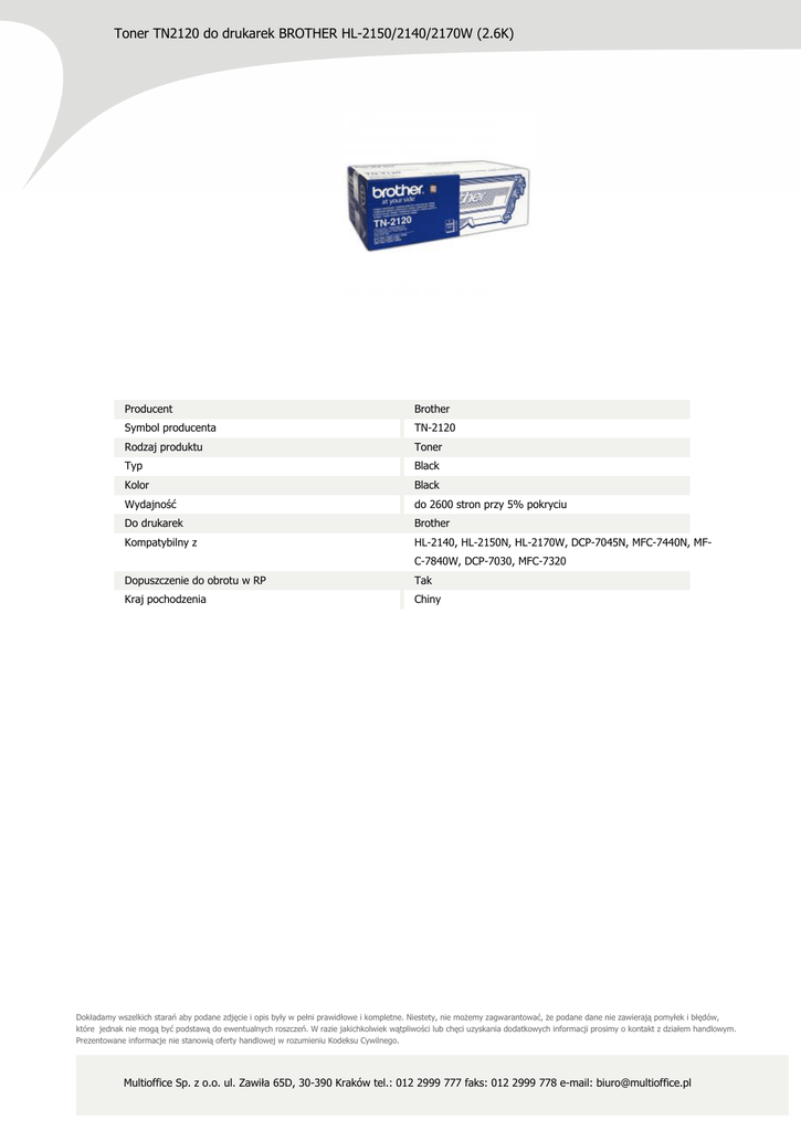 Toner TN2120 do drukarek BROTHER HL-2150/2140/2170W (2.6K) Producent Brother Symbol producenta TN-2120 Rodzaj produktu Toner Typ Black Kolor Black Wydajność do 2600 stron przy 5% pokryciu Do drukarek Brother Kompatybilny z HL-2140, HL-2150N, HL-2170W, DCP-7045N, MFC-7440N, MFC-7840W, DCP-7030, MFC-7320 Dopuszczenie do obrotu w RP Tak Kraj pochodzenia Chiny Dokładamy wszelkich starań aby podane zdjęcie i opis były w pełni prawidłowe i kompletne. Niestety, nie możemy zagwarantować, że podane dane nie zawierają pomyłek i błędów, które jednak nie mogą być podstawą do ewentualnych roszczeń. W razie jakichkolwiek wątpliwości lub chęci uzyskania dodatkowych informacji prosimy o kontakt z działem handlowym. Prezentowane informacje nie stanowią oferty handlowej w rozumieniu Kodeksu Cywilnego. Multioffice Sp. z o.o. ul. Zawiła 65D, 30-390 Kraków tel.: 012 2999 777 faks: 012 2999 778 e-mail: [email protected]