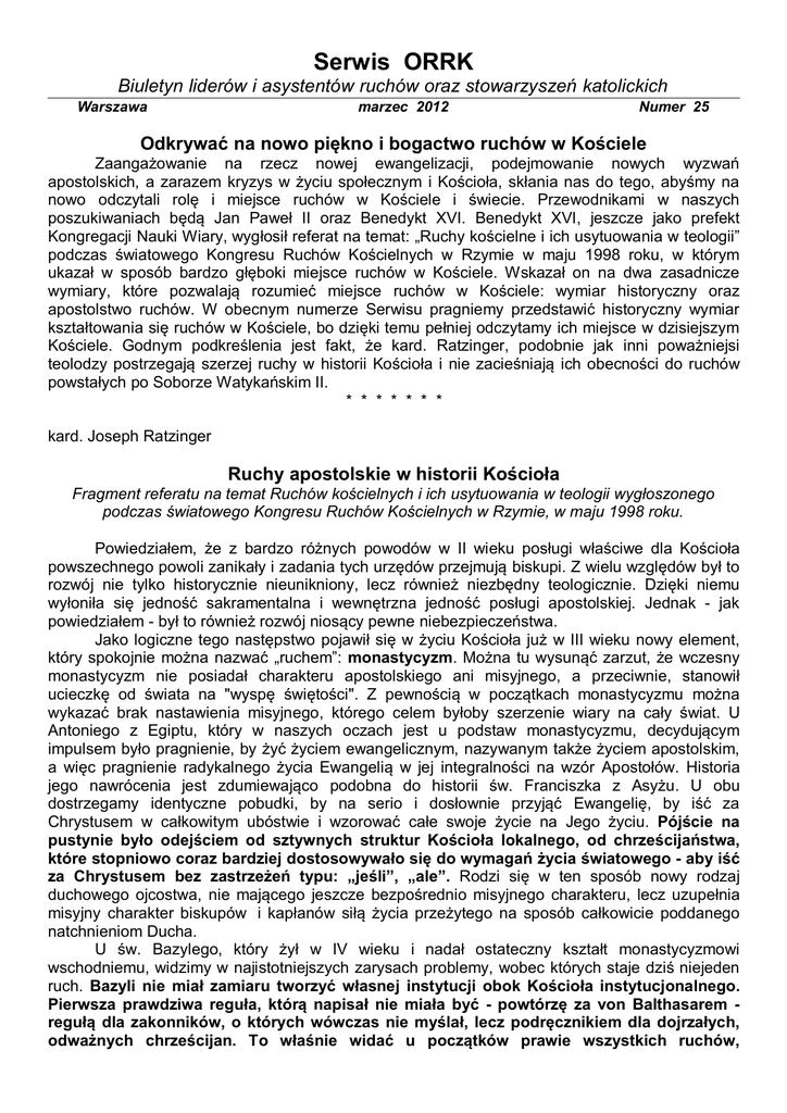 Serwis ORRK Biuletyn liderów i asystentów ruchów oraz stowarzyszeń katolickich Warszawa marzec 2012 Numer 25 Odkrywać na nowo piękno i bogactwo ruchów w Kościele Zaangażowanie na rzecz nowej ewangelizacji, podejmowanie nowych wyzwań apostolskich, a zarazem kryzys w życiu społecznym i Kościoła, skłania nas do tego, abyśmy na nowo odczytali rolę i miejsce ruchów w Kościele i świecie. Przewodnikami w naszych poszukiwaniach będą Jan Paweł II oraz Benedykt XVI. Benedykt XVI, jeszcze jako prefekt Kongregacji Nauki Wiary, wygłosił referat na temat: „Ruchy kościelne i ich usytuowania w teologii” podczas światowego Kongresu Ruchów Kościelnych w Rzymie w maju 1998 roku, w którym ukazał w sposób bardzo głęboki miejsce ruchów w Kościele. Wskazał on na dwa zasadnicze wymiary, które pozwalają rozumieć miejsce ruchów w Kościele: wymiar historyczny oraz apostolstwo ruchów. W obecnym numerze Serwisu pragniemy przedstawić historyczny wymiar kształtowania się ruchów w Kościele, bo dzięki temu pełniej odczytamy ich miejsce w dzisiejszym Kościele. Godnym podkreślenia jest fakt, że kard. Ratzinger, podobnie jak inni poważniejsi teolodzy postrzegają szerzej ruchy w historii Kościoła i nie zacieśniają ich obecności do ruchów powstałych po Soborze Watykańskim II. * * * * * * * kard. Joseph Ratzinger Ruchy apostolskie w historii Kościoła Fragment referatu na temat Ruchów kościelnych i ich usytuowania w teologii wygłoszonego podczas światowego Kongresu Ruchów Kościelnych w Rzymie, w maju 1998 roku. Powiedziałem, że z bardzo różnych powodów w II wieku posługi właściwe dla Kościoła powszechnego powoli zanikały i zadania tych urzędów przejmują biskupi. Z wielu względów był to rozwój nie tylko historycznie nieunikniony, lecz również niezbędny teologicznie. Dzięki niemu wyłoniła się jedność sakramentalna i wewnętrzna jedność posługi apostolskiej. Jednak - jak powiedziałem - był to również rozwój niosący pewne niebezpieczeństwa. Jako logiczne tego następstwo pojawił się w życiu Kościoła już w III wieku nowy element, który spokojnie można nazwać „ruchem”: monastycyzm. Można tu wysunąć zarzut, że wczesny monastycyzm nie posiadał charakteru apostolskiego ani misyjnego, a przeciwnie, stanowił ucieczkę od świata na "wyspę świętości". Z pewnością w początkach monastycyzmu można wykazać brak nastawienia misyjnego, którego celem byłoby szerzenie wiary na cały świat. U Antoniego z Egiptu, który w naszych oczach jest u podstaw monastycyzmu, decydującym impulsem było pragnienie, by żyć życiem ewangelicznym, nazywanym także życiem apostolskim, a więc pragnienie radykalnego życia Ewangelią w jej integralności na wzór Apostołów. Historia jego nawrócenia jest zdumiewająco podobna do historii św. Franciszka z Asyżu. U obu dostrzegamy identyczne pobudki, by na serio i dosłownie przyjąć Ewangelię, by iść za Chrystusem w całkowitym ubóstwie i wzorować całe swoje życie na Jego życiu. Pójście na pustynie było odejściem od sztywnych struktur Kościoła lokalnego, od chrześcijaństwa, które stopniowo coraz bardziej dostosowywało się do wymagań życia światowego - aby iść za Chrystusem bez zastrzeżeń typu: „jeśli”, „ale”. Rodzi się w ten sposób nowy rodzaj duchowego ojcostwa, nie mającego jeszcze bezpośrednio misyjnego charakteru, lecz uzupełnia misyjny charakter biskupów i kapłanów siłą życia przeżytego na sposób całkowicie poddanego natchnieniom Ducha. U św. Bazylego, który żył w IV wieku i nadał ostateczny kształt monastycyzmowi wschodniemu, widzimy w najistotniejszych zarysach problemy, wobec których staje dziś niejeden ruch. Bazyli nie miał zamiaru tworzyć własnej instytucji obok Kościoła instytucjonalnego. Pierwsza prawdziwa reguła, którą napisał nie miała być - powtórzę za von Balthasarem regułą dla zakonników, o których wówczas nie myślał, lecz podręcznikiem dla dojrzałych, odważnych chrześcijan. To właśnie widać u początków prawie wszystkich ruchów, zwłaszcza powstałych w naszym stuleciu. Nie myśli się o zorganizowaniu nowej wspólnoty, ale poszukuje się integralnego chrześcijaństwa żyjącego Ewangelią w Kościele. Bazyli, który początkowo był mnichem, przyjął sakrę biskupią, podkreślając w ten sposób jej charyzmatyczność, wewnętrzną jedność Kościoła, przeżywanego przez biskupa w jego osobistym życiu. Historia Bazylego jest analogiczna do historii współczesnych ruchów. Musiał on z upływem czasu przyznać, że ruch radykalnego naśladowania Chrystusa nie dał się wtopić w rzeczywistość Kościoła lokalnego. W drugiej wersji jego regułę, którą Gribemont nazywa „małym asketikonem”, ukazuje się jego idea ruchu jako formy pośredniej, pomiędzy grupą dojrzałych chrześcijan, otwartych na Kościół a zakonem mnichów, którzy się organizują aby stać się instytucją. Sam Gribemont widzi we wspólnocie monastycznej założonej ostatecznie przez Bazylego „małą grupę ożywiającą całość” i nie waha się uznać Bazylego za „patrona nie tylko zakonów zaangażowanych w nauczanie i dzieła charytatywne, lecz także nowych wspólnot bez ślubów”. Jasne jest więc, że ruch monastyczny stwarza nowy ośrodek życia, który nie usuwa się ze struktury Kościoła lokalnego poapostolskiego, ale się z nią też bez reszty nie utożsamia, ponieważ działa w jego obrębie jako ożywiająca siła i zarazem stanowi rezerwuar z którego Kościół lokalny może czerpać, aby duchowieństwo było bardziej uduchowione, a instytucja i charyzmat spotkały się ze sobą w nowej formie. Znamienne jest to, że Kościół wschodni wybiera swoich biskupów właśnie ze wspólnot monastycznych i tym samym w urzędzie biskupa podkreśla się element charyzmatyczny, który nieustannie się odnawia przez nawiązanie do wymiaru apostolskiego. Jeśli sp
