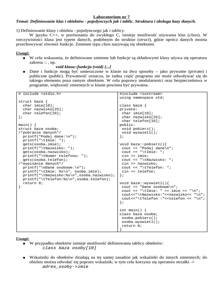 Temat: Definiowanie klas i obiektów - pojedynczych jak i tablic. Struktura i obsługa bazy danych.