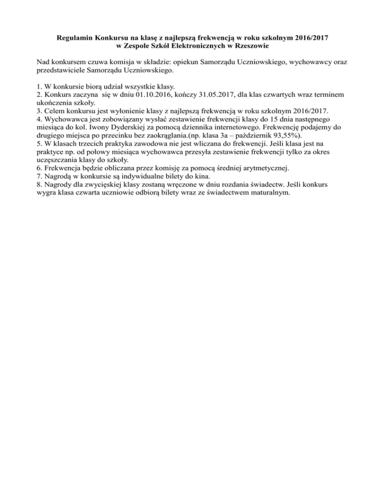 Regulamin Konkursu na klasę z najlepszą frekwencją w roku szkolnym 2016/2017 w Zespole Szkół Elektronicznych w Rzeszowie Nad konkursem czuwa komisja w składzie: opiekun Samorządu Uczniowskiego, wychowawcy oraz przedstawiciele Samorządu Uczniowskiego. 1. W konkursie biorą udział wszystkie klasy. 2. Konkurs zaczyna się w dniu 01.10.2016, kończy 31.05.2017, dla klas czwartych wraz terminem ukończenia szkoły. 3. Celem konkursu jest wyłonienie klasy z najlepszą frekwencją w roku szkolnym 2016/2017. 4. Wychowawca jest zobowiązany wysłać zestawienie frekwencji klasy do 15 dnia następnego miesiąca do kol. Iwony Dyderskiej za pomocą dziennika internetowego. Frekwencję podajemy do drugiego miejsca po przecinku bez zaokrąglania.(np. klasa 3a – październik 93,55%). 5. W klasach trzecich praktyka zawodowa nie jest wliczana do frekwencji. Jeśli klasa jest na praktyce np. od połowy miesiąca wychowawca przesyła zestawienie frekwencji tylko za okres uczęszczania klasy do szkoły. 6. Frekwencja będzie obliczana przez komisję za pomocą średniej arytmetycznej. 7. Nagrodą w konkursie są indywidualne bilety do kina. 8. Nagrody dla zwycięskiej klasy zostaną wręczone w dniu rozdania świadectw. Jeśli konkurs wygra klasa czwarta uczniowie odbiorą bilety wraz ze świadectwem maturalnym.