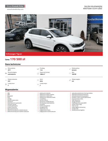SALON VOLKSWAGEN KROTOSKI-CICHY ŁÓDŹ Volkswagen Tiguan Cena: 170 500 zł Dane techniczne Rok produkcji: Przebieg: Rodzaj paliwa: 2017 1 km benzyna Skrzynia biegów: Pojemność silnika: Moc: automatyczna 1968 cm3 180 KM Rodzaj nadwozia: Kolor: Rodzaj nepędu: SUV biały 4x4 Liczba drzwi: Liczba miejsc: 5 5 Wyposażenie: ABS ASR Bluetooth DVD alufelgi asystent pasa ruchu autoalarm automatyczne wycieraczki centralny zamek czujnik parkowania czujnik zmierzchu dach panoramiczny elektrochromatyczne lusterka boczne elektrochromatyczne lusterko wsteczne elektryczne lusterka elektryczne szyby przednie elektryczne szyby tylne elektrycznie ustawiane fotele immobiliser kamera cofania kierownica wielofunkcyjna klimatyzacja automatyczna komputer kurtyny powietrzne nawigacja GPS odtwarzacz CD podgrzewane fotele podgrzewane lusterka boczne poduszka powietrzna chroniąca kolana poduszka powietrzna kierowcy poduszka powietrzna pasażera przednie i tylne czujniki parkowania przyciemniane szyby radio fabryczne relingi dachowe stabilizacja toru jazdy (ESP) system Start-Stop wejście aux wspomaganie kierownicy światła LED światła przeciwmgielne