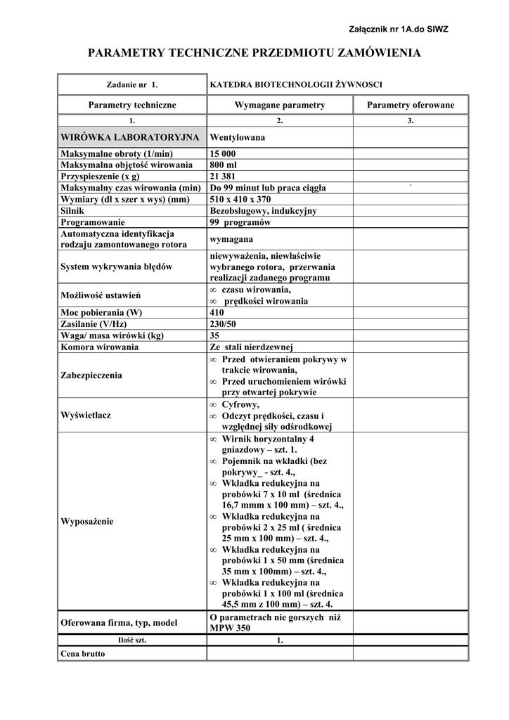 Załącznik nr 1A.do SIWZ PARAMETRY TECHNICZNE PRZEDMIOTU ZAMÓWIENIA Zadanie nr 1. KATEDRA BIOTECHNOLOGII śYWNOSCI Parametry techniczne Wymagane parametry Parametry oferowane 1. 2. 3. WIRÓWKA LABORATORYJNA Wentylowana Maksymalne obroty (1/min) Maksymalna objętość wirowania Przyspieszenie (x g) Maksymalny czas wirowania (min) Wymiary (dł x szer x wys) (mm) Silnik Programowanie Automatyczna identyfikacja rodzaju zamontowanego rotora 15 000 800 ml 21 381 Do 99 minut lub praca ciągła 510 x 410 x 370 Bezobsługowy, indukcyjny 99 programów System wykrywania błędów MoŜliwość ustawień Moc pobierania (W) Zasilanie (V/Hz) Waga/ masa wirówki (kg) Komora wirowania Zabezpieczenia Wyświetlacz WyposaŜenie Oferowana firma, typ, model Ilość szt. Cena brutto wymagana niewywaŜenia, niewłaściwie wybranego rotora, przerwania realizacji zadanego programu • czasu wirowania, • prędkości wirowania 410 230/50 35 Ze stali nierdzewnej • Przed otwieraniem pokrywy w trakcie wirowania, • Przed uruchomieniem wirówki przy otwartej pokrywie • Cyfrowy, • Odczyt prędkości, czasu i względnej siły odśrodkowej • Wirnik horyzontalny 4 gniazdowy – szt. 1. • Pojemnik na wkładki (bez pokrywy_ - szt. 4., • Wkładka redukcyjna na probówki 7 x 10 ml (średnica 16,7 mmm x 100 mm) – szt. 4., • Wkładka redukcyjna na probówki 2 x 25 ml ( średnica 25 mm x 100 mm) – szt. 4., • Wkładka redukcyjna na probówki 1 x 50 mm (średnica 35 mm x 100mm) – szt. 4., • Wkładka redukcyjna na probówki 1 x 100 ml (średnica 45,5 mm z 100 mm) – szt. 4. O parametrach nie gorszych niŜ MPW 350 1. ` Zadanie nr 2. KATEDRA UPRAWY ROLI I I NAWOśENIA ROLIN OGRODNICZYCH Parametry techniczne Wymagane parametry Parametry oferowane 1. 2. 3. SUSZARKA LABORATORYJNA • Szerokość (od-do): 760 – 1020, • Głębokość (od-do): 710 – 790, • Wysokość (od-do): 1300 – 2000. • Szerokość (od-do): 400 - 800, Wymiary komory roboczej (mm) • Głębokość (od-do): 500-550, • Wysokość (od-do): 1000 – 1600. Materiał wykonania komory Stal nierdzewna roboczej Pojemność komory roboczej Nie mniejsza niŜ 400 a nie większa niŜ (dcm3) 500 Obieg powietrza Wymuszony Od minimum 10oC (nie więcej niŜ 10oC) o Zakres temperatury ( C) powyŜej temperatury otoczenia do minimum 250oC Regulacja temperatury Co 1oC Czas osiągnięcia maksymalnej Około 58 min temperatury Nie większe niŜ ± 5oC przy zadanej Odchyłki temperatury temperaturze Moc grzałek Nie mniejsza niŜ 3,5 kW Regulator temperatury z Regulator temperatury wyświetlaczem Program czasu suszenia wymagany Programowalny cykl pracy w wymagany funkcji czasu i temperatury Drzwi Pełne Ilość półek Minimum 5 szt. Zabezpieczenia przed NiezaleŜny termostat przegrzaniem Maksymalny pobór mocy Nie większy niŜ 6 kW Moc znamionowa Nie mniejsza niŜ 3,5 kW O parametrach nie gorszych niŜ Oferowana firma, typ, model Venticell 404 lub PolEko SLW STD 400 Wymiary zewnętrzne (mm) Ilość szt. Cena brutto 1. Zadanie nr 3. KATEDRA ROZRODU I ANATOMII ZWIERZĄT Parametry techniczne Wymagane parametry Parametry oferowane 1. 2. 3. MIKROSKOP LABORATORYJNY Obserwacja Okulary Nasadka Obiektywy Ogniskowanie Miska rewolwerowa Oświetlenie Statyw Stolik Kondensor WyposaŜenie dodatkowe Oferowana firma, typ, model Ilość szt. Cena brutto Jasne pole • Szerokopolowe EWF 10x / 20 mm, • Do obserwacji w okularach, • binokularna, • Z regulacją rozstawu źrenic 55 – 75 mm i dioptryjna w zakresie ± 6 dioptrii, • Obrót 360 stopni. • achromat • 4x , 10 x, 40, 100 x// immersja/ • ergonomiczny układ współosiowy pokręteł mechanizmu ogniskującego mikro-makro z regulacją siły nacisku, • prawa strona mikroskopu z hamulcem połoŜenia preparatu w osi Z • cztero-gniazdowa • skierowana do wewnątrz • halogenowe 20 W z płynną regulacją jasności, • wyłącznik sieciowy i potencjometr obrotowy z prawej strony mikroskopu, • gniazdko sieciowe i bezpiecznikowe z tyłu mikroskopu – szt. 2., • wbudowany w podstawę transformator 220 – 240 V/ 50- 60 Hz ;0,5 A, • łatwy dostęp do Ŝarówki z przodu mikroskopu Wymiary 170 x 140 x 280 mm • krzyŜowy dla dwóch preparatów, • wymiary; 141 x 132 mm, • przesuw 54 x 78 mm • z krótkim mechanizmem koaxialnym przesuwu XY • Abbego N.A. 1.25 do jasnego pola, • Z mechanizmem ruchu pionowego. • Zapasowa Ŝarówka halogenowa, • Olejek immersyjny O parametrach nie gorszych niŜ Micro N 180 1. Zadanie nr 4. ZAKŁAD MECHANIKI GRUNTÓW I BUDOWNICTWA ZIEMNEGO Parametry techniczne Wymagane parametry Parametry oferowane 1. 2. 3. WAGA HAKOWA Obudowa Wyświetlacz Wymiary Wysokość całkowita wagi Masa własna wagi Wyłącznik zasilania Zakres Odczyt ObciąŜenie minimalne Zakres tarowania Klasa dokładności Temperatura pracy Czas waŜenia Zasilanie wewnętrzne Zasilanie zewnętrzne Czas pracy z zasilaniem wewnętrznym Złącze Czas ładowania akumulatora Legalizacja Oferowana firma, typ, model Ilość szt. Cena brutto metalowa LCD Nie więcej niŜ 200x200x100 mm Nie więcej niŜ 600 mm Nie więcej niŜ 5 kg automatyczny 15 kg 5g 100 g W całym zakresie tzn. do 15 kg III - 10oC do + 40oC <5s Akumulator lub baterie AC: 230 V 50 Hz, DC 12V 500mA > 10 godzin RS232 C < 3 godz. wymagana O parametrach nie gorszych niŜ B15S 1. Zadanie nr 5. ZAKŁAD MECHANIKI GRUNTÓW I BUDOWNICTWA ZIEMNEGO Parametry techniczne Wymagane parametry Parametry oferowane 1. 2. 3. WAGA HAKOWA Obudowa Wyświetlacz Wymiary Wysokość całkowita wagi Masa własna wagi Wyłącznik zasilania Zakres Odczyt ObciąŜenie minimalne Zakres tarowania Klasa dokładności Temperatura pracy Czas waŜenia Zasilanie wewnętrzne Zasilanie zewnętrzne Czas pracy z zasilaniem wewnętrznym Złącze Czas ładowania akumulatora Legalizacja Oferowana firma, typ, model Ilość szt. Cena brutto metalowa LCD Nie więcej niŜ 200x200x100 mm Nie więcej niŜ 600 mm Nie więcej niŜ 5 kg automatyczny 15 kg 5g 100 g W całym zakresie (do 1