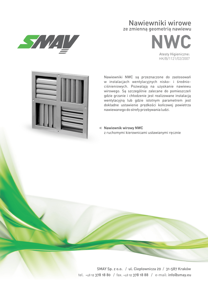 Nawiewniki wirowe ze zmienn¹ geometri¹ nawiewu NWC Atesty Higieniczne: HK/B/1121/02/2007 Nawiewniki NWC s¹ przeznaczone do zastosowañ w instalacjach wentylacyjnych nisko- i œredniociœnieniowych. Pozwalaj¹ na uzyskanie nawiewu wirowego. S¹ szczególnie zalecane do pomieszczeñ gdzie grzanie i ch³odzenie jest realizowane instalacj¹ wentylacyjn¹ lub gdzie istotnym parametrem jest dok³adne ustawienie prêdkoœci koñcowej powietrza nawiewanego do strefy przebywania ludzi. Nawiewnik wirowy NWC z ruchomymi kierownicami ustawianymi rêcznie SMAY Sp. z o.o. / ul. Ciep³ownicza 29 / 31-587 Kraków tel. +48 12 378 18 80 / fax. +48 12 378 18 88 / e-mail: [email protected] Nawiewniki NWC Wykonanie Nawiewniki NWC s¹ wyposa¿one w 4 zespo³y ruchomych kierownic, wykonanych z aluminium. Ramka nawiewnika wykonana jest z profili stalowych. Ca³oœæ jest lakierowana proszkowo na kolor bia³y RAL9010. Na zamówienie mo¿liwe jest lakierowanie na inny kolor RAL. Regulacja po³o¿enia kierownic Regulacji dokonuje siê poprzez ustawienie osobno ka¿dego z 4 zespo³ów zintegrowanych ze sob¹ kierownic. Zmianê k¹ta ustawienia jednego zespo³u kierownic uzyskuje siê poprzez ustawienie w ¿¹danej pozycji jednej z kierownic tego zespo³u. Mo¿liwe jest ustawienie ka¿dego zespo³u kierownic pod ró¿nym k¹tem. Konstrukcja ramki i kierownic Monta¿ Ramki i kierownice anemostatów przedstawiono na rysunku poni¿ej. Anemostaty mo¿na montowaæ do przegrody poprzez otwory w ramce anemostatu. Wymiary, powierzchnie czynne, masa nawiewników C Aeff Aeff nawiew poziomy nawiew pionowy Masa [mm] m2 m2 kg 380 560 740 980 0,032 0,080 0,60 0,072 0,190 1,67 0,129 0,352 3,20 0,228 0,640 6,45 B = C +45 mm Gdzie: C - szerokoœæ otworu monta¿owego Aeff - powierzchnia czynna w m2 Masa - waga urz¹dzenia w kg 498 wersja 5.2.6 Dobór Oznaczenia: Vt [m3/h] A, B [m] H1 [m] Vh1 [m/s] L [m] VL [m/s] D tZ [Ê] D tL [Ê] D p [Ðà] Lw [dB(A)] Veff [m/s] Aeff [m2] wersja 5.2.6 ca³kowity przep³yw powietrza odleg³oœci miêdzy nawiewnikami wysokoœæ od sufitu do strefy przebywania ludzi prêdkoœæ powietrza na wysokoœci H1 zasiêg strumienia powietrza prêdkoœæ powietrza w odleg³oœci L ró¿nica temperatur powietrza nawiewanego i temperatury powietrza w pomieszczeniu ró¿nica temperatur powietrza w pomieszczeniu i temperatury powietrza nawiewanego w odleg³oœci L, gdzie: L = A/2 +H1 lub L = B/2 +H1 lub L = X +H1 miejscowe straty ciœnienia poziom mocy akustycznej efektywna prêdkoœæ wyp³ywu efektywna powierzchnia nawiewnika 499 Dobór NWC Maksymalny zasiêg strugi nastawa kierownic 60° Rozmiar Rozmiar nastawa kierownic 45° 500 nastawa kierownic 90° Rozmiar Rozmiar nastawa kierownic 75° wersja 5.2.6 Dobór NWC Rozk³ad prêdkoœci powietrza w zale¿noœci od zasiêgu strumienia w kierunku A, B Wielkoœæ 380 Wielkoœæ 740 wersja 5.2.6 Wielkoœæ 560 Wielkoœæ 980 501 Dobór NWC Rozk³ad prêdkoœci powietrza w zale¿noœci od zasiêgu strumienia w kierunku H 502 Wielkoœæ 380 Wielkoœæ 560 Wielkoœæ 740 Wielkoœæ 980 wersja 5.2.6 Dobór NWC Strata ciœnienia i moc aksutyczna Wielkoœæ 380 Wielkoœæ 560 Przy³¹cze boczne Przy³¹cze boczne Przy³¹cze górne Przy³¹cze górne Wielkoœæ 980 Wielkoœæ 740 Przy³¹cze boczne Przy³¹cze boczne Przy³¹cze górne wersja 5.2.6 Przy³¹cze górne 503 Akcesoria i sposób zamówienia NWC Przy zamówieniu nale¿y podaæ informacje wed³ug poni¿szego sposobu: NWC - <C> - SL<RAL> / <ADD> Gdzie: <C> SL <RAL> <ADD> - rozmiar nawiewnika, szerokoœæ otworu monta¿owego w mm - wykoñczenie: ramka stalowa i kierownice aluminiowe, lakierowane - kolor wg palety RAL * - w tym miejscu nale¿y okreœliæ akcesoria dodatkowe jak poni¿ej: Akcesoria ** Skrzynka rozprê¿na wg konfiguracji jak poni¿ej: <SR><I>-<H>-<K><D><R> <I> - izolacja: brak = brak izolacji t = izolowana <H> - wysokoœæ skrzynki w mm * <K> - po³o¿enie króæca: b = boczne g = górne <D> - œrednica króæca przy³¹czeniowego w mm * <R> - przepustnica w króæcu przy³¹czeniowym: brak = brak przepustnicy, P = przepustnica z regulacj¹ z zewn¹trz skrzynki * wartoœci opcjonalne, w przypadku ich nie podania zostan¹ zastosowane wartoœci domyœlne ** wiêcej informacji o akcesoriach na stronie 621 Przyk³ad zamówienia: NWC – 380 – SL9010 / SRt – 330 – b200P 504 wersja 5.2.6
