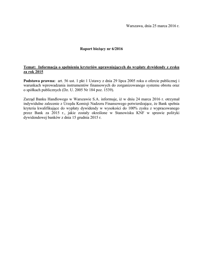 Warszawa, dnia 25 marca 2016 r. Raport bieżący nr 6/2016 Temat: Informacja o spełnieniu kryteriów uprawniających do wypłaty dywidendy z zysku za rok 2015 Podstawa prawna: art. 56 ust. 1 pkt 1 Ustawy z dnia 29 lipca 2005 roku o ofercie publicznej i warunkach wprowadzania instrumentów finansowych do zorganizowanego systemu obrotu oraz o spółkach publicznych (Dz. U. 2005 Nr 184 poz. 1539). Zarząd Banku Handlowego w Warszawie S.A. informuje, iż w dniu 24 marca 2016 r. otrzymał indywidulne zalecenie z Urzędu Komisji Nadzoru Finansowego potwierdzające, że Bank spełnia kryteria kwalifikujące do wypłaty dywidendy w wysokości do 100% zysku z wypracowanego przez Bank za 2015 r., jakie zostały określone w Stanowisku KNF w sprawie polityki dywidendowej banków z dnia 15 grudnia 2015 r.
