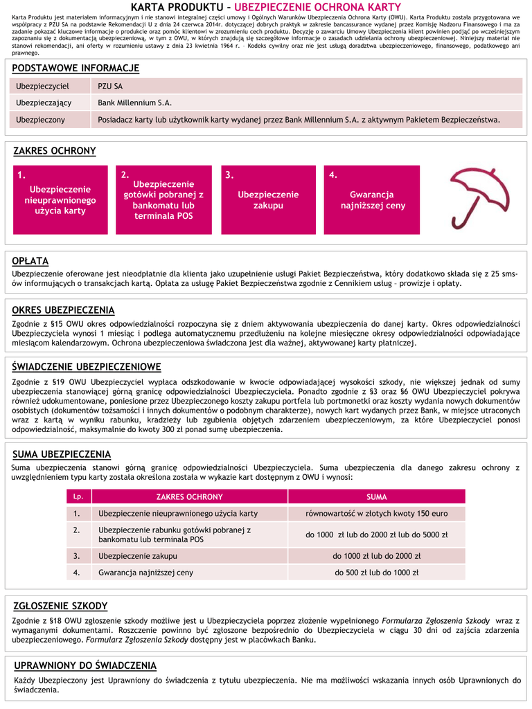 KARTA PRODUKTU – UBEZPIECZENIE OCHRONA KARTY Karta Produktu jest materiałem informacyjnym i nie stanowi integralnej części umowy i Ogólnych Warunków Ubezpieczenia Ochrona Karty (OWU). Karta Produktu została przygotowana we współpracy z PZU SA na podstawie Rekomendacji U z dnia 24 czerwca 2014r. dotyczącej dobrych praktyk w zakresie bancassurance wydanej przez Komisję Nadzoru Finansowego i ma za zadanie pokazać kluczowe informacje o produkcie oraz pomóc klientowi w zrozumieniu cech produktu. Decyzję o zawarciu Umowy Ubezpieczenia klient powinien podjąć po wcześniejszym zapoznaniu się z dokumentacją ubezpieczeniową, w tym z OWU, w których znajdują się szczegółowe informacje o zasadach udzielania ochrony ubezpieczeniowej. Niniejszy materiał nie stanowi rekomendacji, ani oferty w rozumieniu ustawy z dnia 23 kwietnia 1964 r. – Kodeks cywilny oraz nie jest usługą doradztwa ubezpieczeniowego, finansowego, podatkowego ani prawnego. PODSTAWOWE INFORMACJE Ubezpieczyciel PZU SA Ubezpieczający Bank Millennium S.A. Ubezpieczony Posiadacz karty lub użytkownik karty wydanej przez Bank Millennium S.A. z aktywnym Pakietem Bezpieczeństwa. ZAKRES OCHRONY 2. 1. Ubezpieczenie gotówki pobranej z bankomatu lub terminala POS Ubezpieczenie nieuprawnionego użycia karty 4. 3. Ubezpieczenie zakupu Gwarancja najniższej ceny OPŁATA Ubezpieczenie oferowane jest nieodpłatnie dla klienta jako uzupełnienie usługi Pakiet Bezpieczeństwa, który dodatkowo składa się z 25 smsów informujących o transakcjach kartą. Opłata za usługę Pakiet Bezpieczeństwa zgodnie z Cennikiem usług – prowizje i opłaty. OKRES UBEZPIECZENIA Zgodnie z §15 OWU okres odpowiedzialności rozpoczyna się z dniem aktywowania ubezpieczenia do danej karty. Okres odpowiedzialności Ubezpieczyciela wynosi 1 miesiąc i podlega automatycznemu przedłużeniu na kolejne miesięczne okresy odpowiedzialności odpowiadające miesiącom kalendarzowym. Ochrona ubezpieczeniowa świadczona jest dla ważnej, aktywowanej karty płatniczej. ŚWIADCZENIE UBEZPIECZENIOWE Zgodnie z §19 OWU Ubezpieczyciel wypłaca odszkodowanie w kwocie odpowiadającej wysokości szkody, nie większej jednak od sumy ubezpieczenia stanowiącej górną granicę odpowiedzialności Ubezpieczyciela. Ponadto zgodnie z §3 oraz §6 OWU Ubezpieczyciel pokrywa również udokumentowane, poniesione przez Ubezpieczonego koszty zakupu portfela lub portmonetki oraz koszty wydania nowych dokumentów osobistych (dokumentów tożsamości i innych dokumentów o podobnym charakterze), nowych kart wydanych przez Bank, w miejsce utraconych wraz z kartą w wyniku rabunku, kradzieży lub zgubienia objętych zdarzeniem ubezpieczeniowym, za które Ubezpieczyciel ponosi odpowiedzialność, maksymalnie do kwoty 300 zł ponad sumę ubezpieczenia. SUMA UBEZPIECZENIA Suma ubezpieczenia stanowi górną granicę odpowiedzialności Ubezpieczyciela. Suma ubezpieczenia dla danego zakresu ochrony z uwzględnieniem typu karty została określona została w wykazie kart dostępnym z OWU i wynosi: ZAKRES OCHRONY Lp. SUMA 1. Ubezpieczenie nieuprawnionego użycia karty równowartość w złotych kwoty 150 euro 2. Ubezpieczenie rabunku gotówki pobranej z bankomatu lub terminala POS do 1000 zł lub do 2000 zł lub do 5000 zł 3. Ubezpieczenie zakupu do 1000 zł lub do 2000 zł 4. Gwarancja najniższej ceny do 500 zł lub do 1000 zł ZGŁOSZENIE SZKODY Zgodnie z §18 OWU zgłoszenie szkody możliwe jest u Ubezpieczyciela poprzez złożenie wypełnionego Formularza Zgłoszenia Szkody wraz z wymaganymi dokumentami. Roszczenie powinno być zgłoszone bezpośrednio do Ubezpieczyciela w ciągu 30 dni od zajścia zdarzenia ubezpieczeniowego. Formularz Zgłoszenia Szkody dostępny jest w placówkach Banku. UPRAWNIONY DO ŚWIADCZENIA Każdy Ubezpieczony jest Uprawniony do świadczenia z tytułu ubezpieczenia. Nie ma możliwości wskazania innych osób Uprawnionych do świadczenia. WYŁĄCZENIA ODPOWIEDZIALNOŚCI Istnieją sytuacje, w których Ubezpieczyciel nie ponosi odpowiedzialności za zaistniałe zdarzenia ubezpieczeniowe. Pełna lista wyłączeń znajduje się w §4, §7, §10 i §13 OWU. Poniżej znajdują się jedynie przykłady wyłączeń odpowiedzialności Ubezpieczyciela: • gdy posiadacz karty lub użytkownik karty pozostawił kartę bez zabezpieczenia w ogólnie dostępnym miejscu publicznym, • szkody wyrządzone umyślnie lub wskutek rażącego niedbalstwa posiadacza, użytkownika karty, • powstałe z winy umyślnej osoby, z którą Ubezpieczony będący osobą fizyczną pozostaje we wspólnym gospodarstwie domowym. ZGŁASZANIE REKLAMACJI I SKARG Zgłaszanie reklamacji jest możliwe bezpośrednio u Ubezpieczyciela. Reklamacje w zakresie ubezpieczenia lub w zakresie czynności Banku jako Ubezpieczającego, mogą być składane w Banku: • w formie pisemnej (w dowolnej placówce Banku; listownie na adres siedziby Banku (ul. Stanisława Żaryna 2A, 02-593 Warszawa), z dopiskiem Reklamacje; za pośrednictwem Millenet), • w formie ustnej (podczas wizyty w placówce Banku; za pośrednictwem Centrum Obsługi Telefonicznej). W przypadku, gdy reklamacja dotyczy ubezpieczenia, Bank przekazuje niezwłocznie daną reklamację do Ubezpieczyciela. W przypadku, gdy reklamacja dotyczy czynności Banku jako Ubezpieczającego, reklamacje rozpatrywane są przez Bank w terminie 30 dni od dnia ich wpływu. W szczególnie skomplikowanym przypadku termin rozpatrzenia reklamacji może ulec wydłużeniu nie więcej niż do 60 dni od dnia jej wpływu, gdy rozpatrzenie reklamacji i udzielenie odpowiedzi nie jest możliwe w terminie 30 dni. W takim przypadku Ubezpieczyciel lub Bank powiadomi osobę zgłaszającą o wydłużeniu okresu rozpatrzenia, ze wskazaniem przewidywanego terminu udzielenia odpowiedzi, przyczyny opóźnienia, okoliczności, które muszą być ustalone. Odpowiedź na reklamację przekazywana jest osobie, która ją złożyła w formie pisemnej bądź za pomocą innego trw